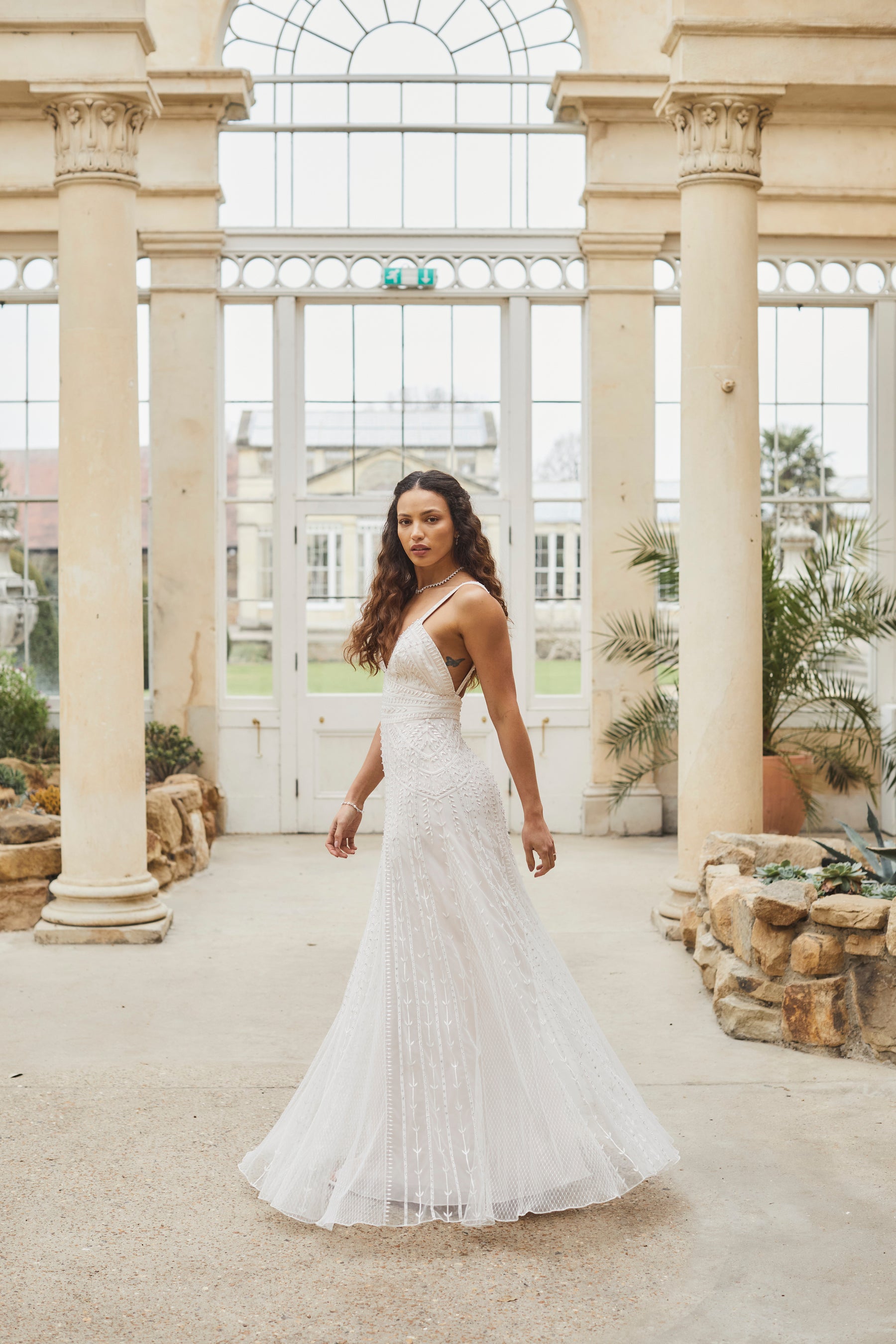 This charming and feminine gown is embroidered with delicate tonal stitchwork, tulle rouleaux and touches of sparkling beadwork, in a linear design which elongates and flatters the body. Lined in a seashell pink lining, to highlight the sheerness and intricacy of the artwork, the skirt of the dress is panelled with lattice tulle godets to complete the ethereal effect. The gown is designed to be layered with it’s matching Chiara Coat, a key concept this Bridal season, as we introduce a new range of beautiful Bridal cover up options. Layered together, the two pieces offer an enchanting lightness and delicacy.