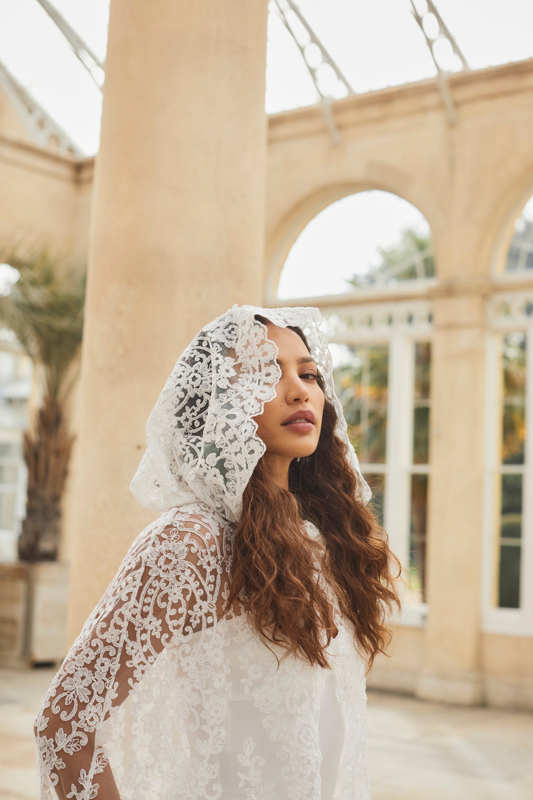The Aralia Cape is a standout piece this season, offering a bold and romantic Bridal look. This striking European corded lace cape is edged throughout with the beautiful scallop of the fabric and cut in a full silhouette which drapes from the shoulder and cascades in tiers to the floor. The dramatic cape is finished with a stunning hood, which is also finished with lace scallop to frame the face. With a crystal button at the neck, this piece can be worn as a new alternative to a veil and makes a bold statement for a modern romantic bride.