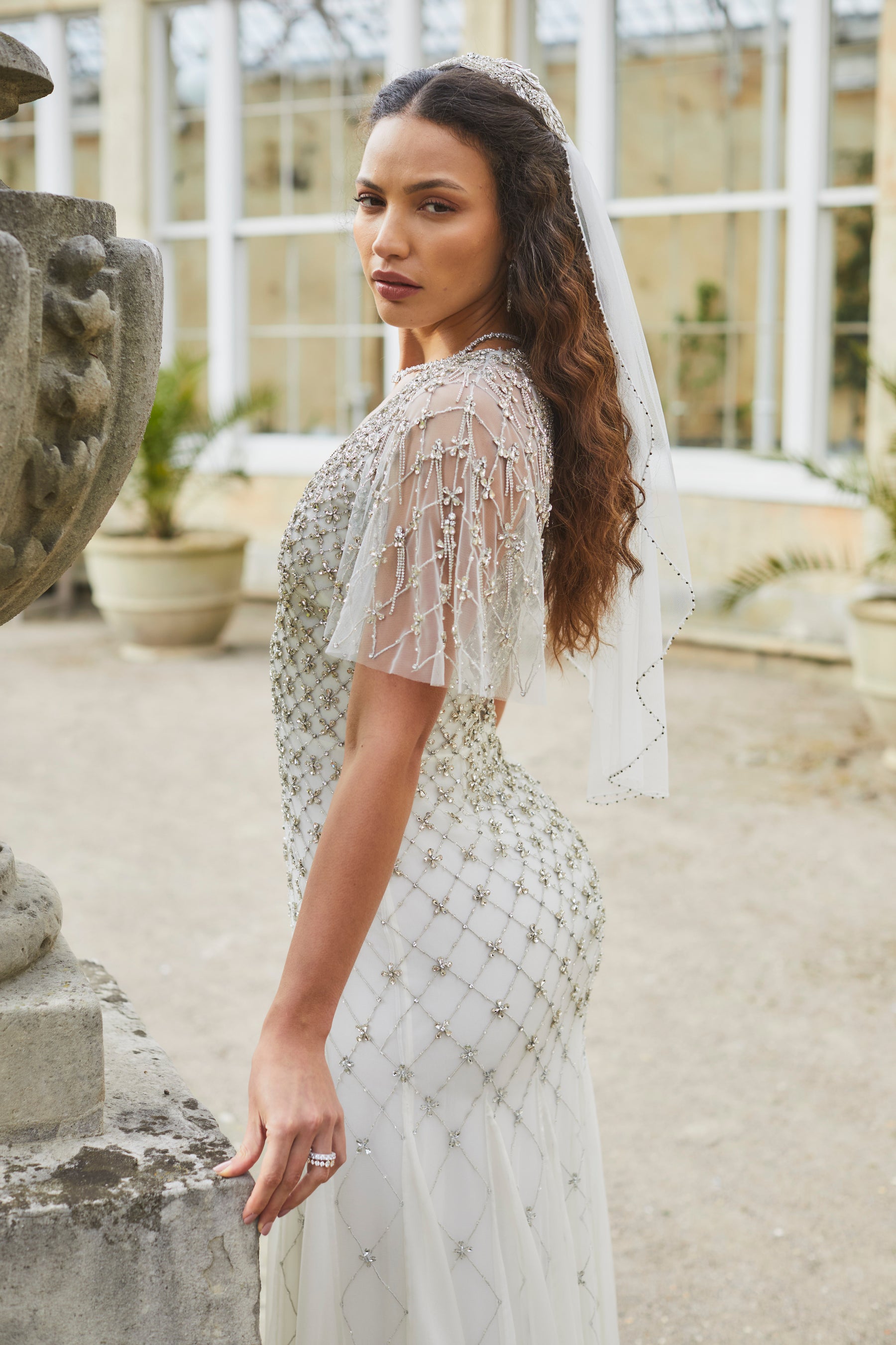 This truly stunning gown is a magical and dazzling statement piece. Embellished on tulle, a silver thread satin stitch lattice is engineered to the body and encrusted with silver lined stones and teardrop crystals. A fine crystal chain is used to edge the neckline and in sparkling tassels which adorn the shoulders, adding a shimmering movement. The skirt is panelled with diaphanous silk chiffon godets, to give a beautiful lightness to this extraordinary gown.