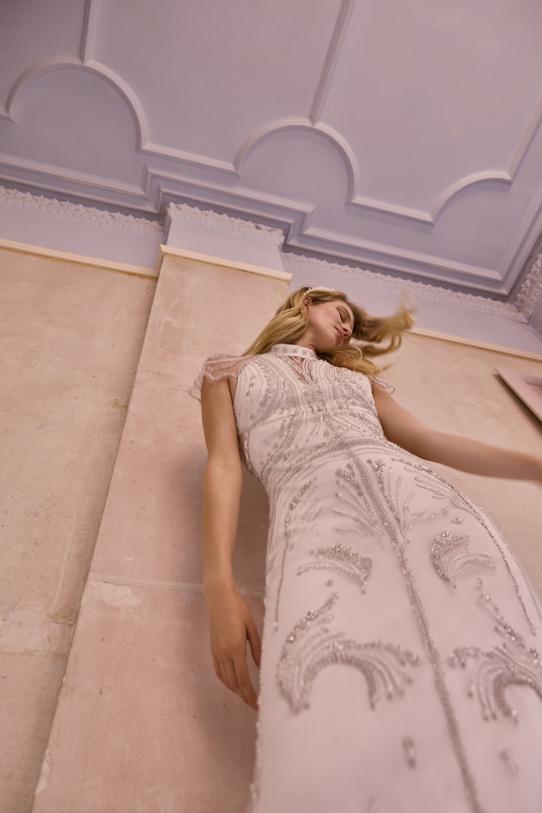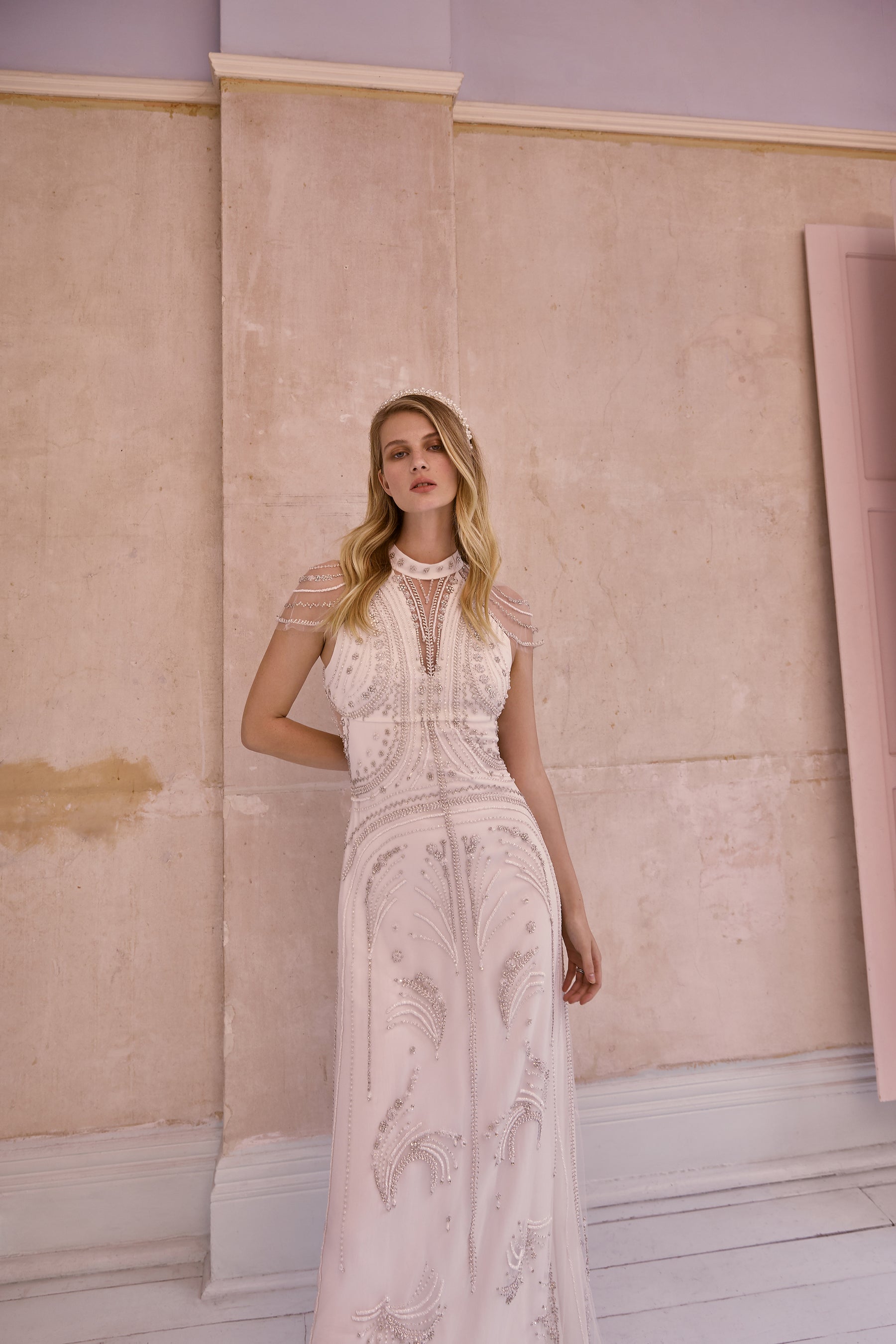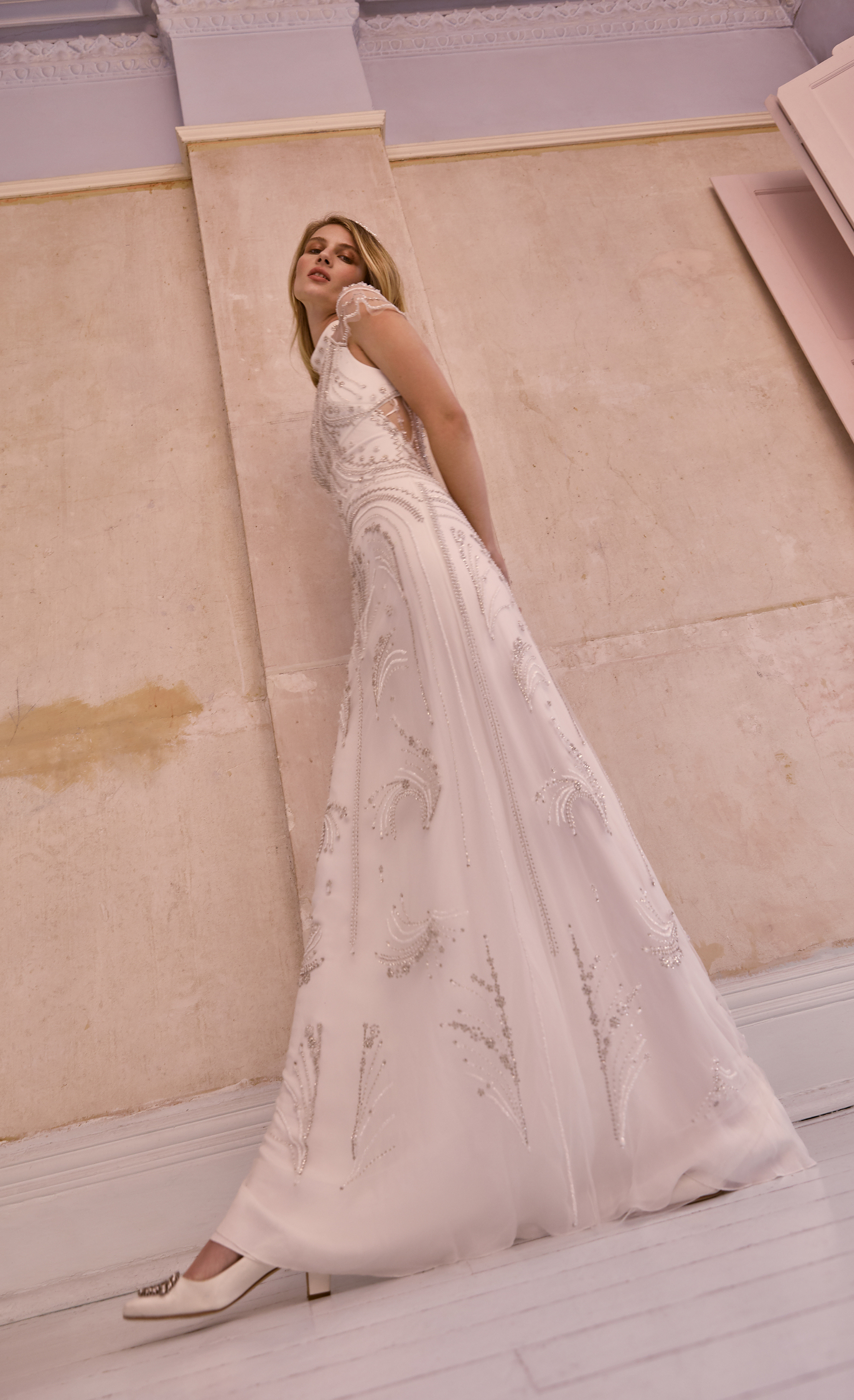 The slim-fitting silhouette, which features the back and shoulders adorned with rows of crystal beading, is a modern take on a classic 1930s open-back gown.