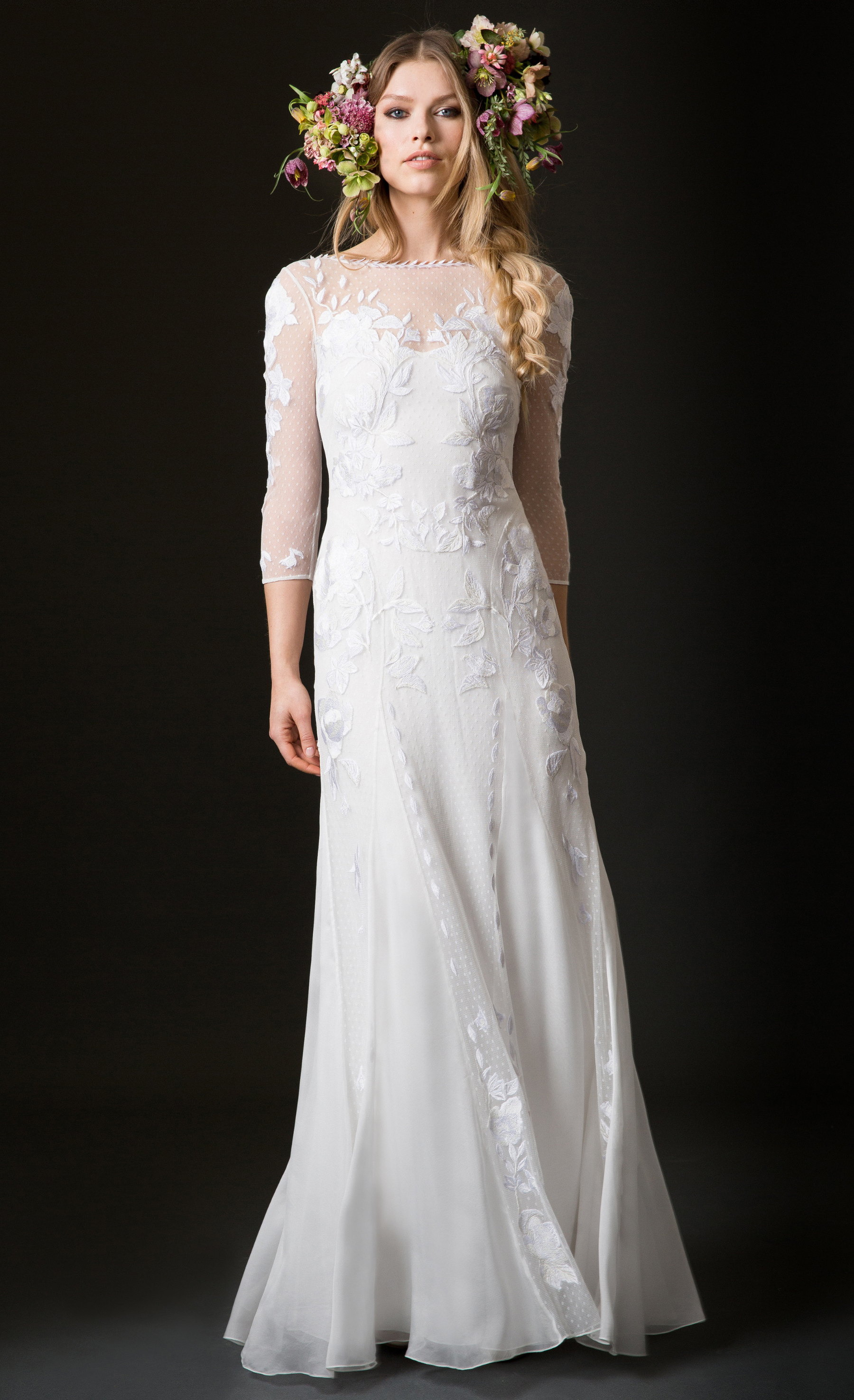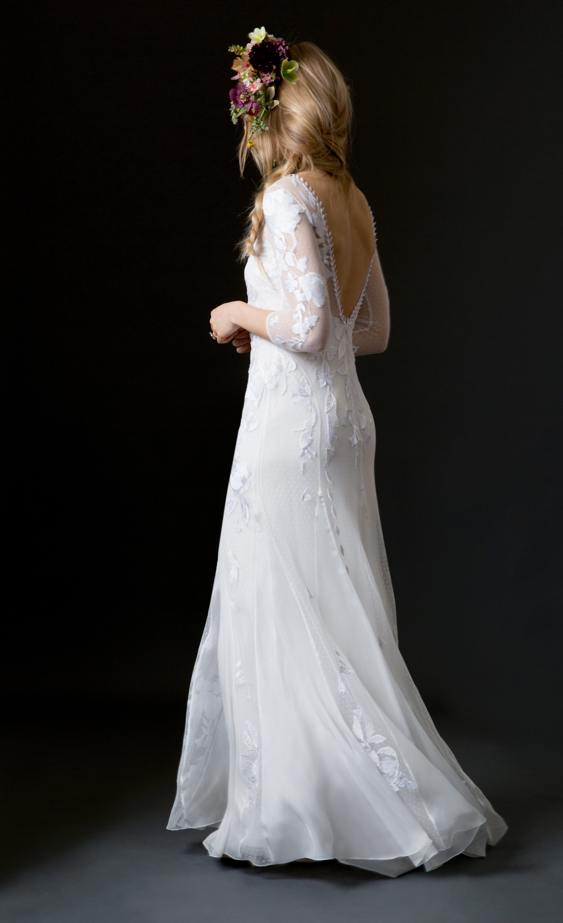 Crafted with carefully designed panels of vintage double scallop lace, fine silk chiffon and silk crepe de-chine to cleverly accentuate and elongate the bride’s silhouette, a v neckline, chiffon sash waist tie and softly fluted silk chiffon sleeves make this dress effortlessly romantic and easy to wear.