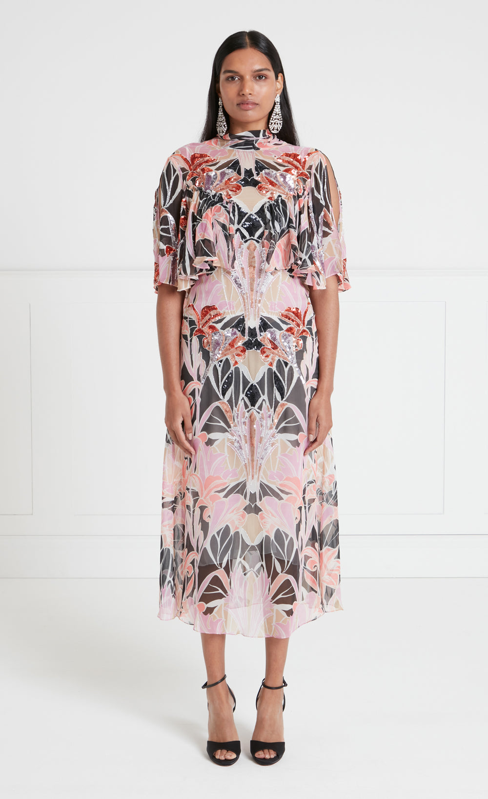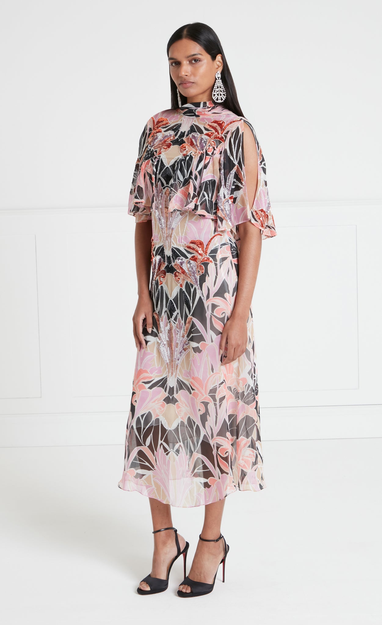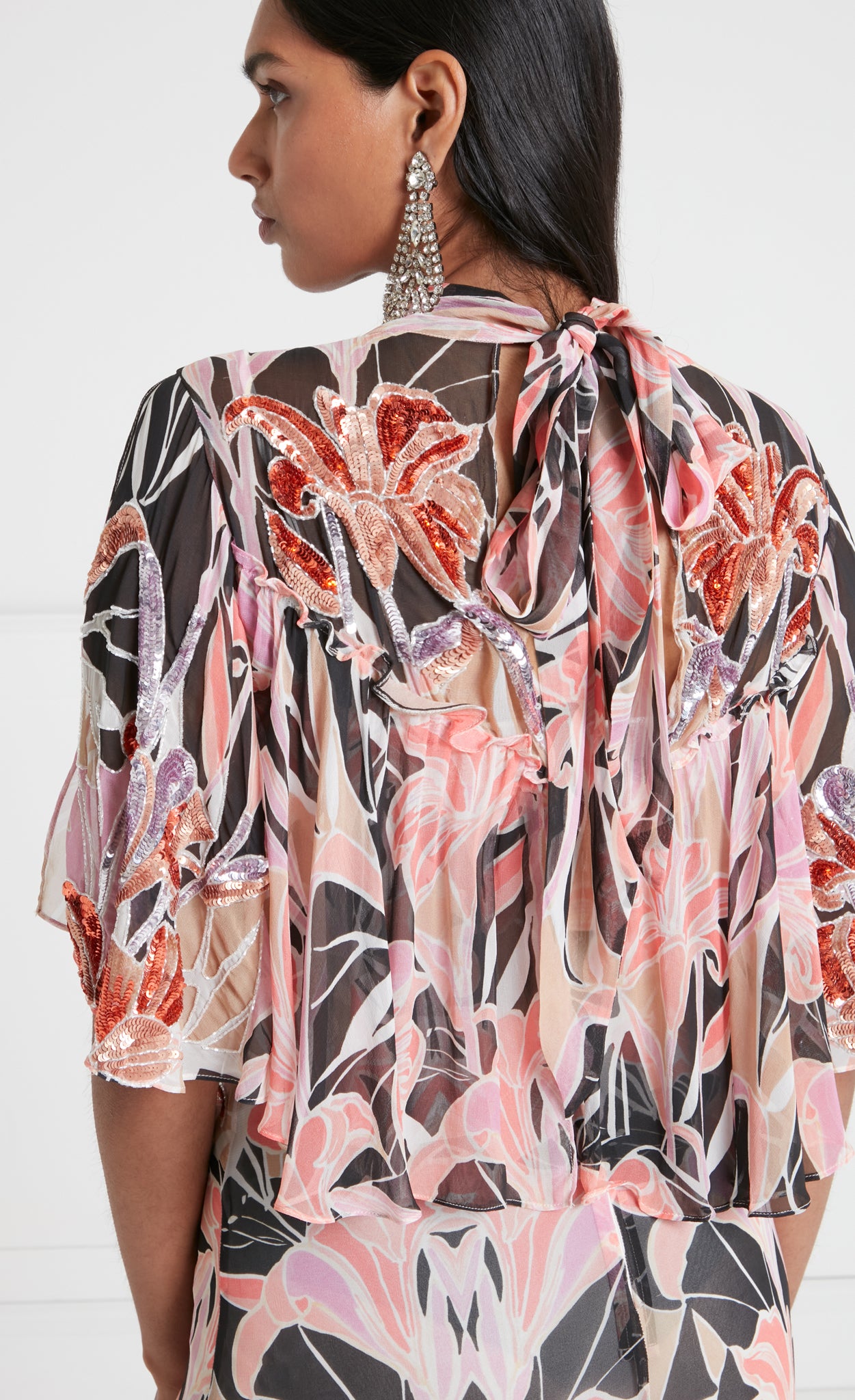 The semi-sheer printed georgette features an original artwork, hand-painted in-house. Meticulously engineered for composition and seamless flow, it is draped onto toile and placed on full-scale garment patterns. The sequins are hand-embroidered by artisans.