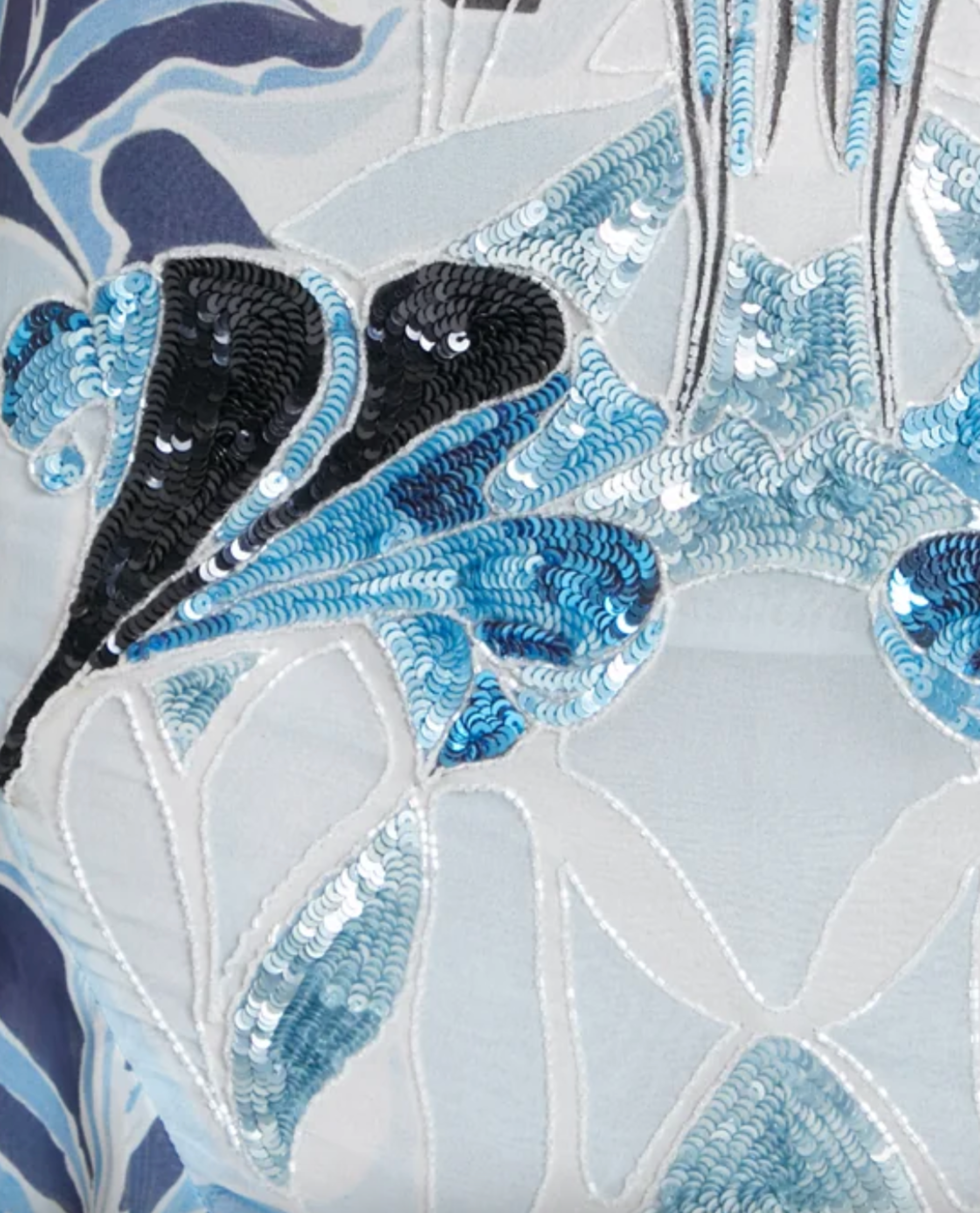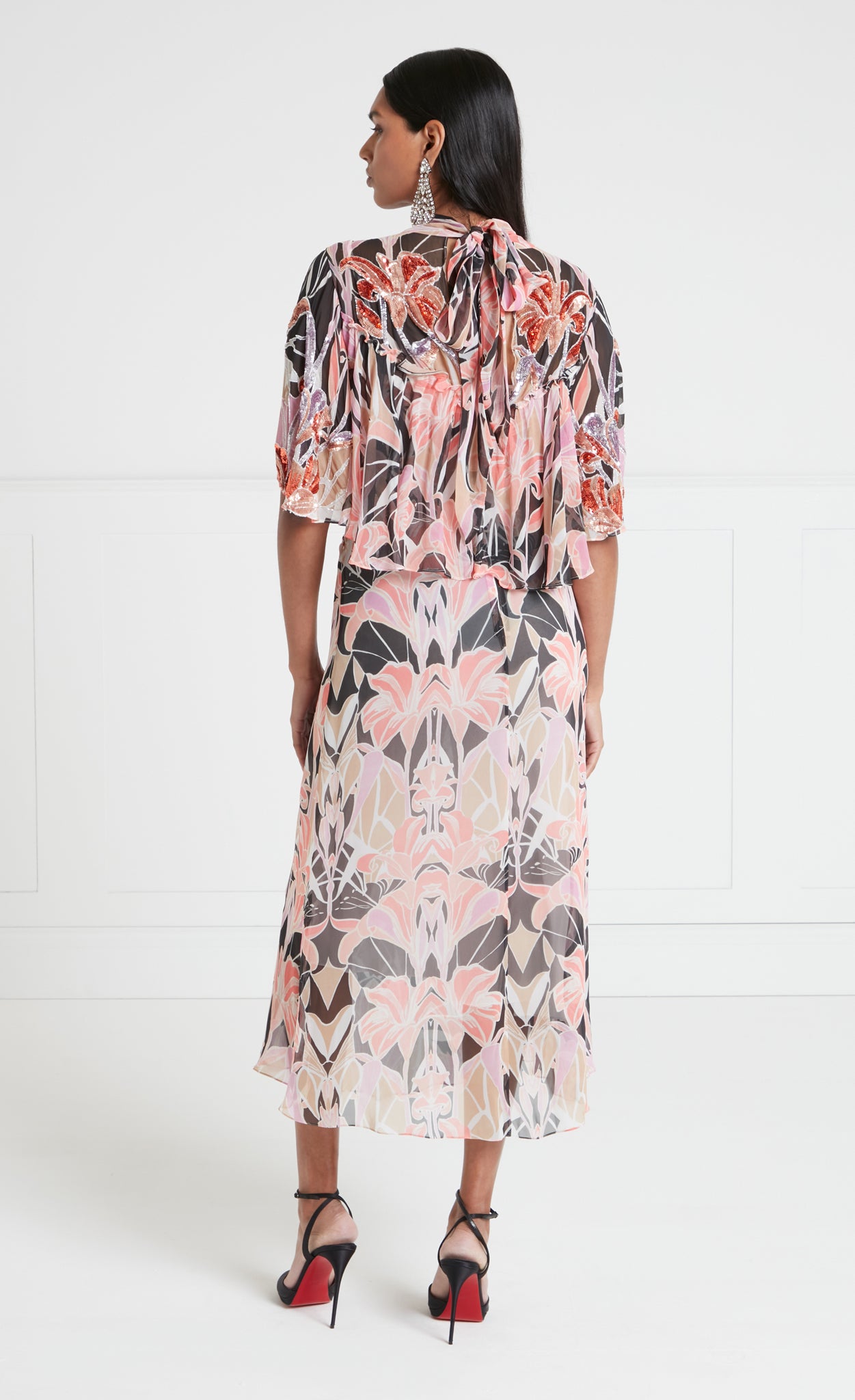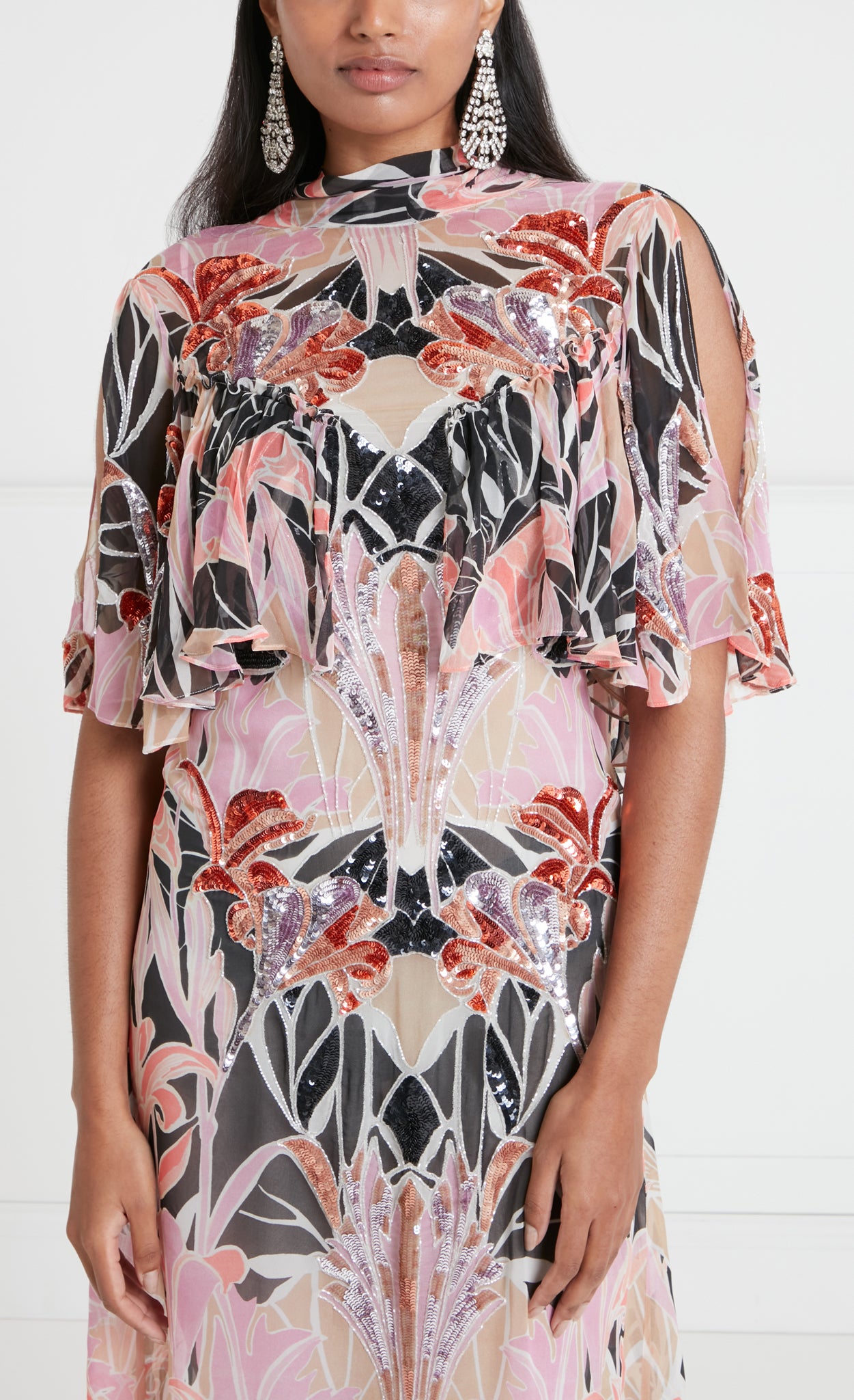 The semi-sheer printed georgette features an original artwork, hand-painted in-house. Meticulously engineered for composition and seamless flow, it is draped onto toile and placed on full-scale garment patterns. The sequins are hand-embroidered by artisans.