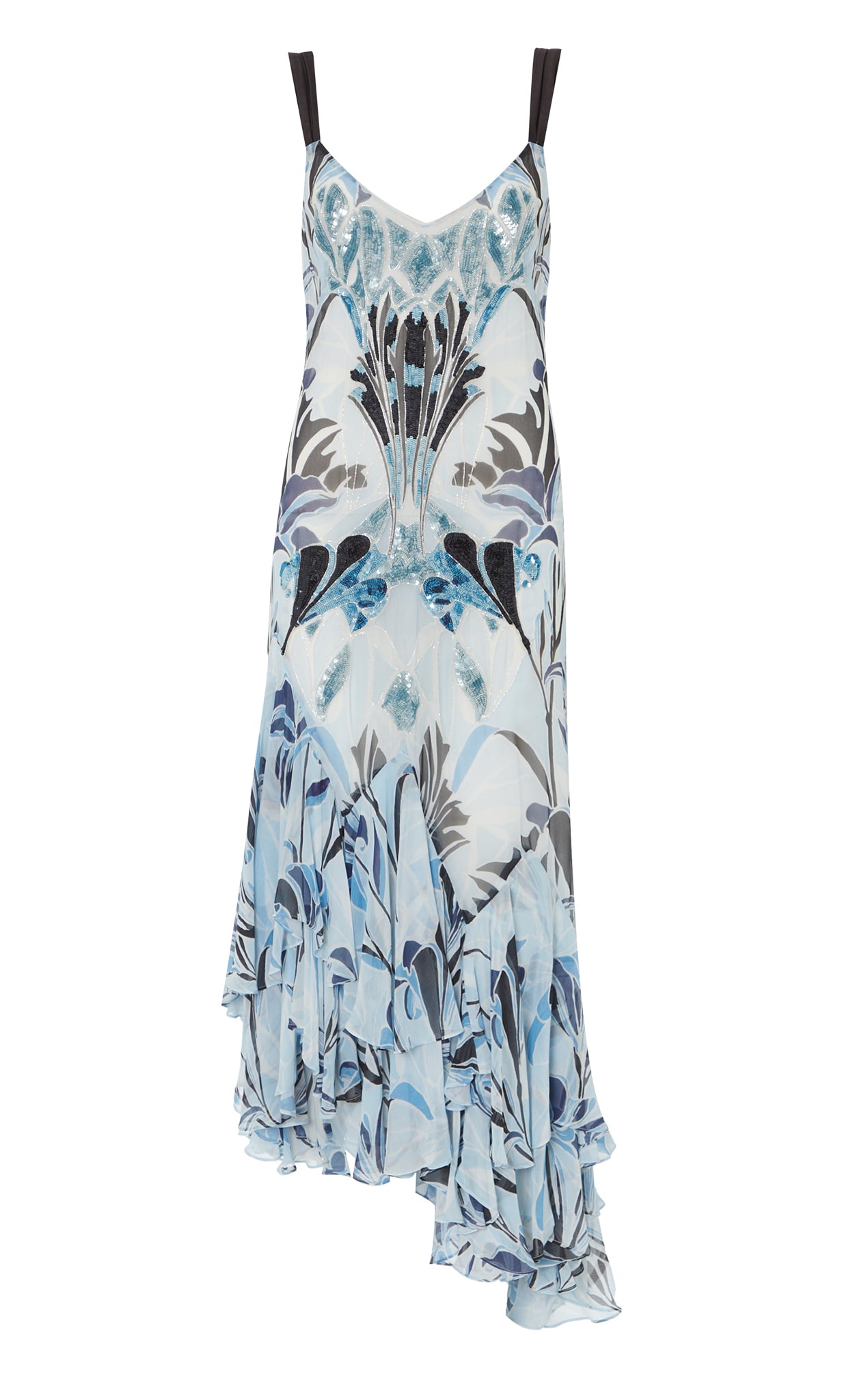 The Alani Ruffle Dress is a slip-style silhouette with a fluid, asymmetric ruffle skirt crafted from a semi-sheer, printed georgette. Blending modern design with the... More.