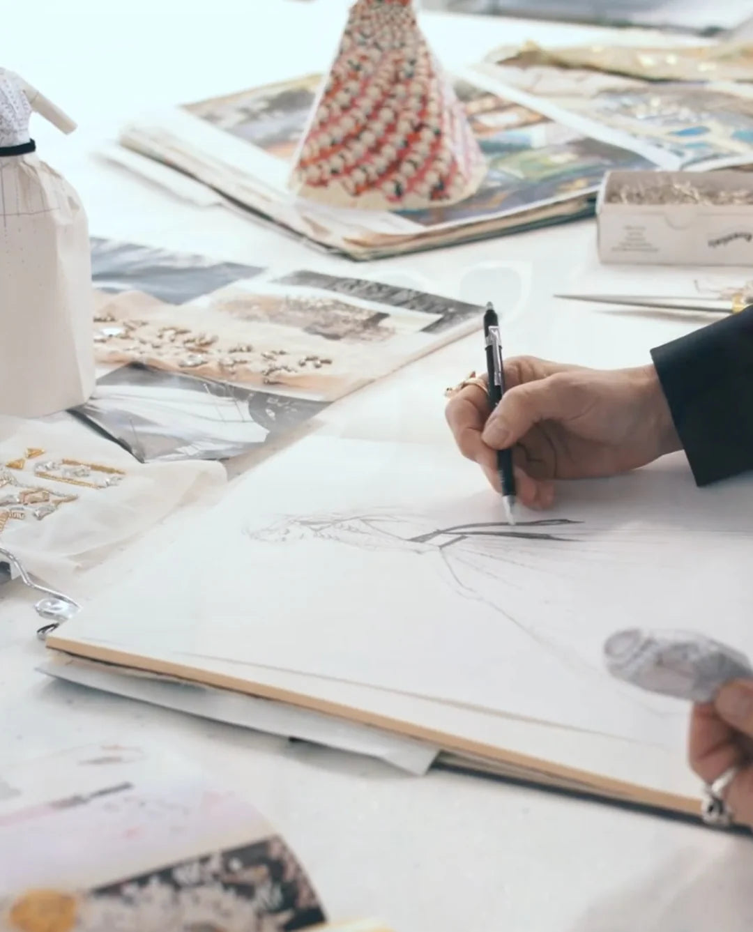 Offbeat yet regal, the Alessia story offers a stunning range of eveningwear pieces. Strong, timeless silhouettes provide a base for hand-guided sequin and stitchwork: Tudor rosebuds interweave harmoniously with calligraphic flourishes and Italian fresco-inspired filigree motifs, with elements reminiscent of Jacobean blackwork, reimagined in bold contrasting shades.