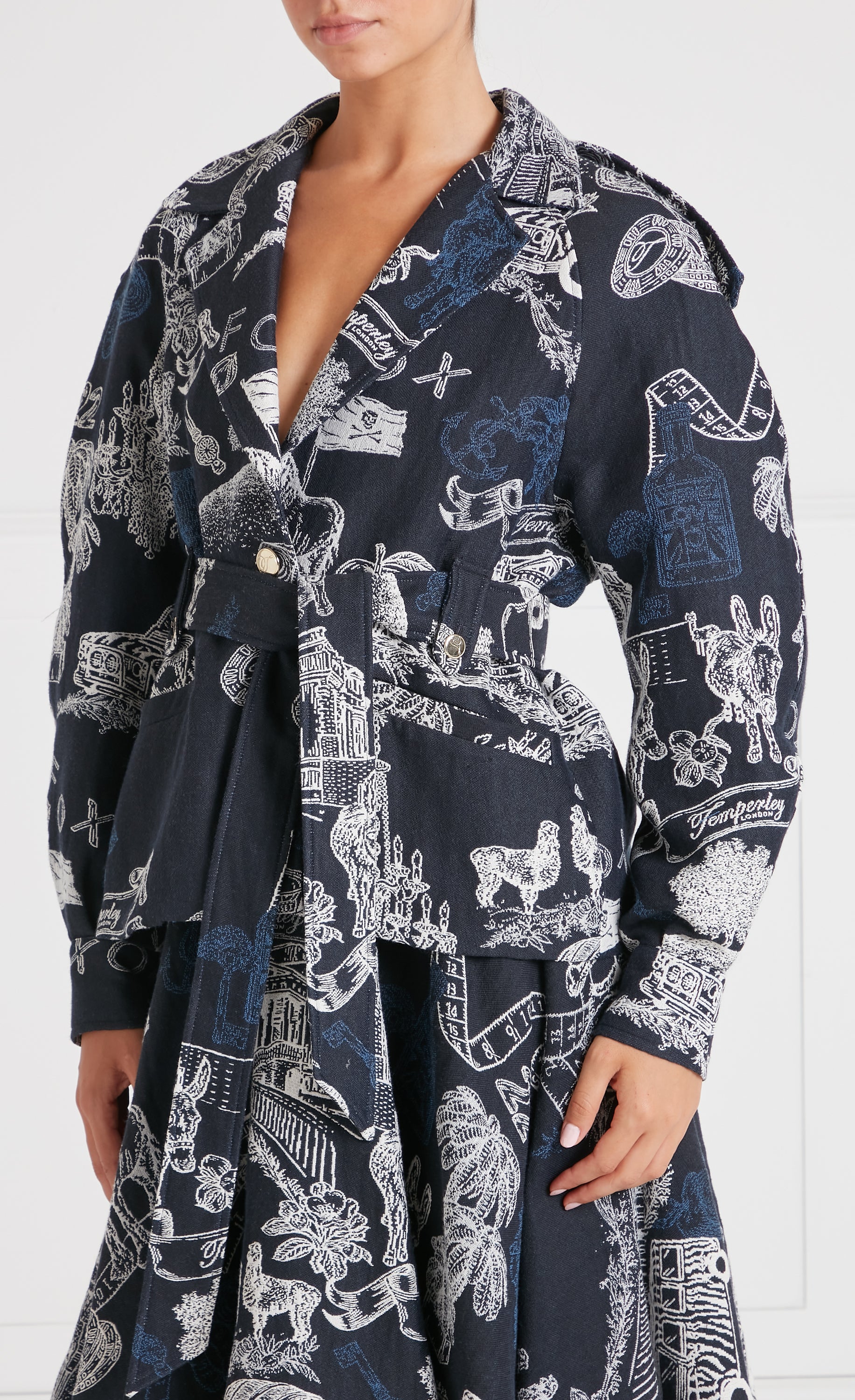 A statement of heritage and modern elegance, the Anniversary Belted Jacket is crafted from woven Toile de Jouy. Cinched at the waist with a self-fabric... More.
