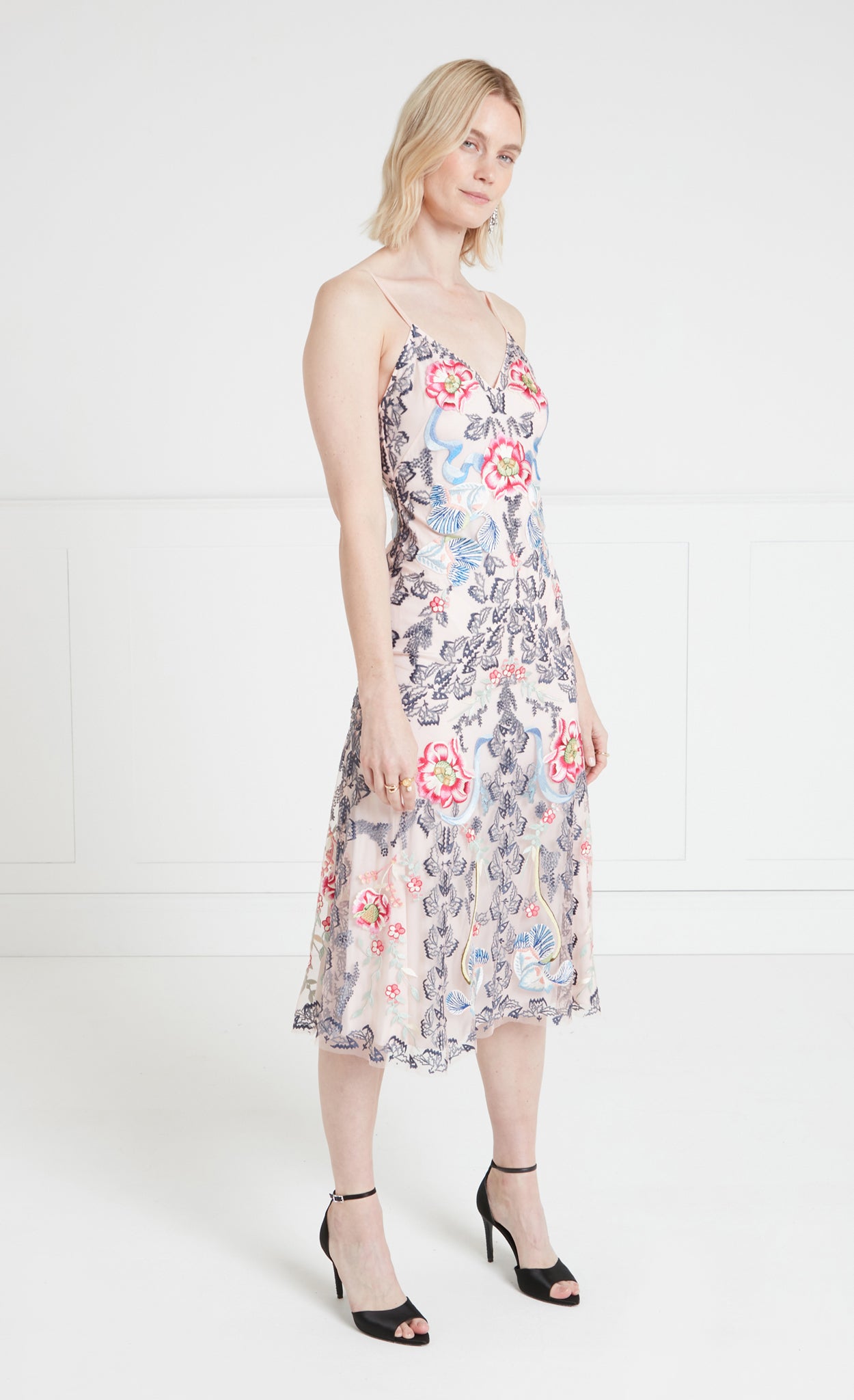 The elegant Bilbao strappy dress showcases an all-over geometric floral design. It features slender strap sleeves and a striking deep v-backline. Style it with flats... More.