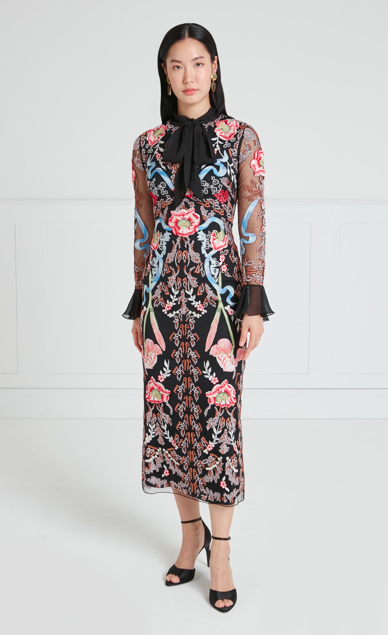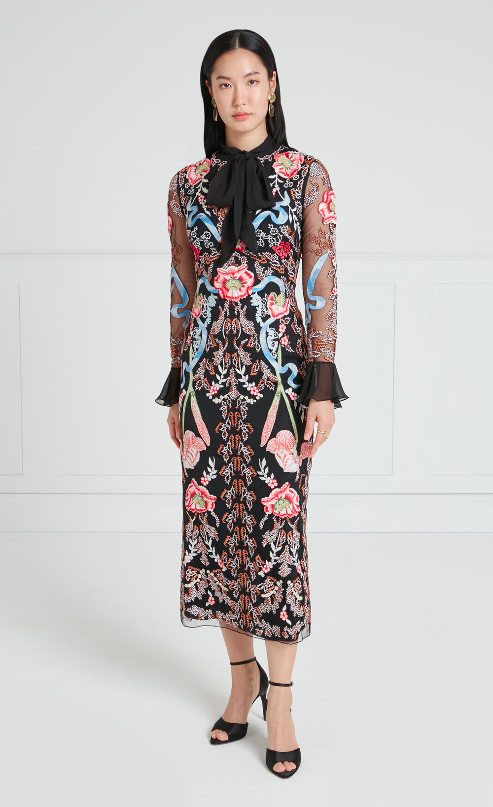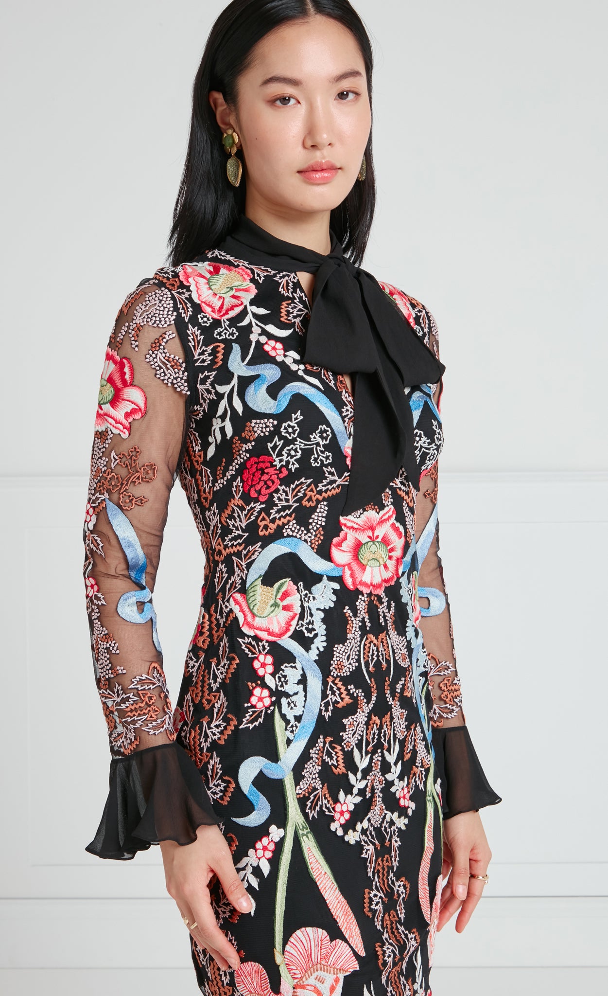 The statement-making, cocktail-length Bilbao tie dress features all-over floral embroidery. It is designed with a feminine bow tie neck and softly flared cuffs, creating elegant... More.