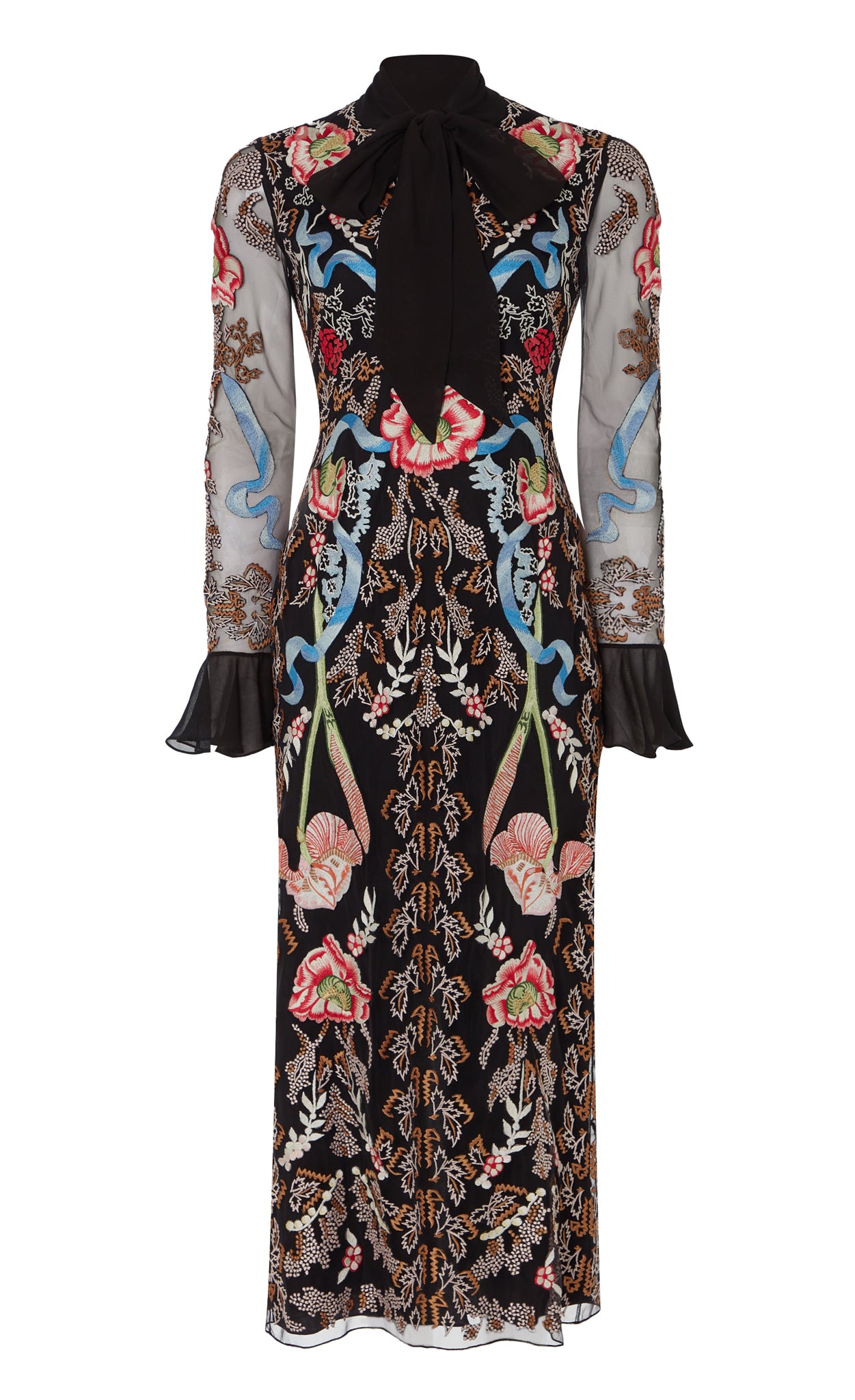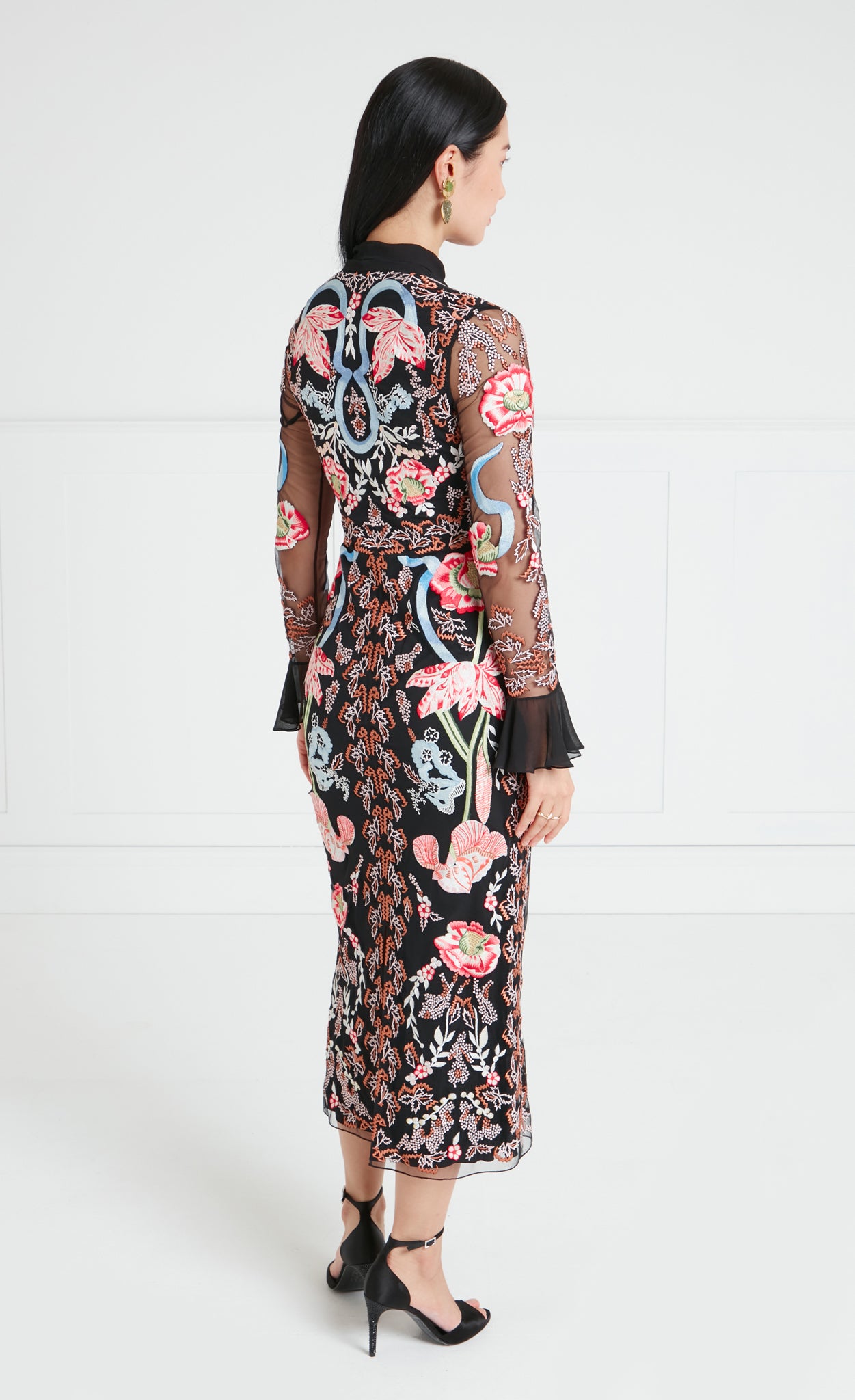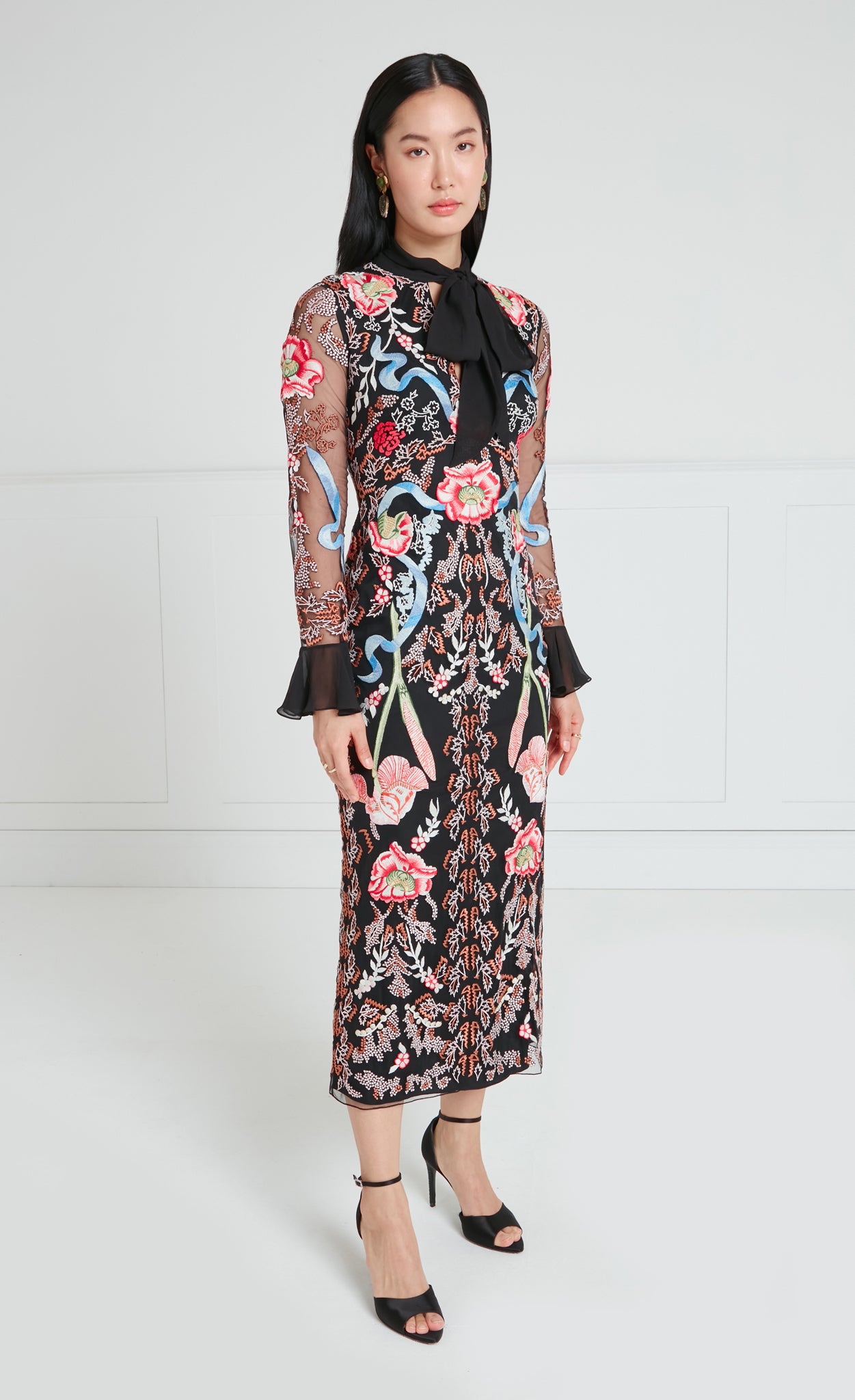 The statement-making, cocktail-length Bilbao tie dress features all-over floral embroidery. It is designed with a feminine bow tie neck and softly flared cuffs, creating elegant... More.