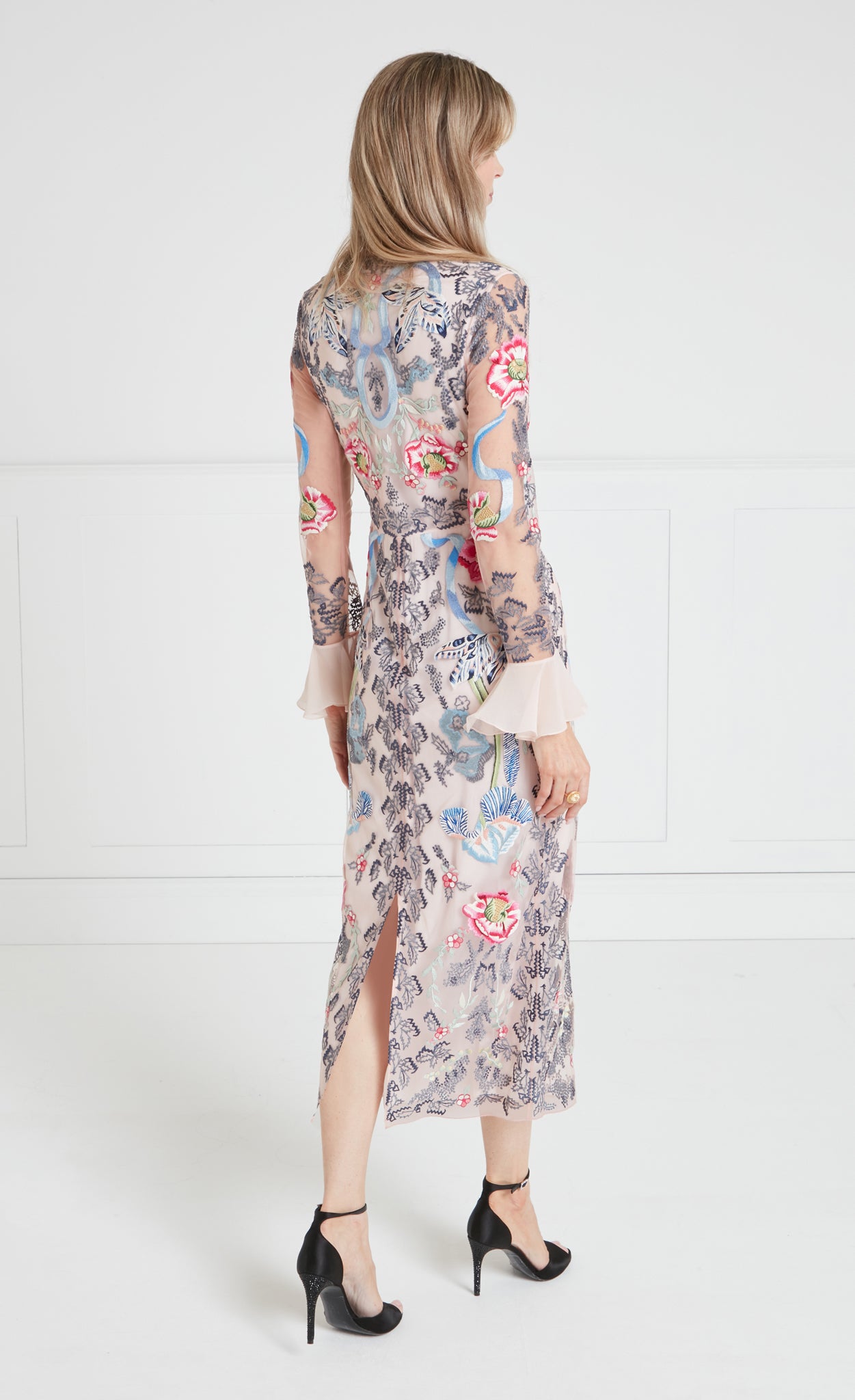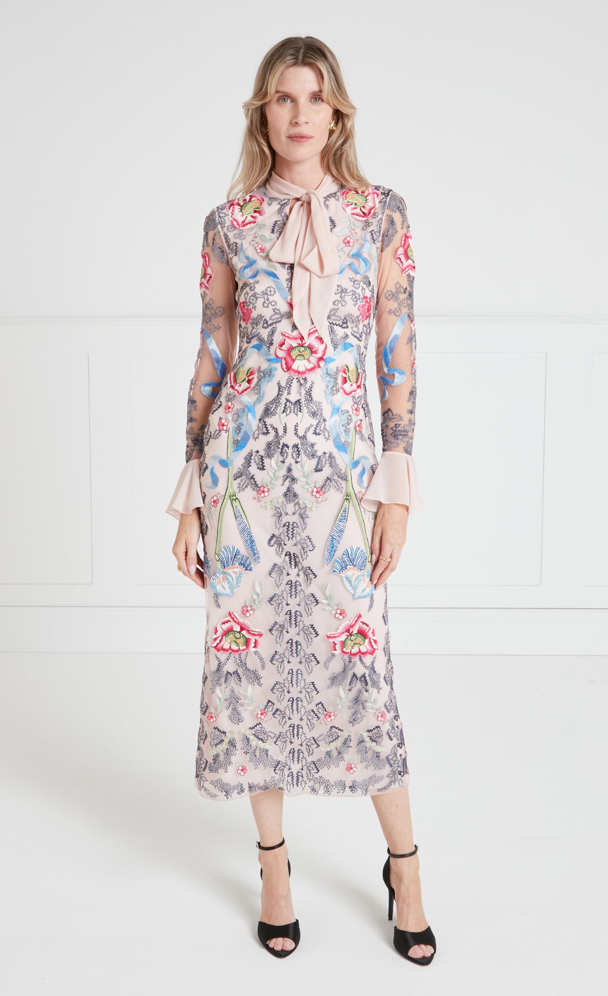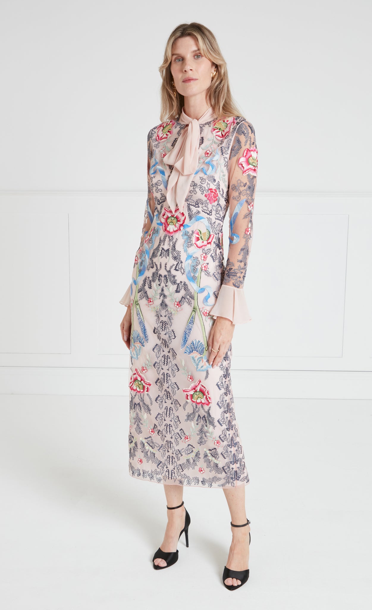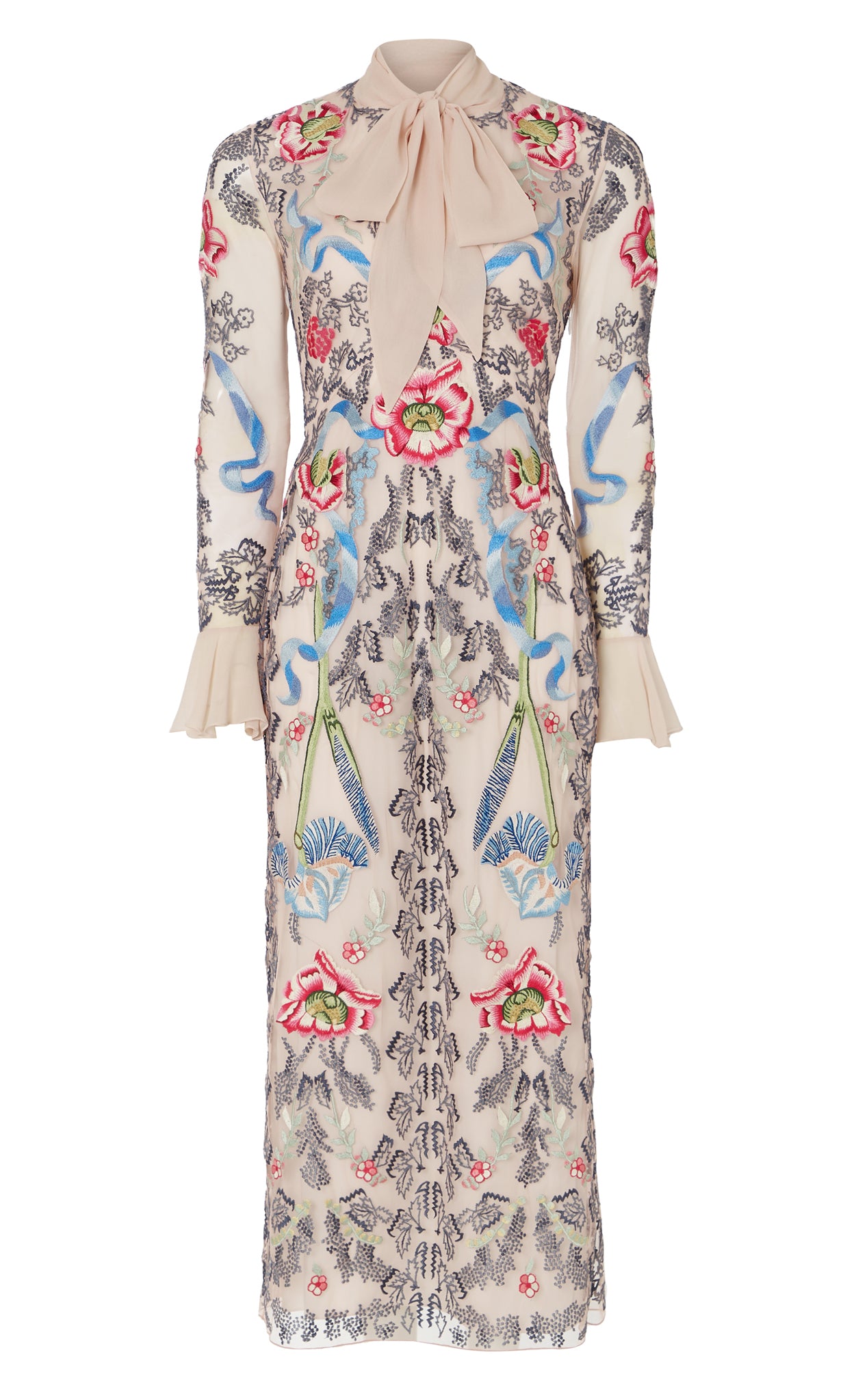 The statement-making, cocktail-length Bilbao tie dress features all-over floral embroidery. It is designed with a feminine bow tie neck and softly flared cuffs, creating elegant... More.