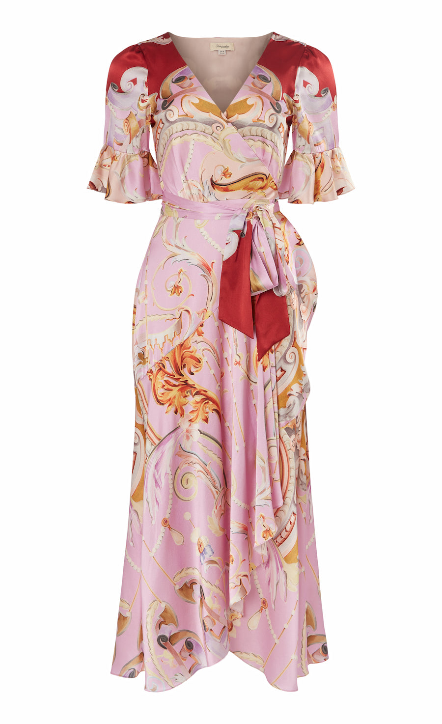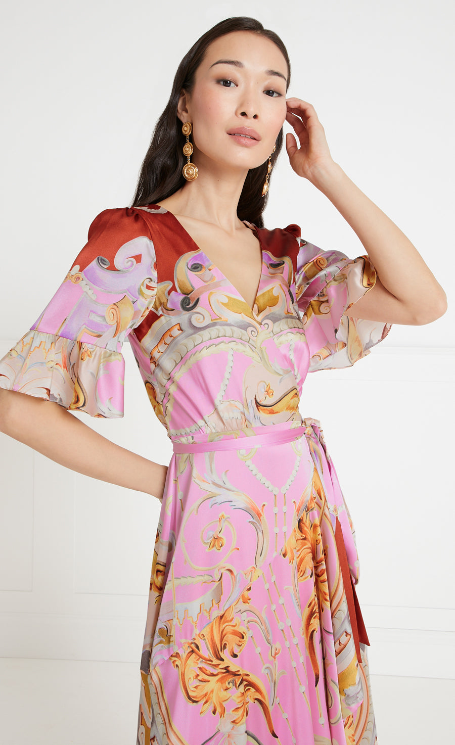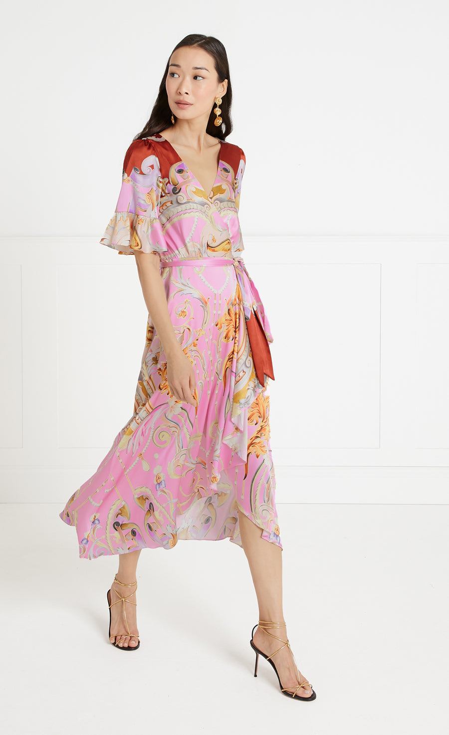 Impeccably cut and truly timeless, the Carline print wrap dress is understatedly elegant — the classic silhouette elevated with subtly fluted sleeves and bow waist... More.