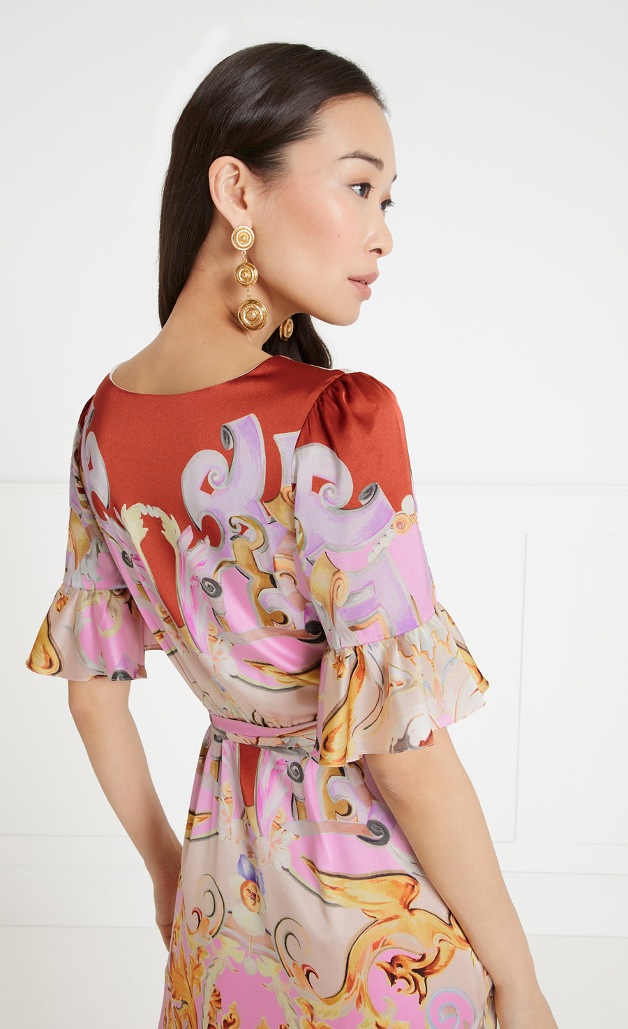 Impeccably cut and truly timeless, the Carline print wrap dress is understatedly elegant — the classic silhouette elevated with subtly fluted sleeves and bow waist tie, flowing into a full skirt for fluid movement.