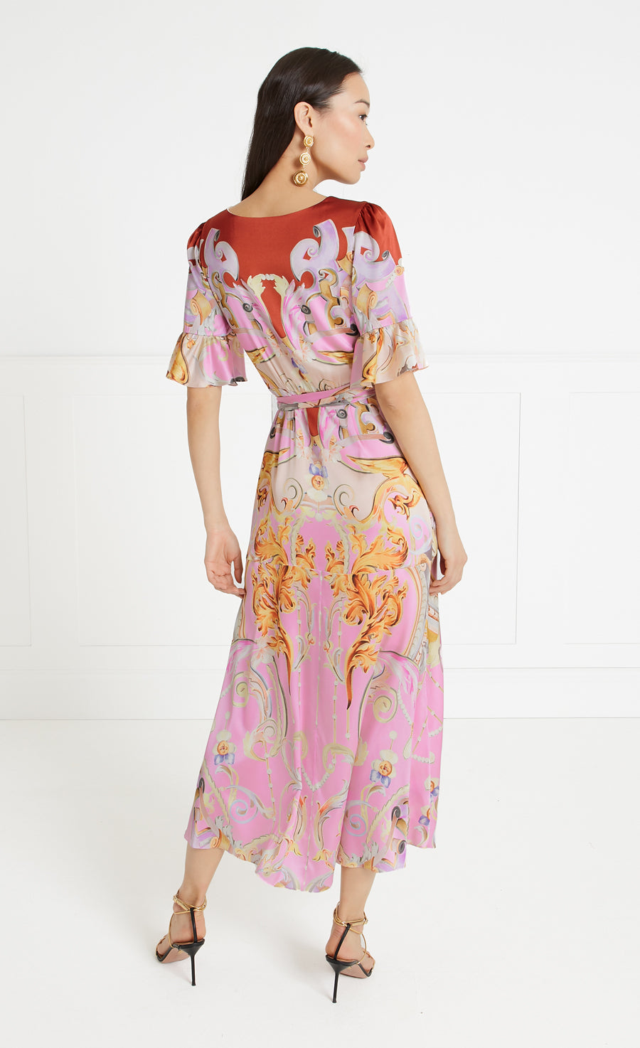 A picture of wearable opulence, our Carline story offers a lighter and looser evening print option. Made from fluid stretch satin silk, the hand-painted artwork depicts muted fresco-style motifs, composed in-house then printed in Italy, combining hazy pastels with a stronger hue at the hem. Featuring three dresses, a coat and two headscarves, united by contemporary silhouettes that can be co-ordinated or worn alone.