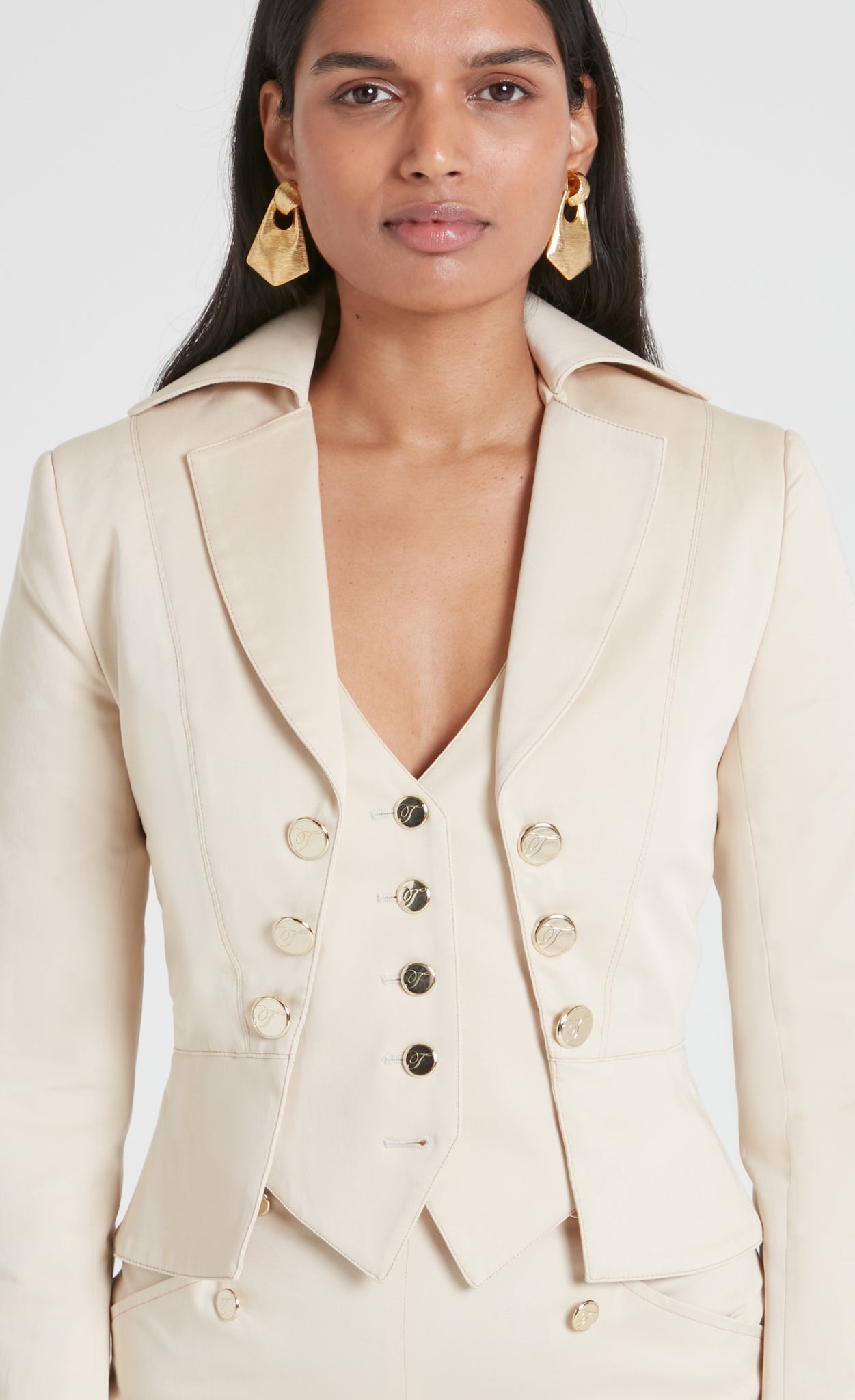 Inspired by classic military styles, the Castell story is crafted from heavy Italian cotton with a hint of elastane for ease of movement and comfort. A sculpted hemline enhances the hourglass silhouette, delivering a sharp, tailored finish.