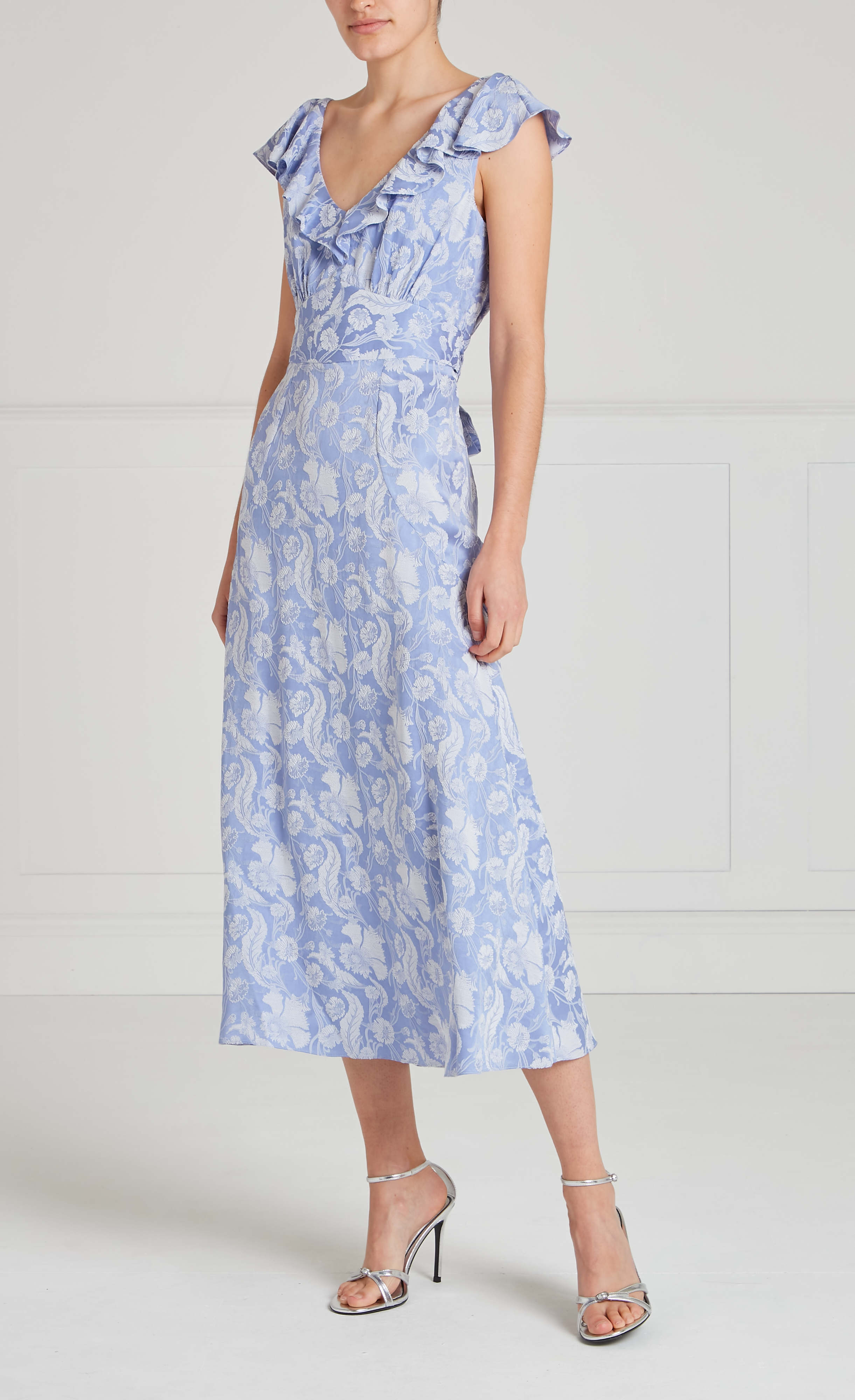 Defined by a ruffled V-neckline and back, the Celine Dress features a flattering midi length and a self-tie sash belt that softly defines the waist.