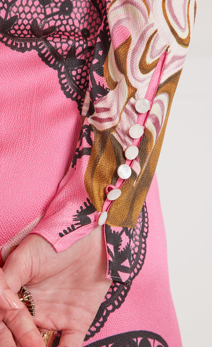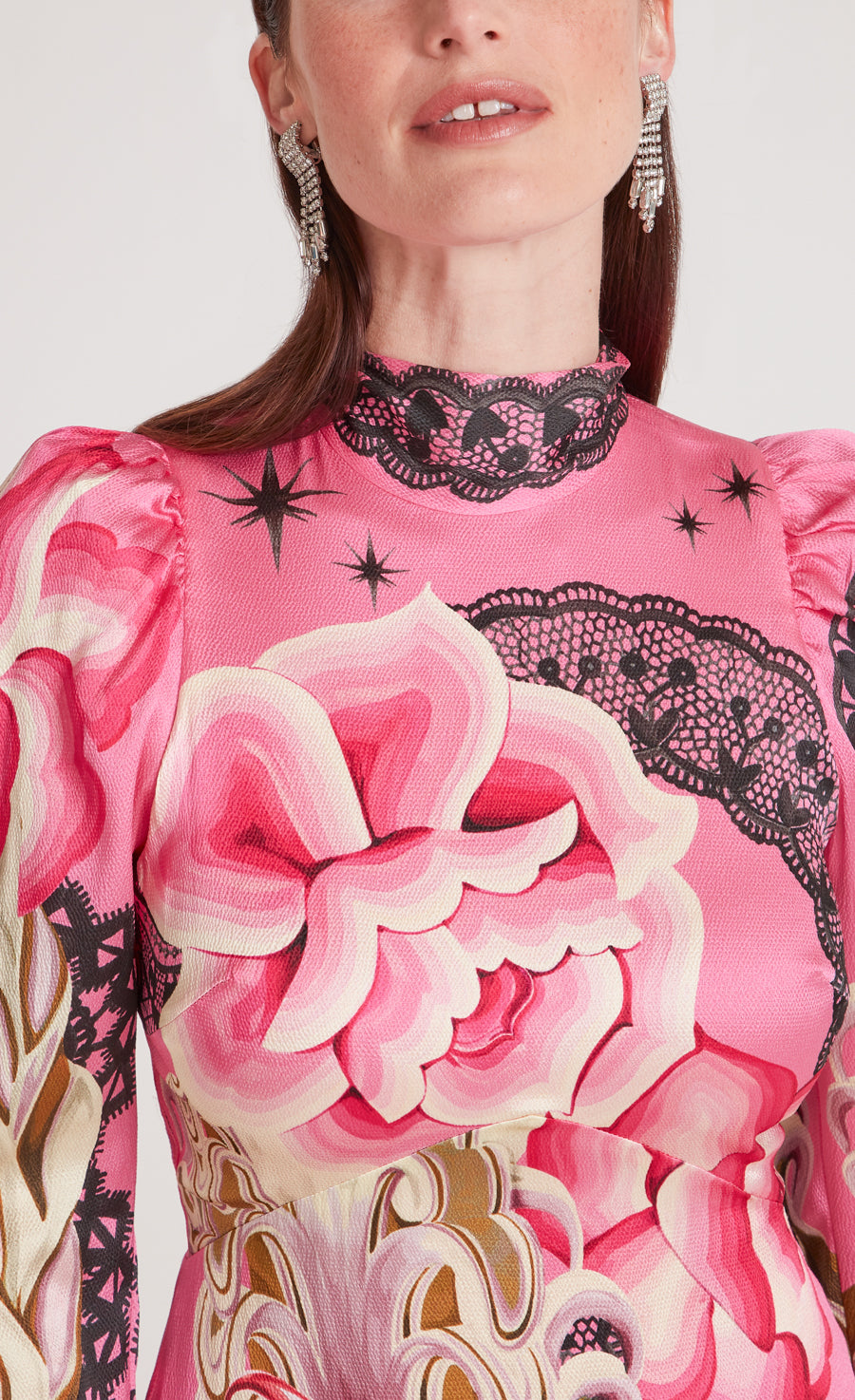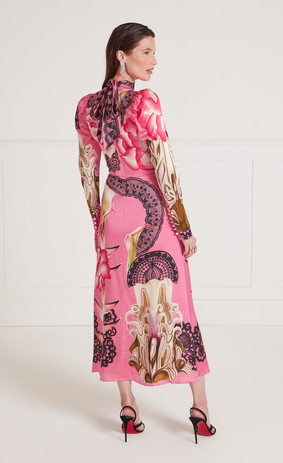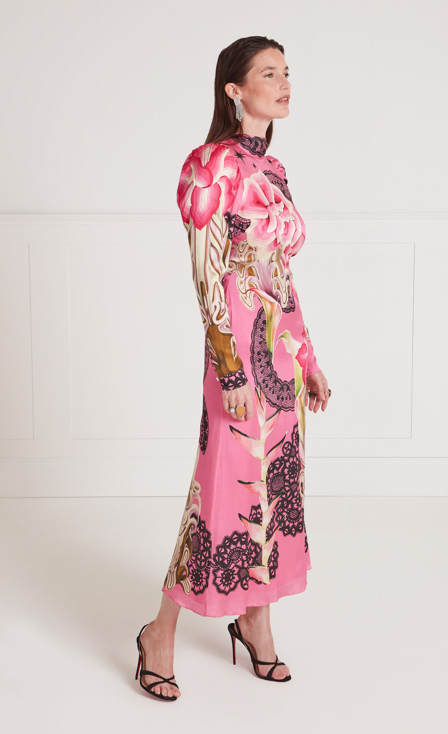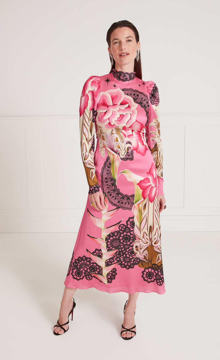Temperley prints are painstakingly hand-painted in-house. Motifs are collaged onto the body then lovingly engineered into compositions that work in harmony with the garment’s panelling, ensuring the printed fabric flows flawlessly across seam joints when the garment is constructed. The process is both meticulous and spontaneous, with an outcome that is truly unique and artisanal.