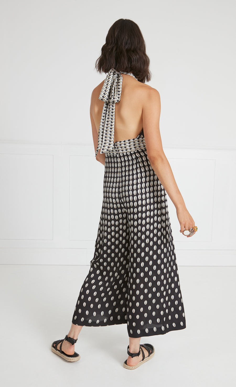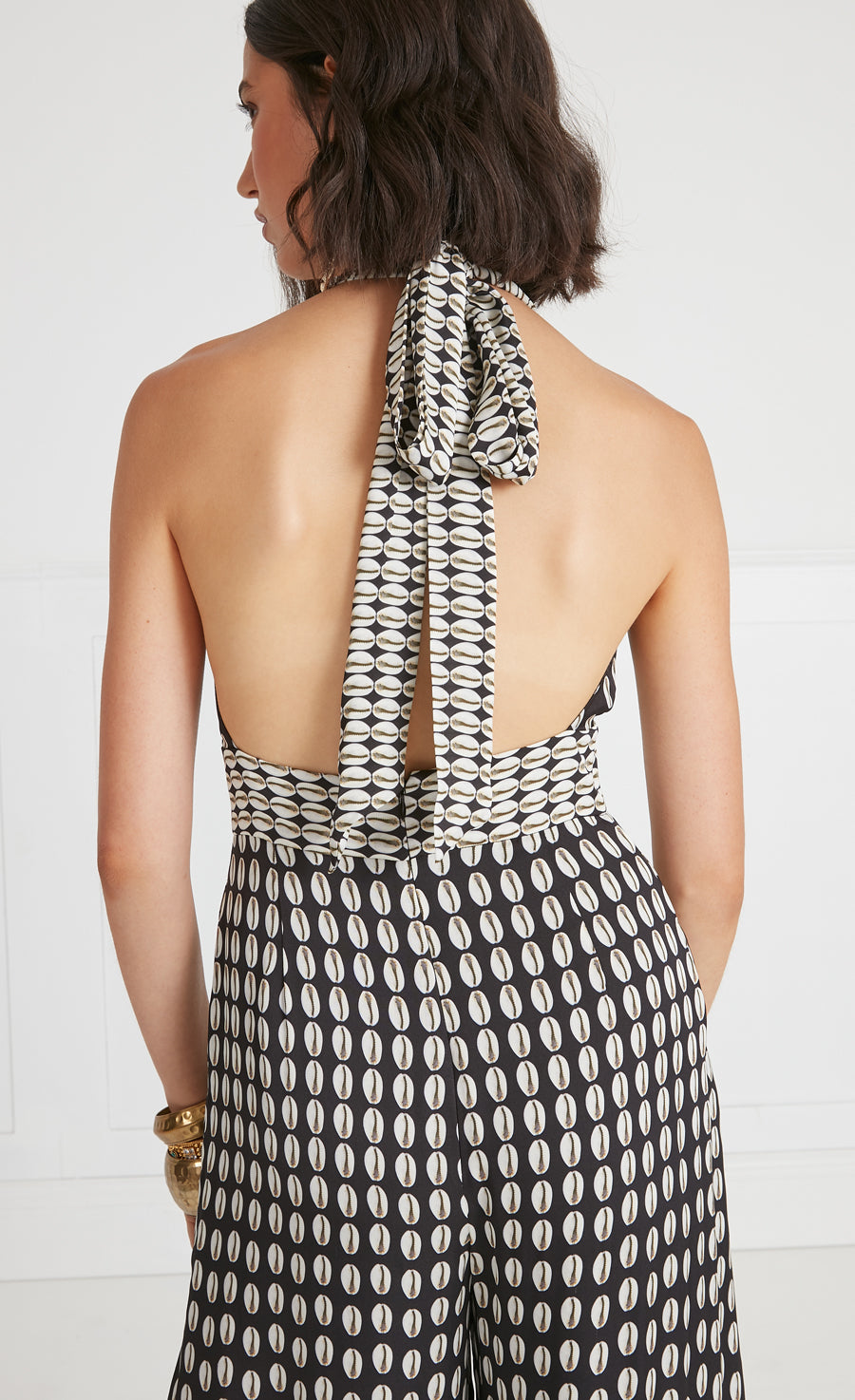 The Cowrie Print Jumpsuit is a summer staple in this latest collection, worn with both ease and elegance. Made from a durable silk mix that skims the body and does not crease easily.