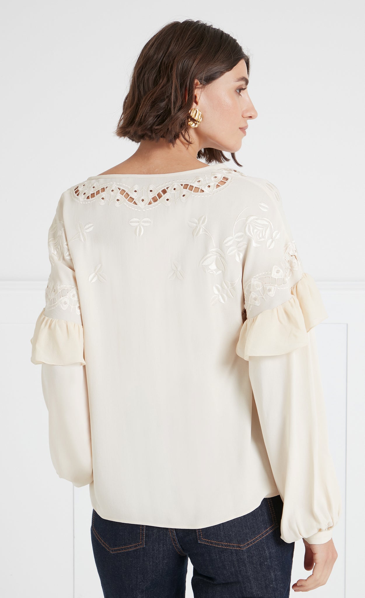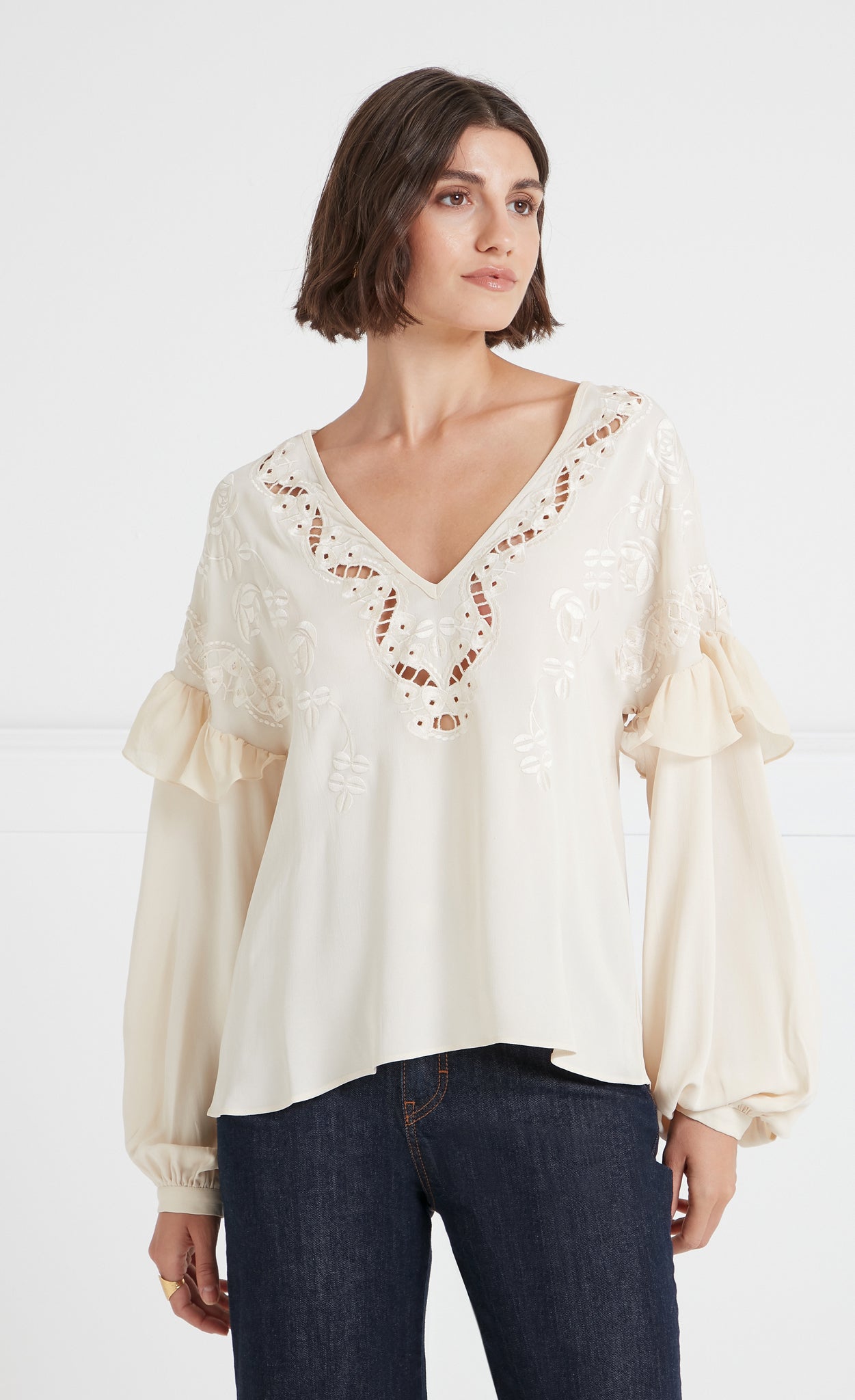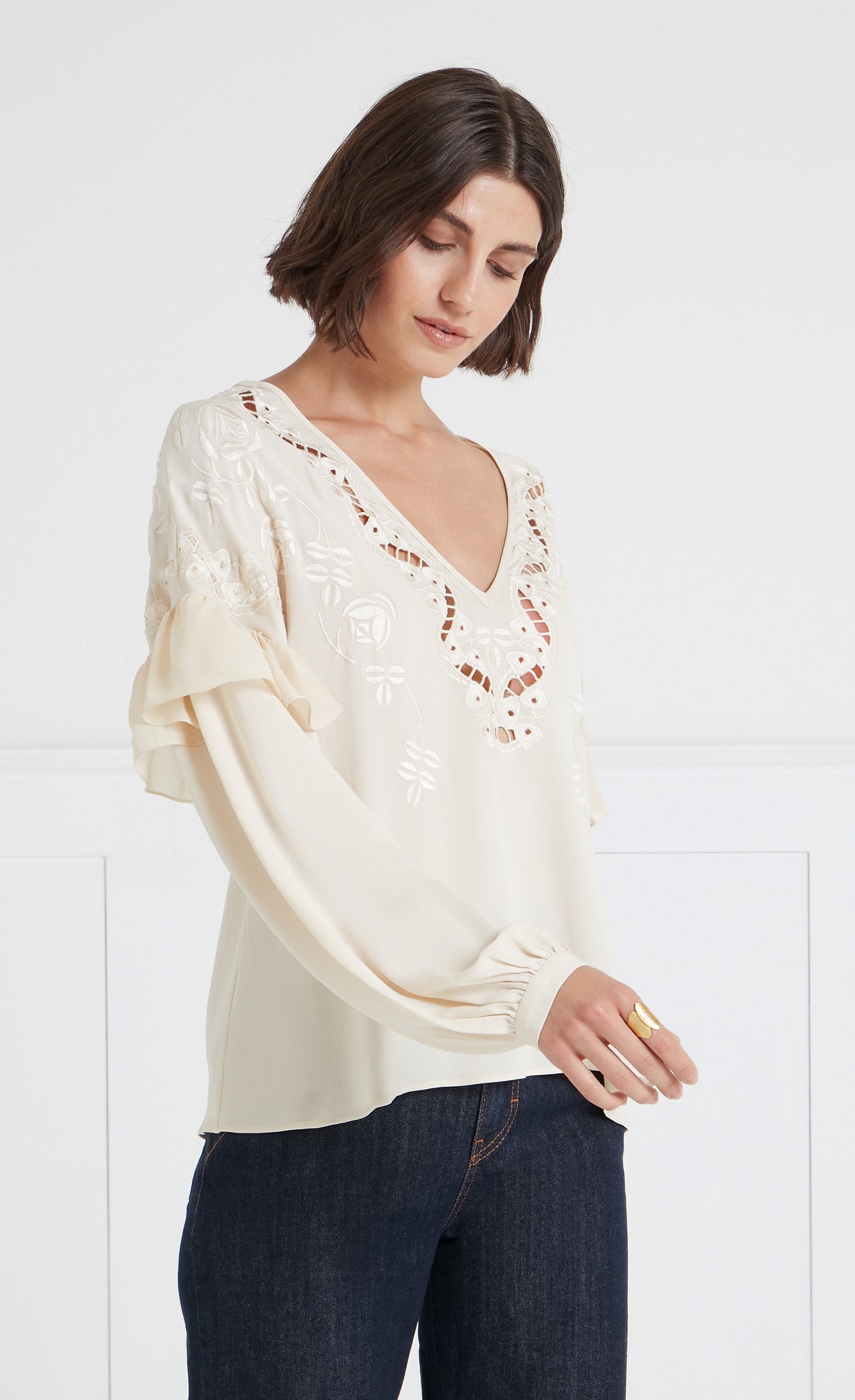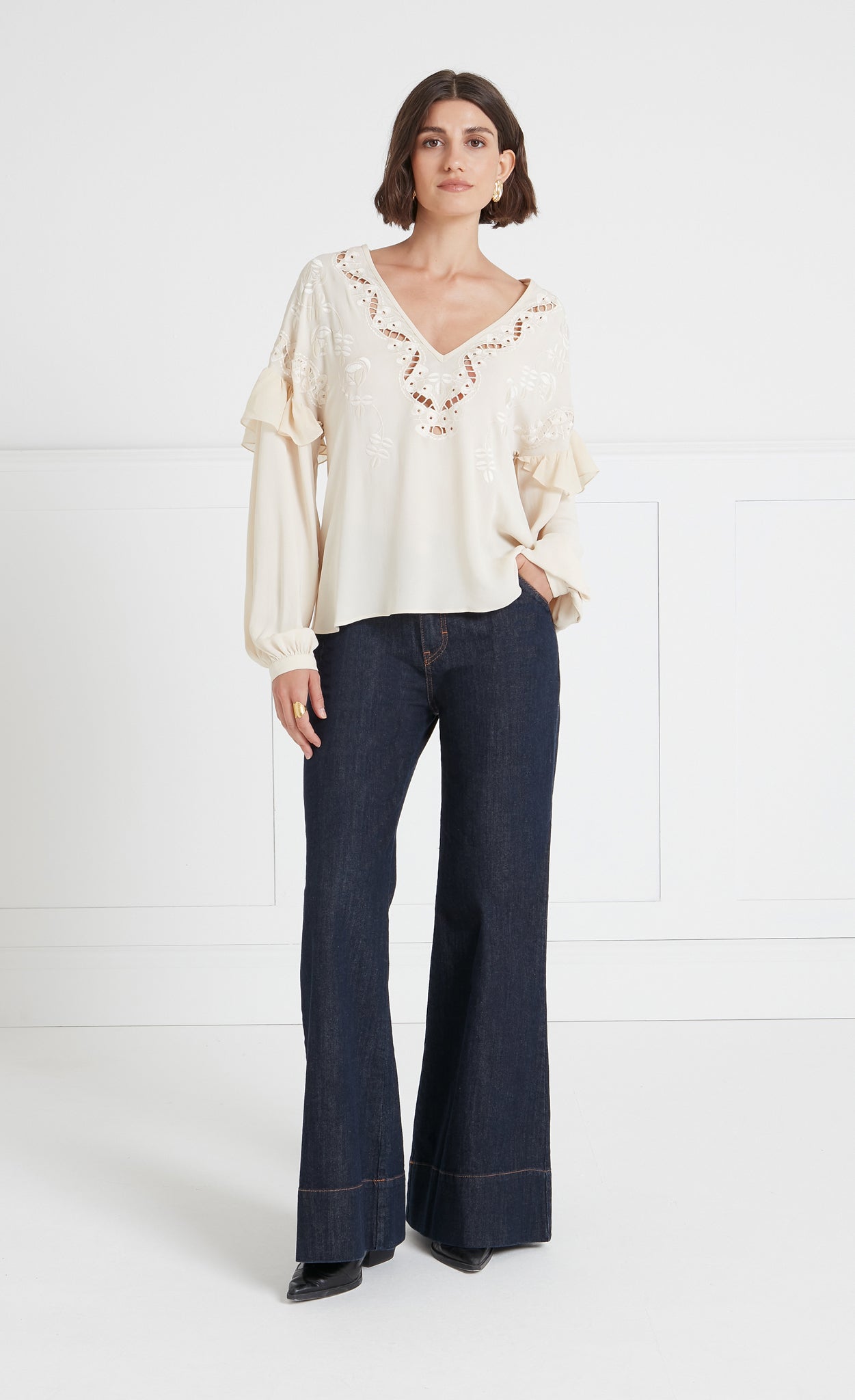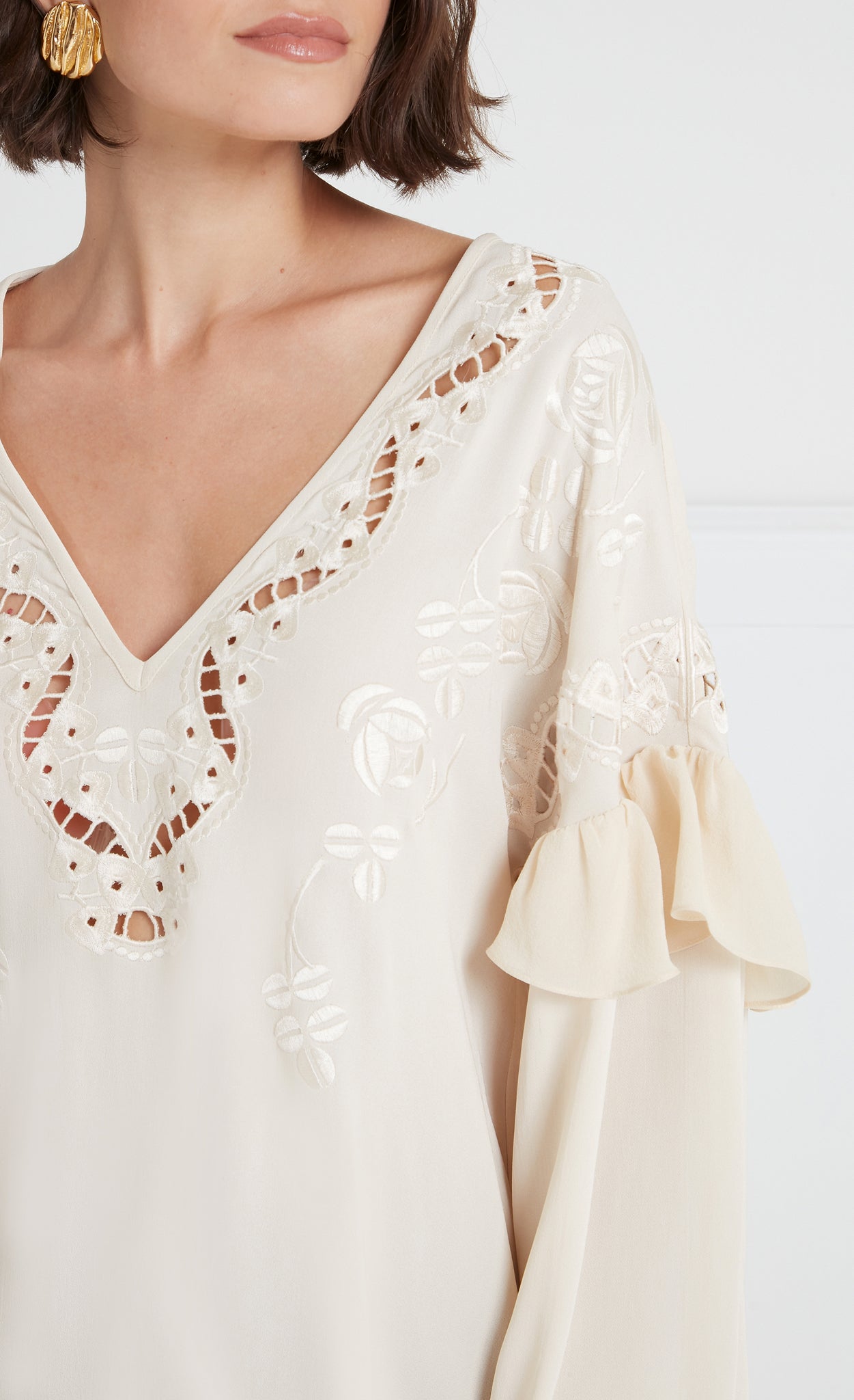 With an airy draping fit and fluid silhouette, the Daphne blouse showcases striking Temperley cutwork and embroidered florals, with relaxed drop shoulders, a sweeping V-neckline and billowing ruffle detail sleeves, offering a spirited option for day or cocktail party dressing.