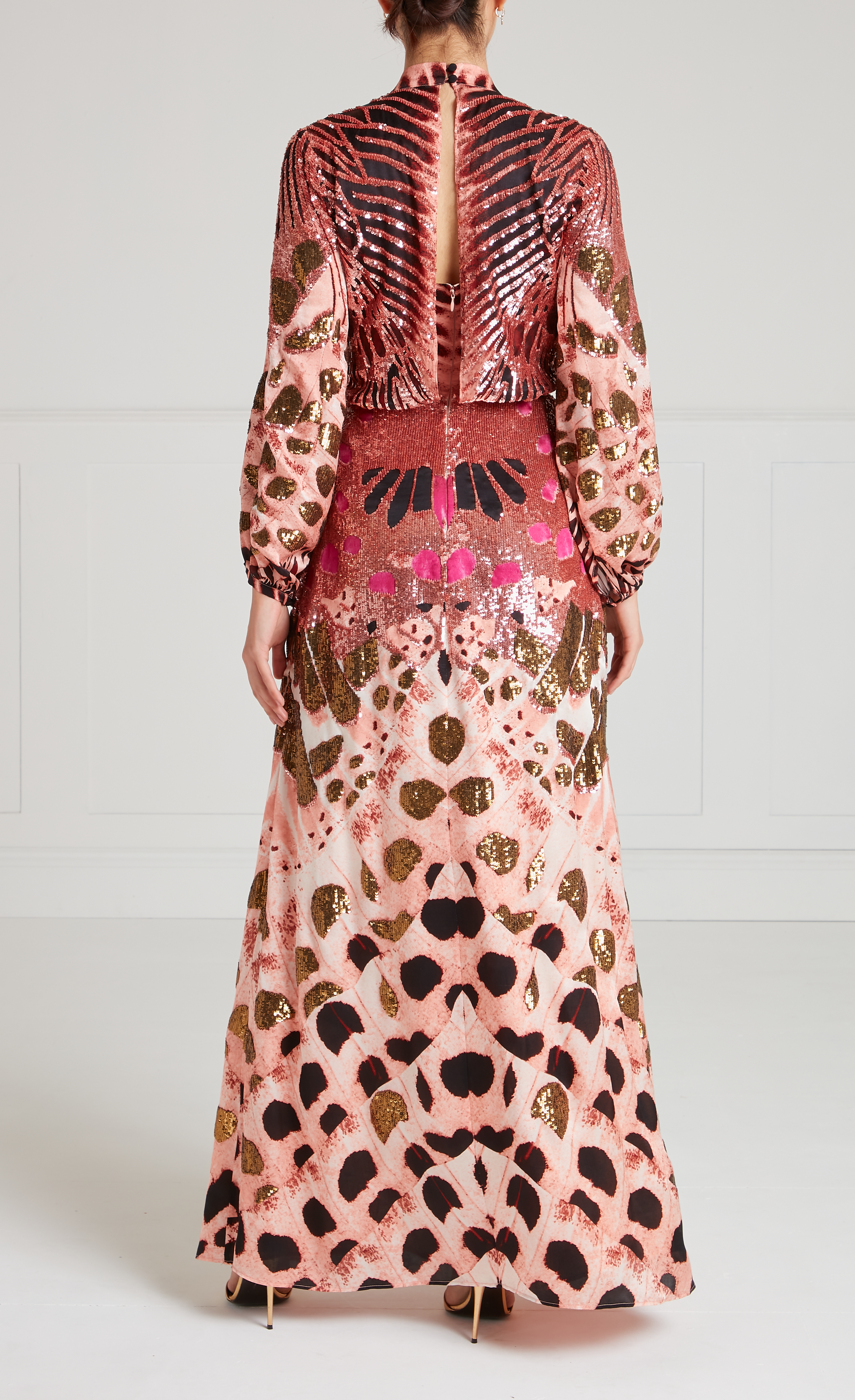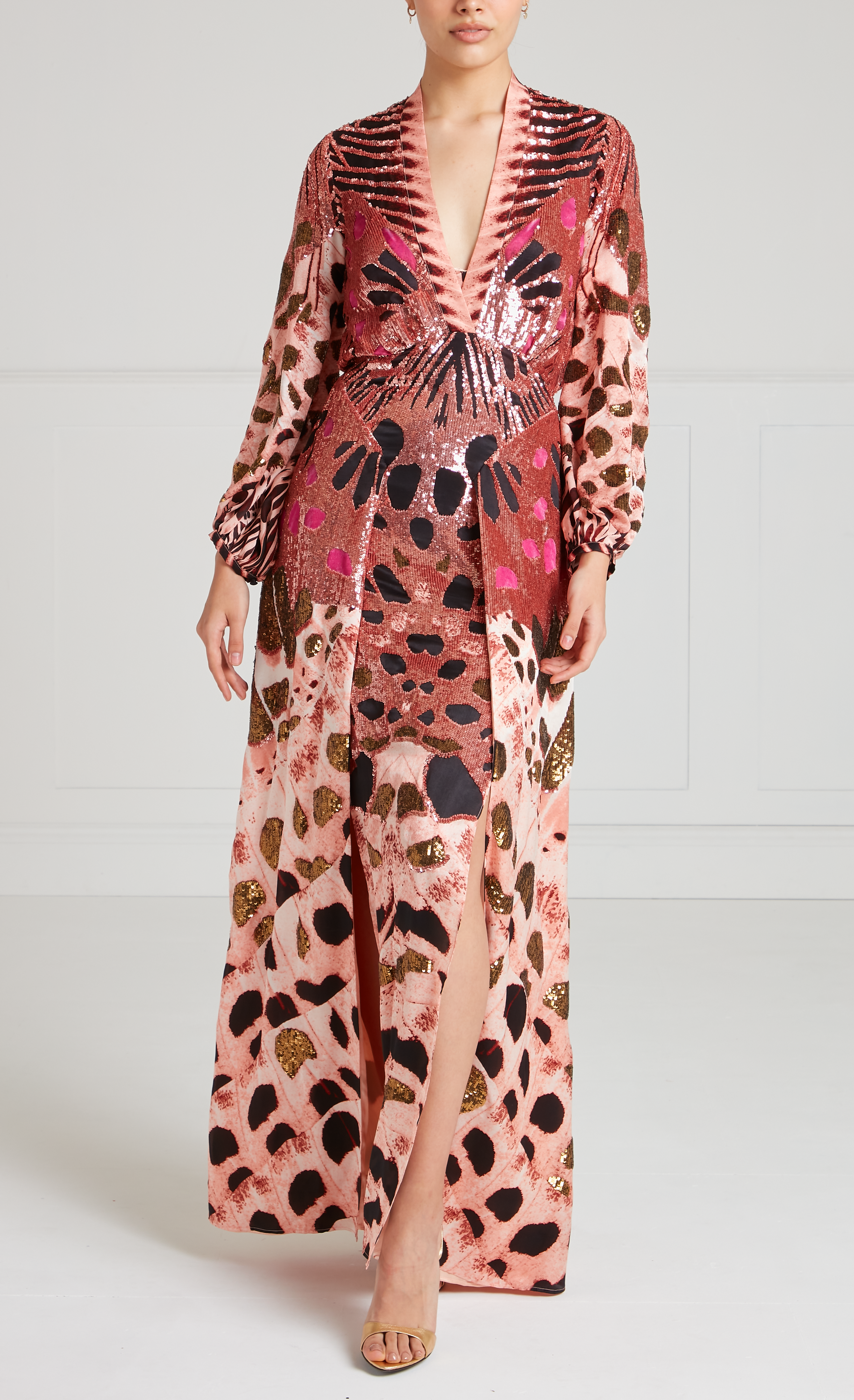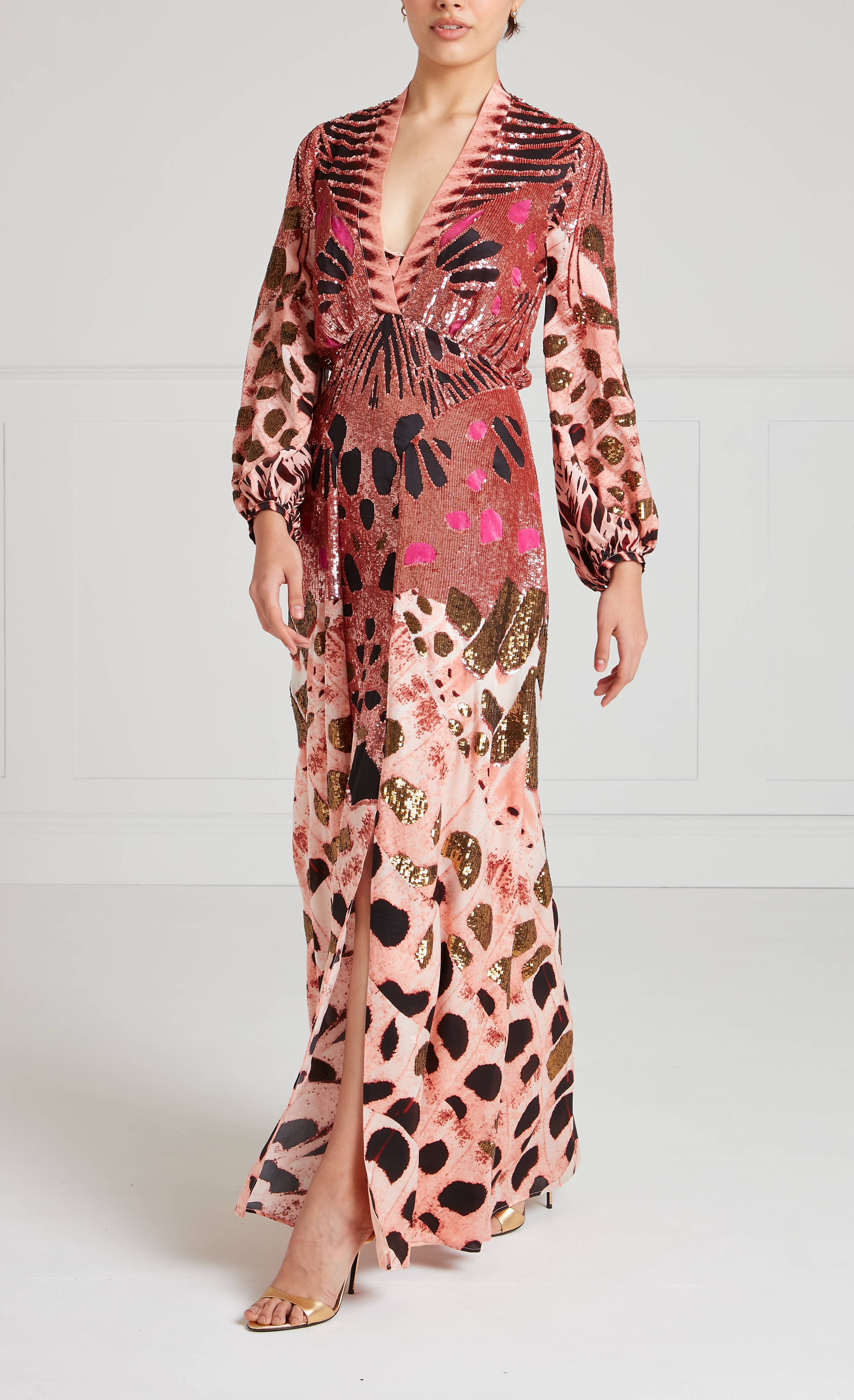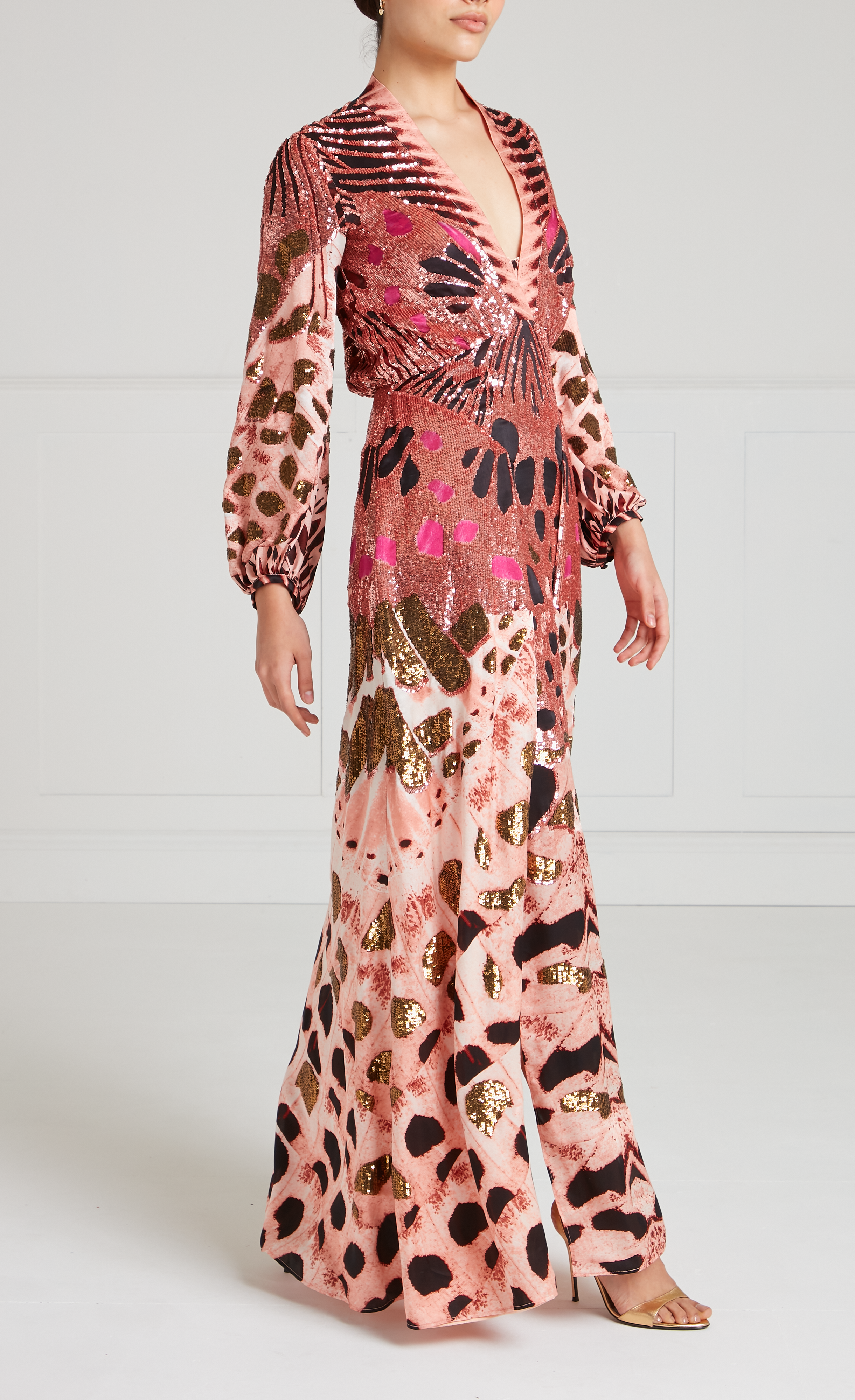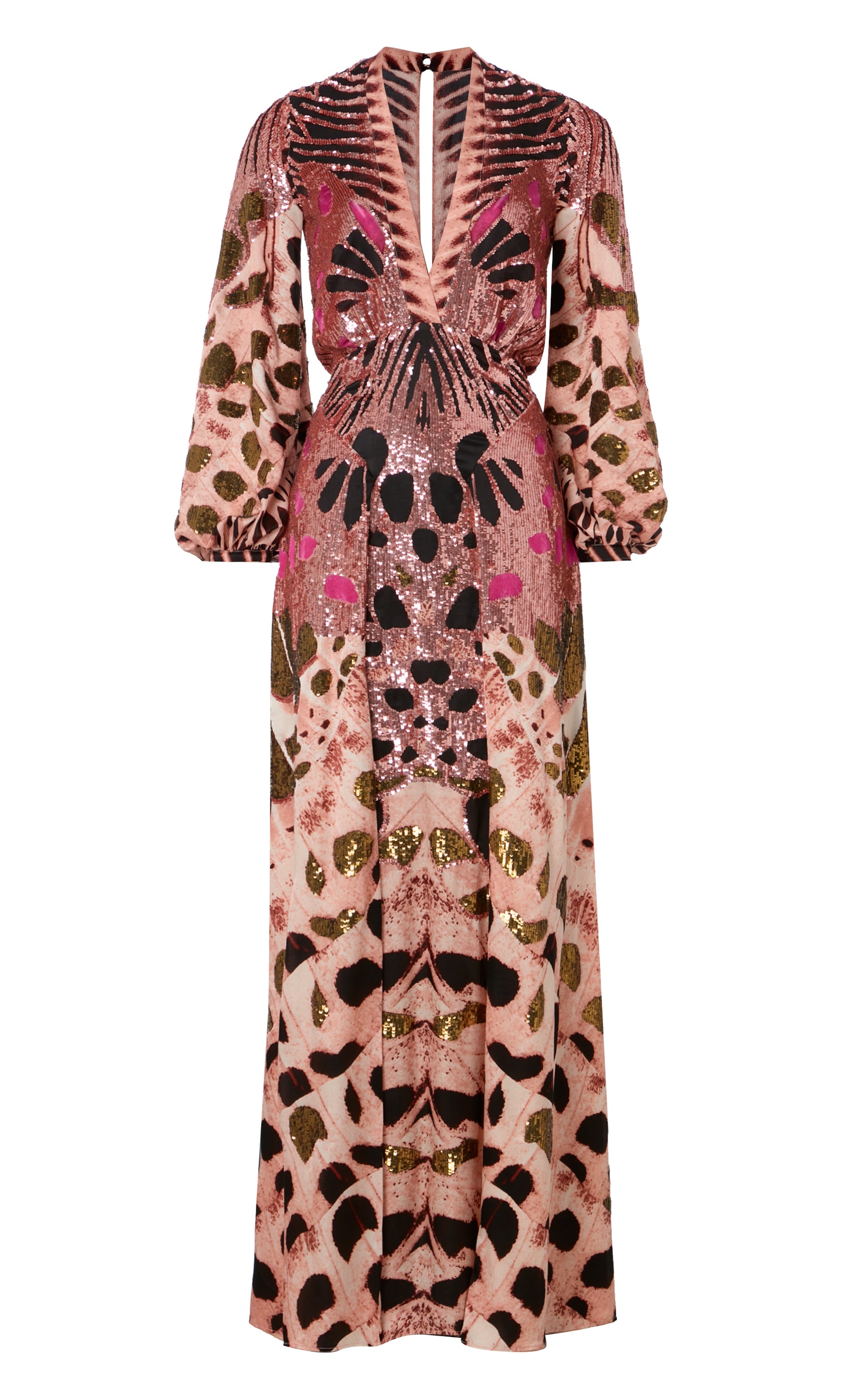 Commanding attention, this pink sequined dress has a sleek V-neck flowing to long, puffy sleeves in lightweight silk satin. A curved waistline features pleats falling into slits, billowing artfully for fluid movement. Elegant, airy, and glittering, this gown transitions seamlessly from day to night.