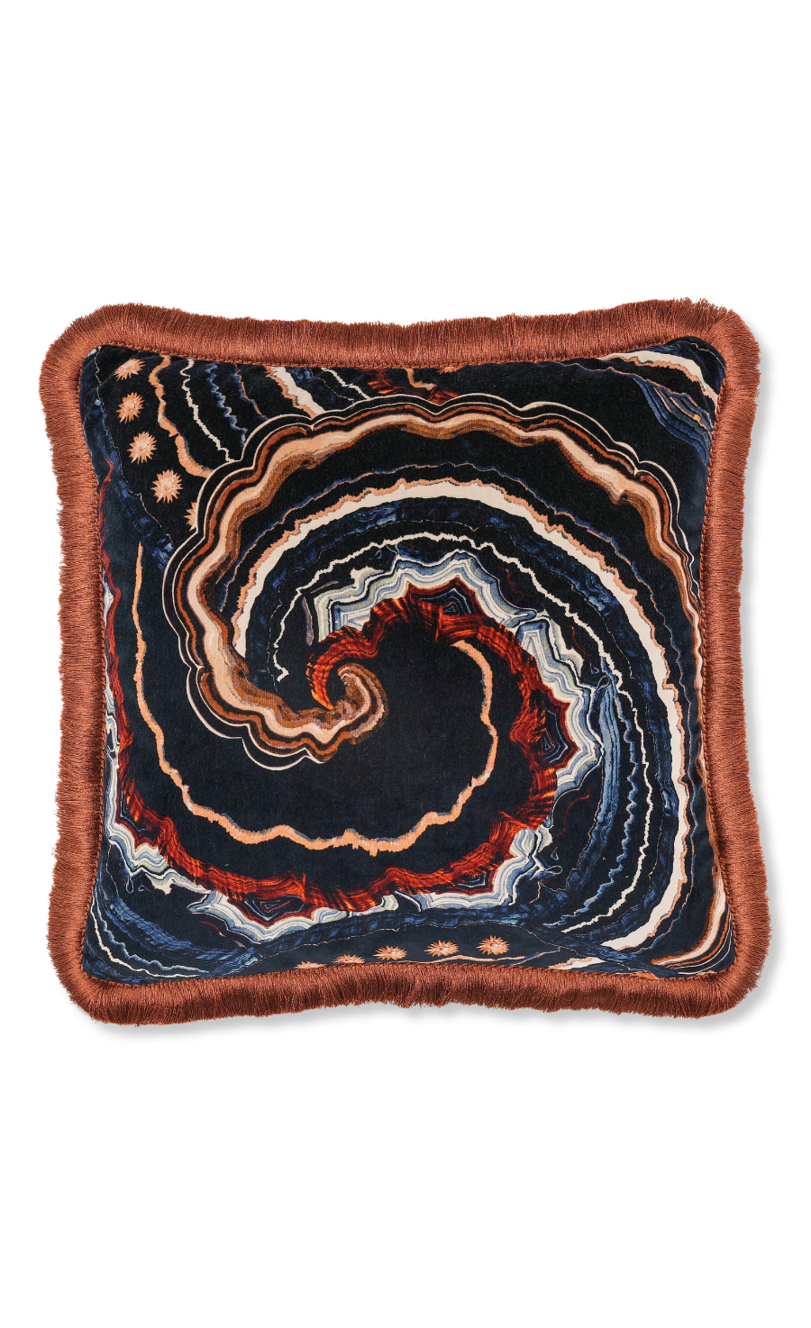 A sumptuous, deep pile velvet cushion featuring a hypnotic display of agate inspired swirls that exudes a psychedelic sophistication.