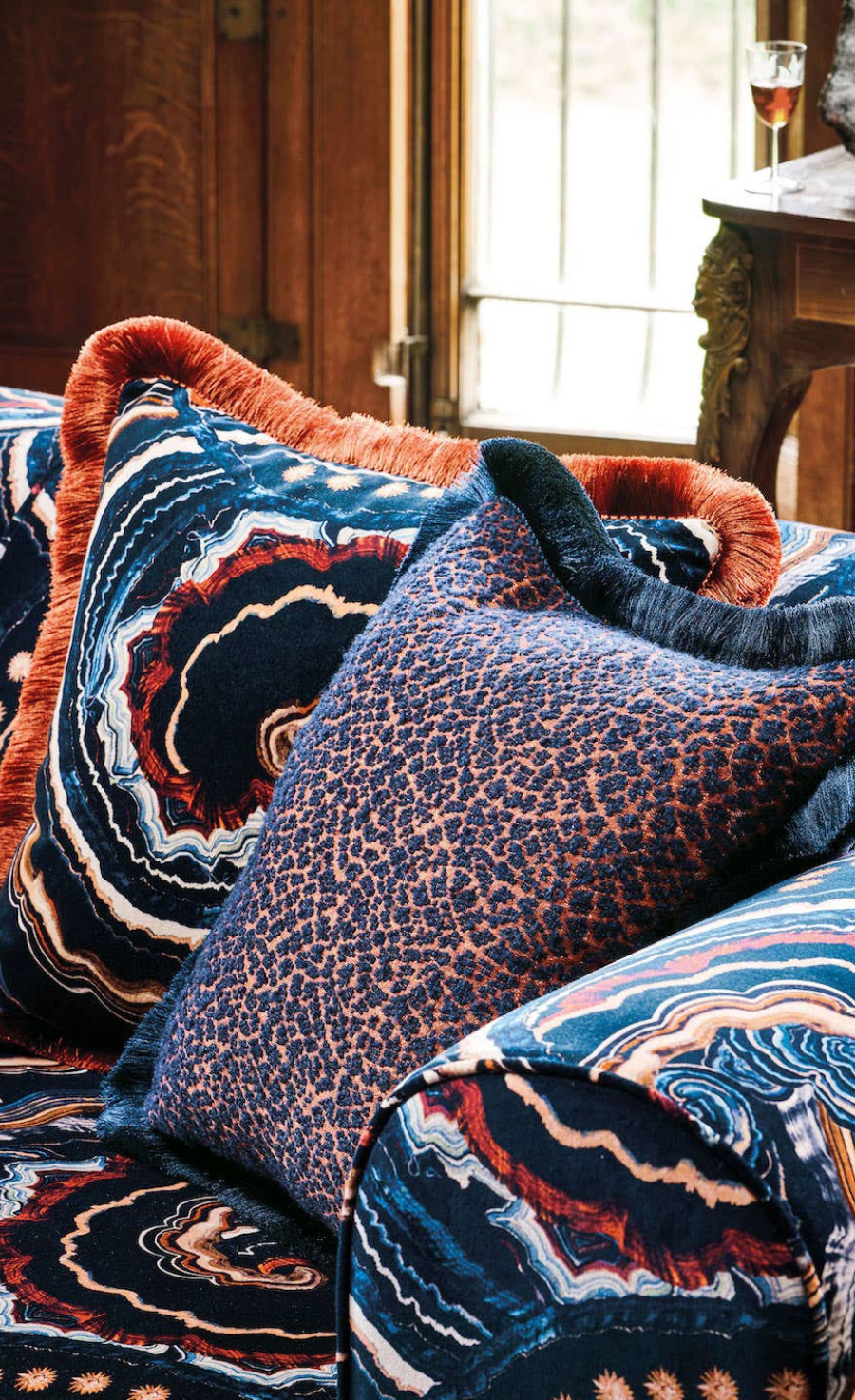 A sumptuous, deep pile velvet cushion featuring a hypnotic display of agate inspired swirls that exudes a psychedelic sophistication. More.