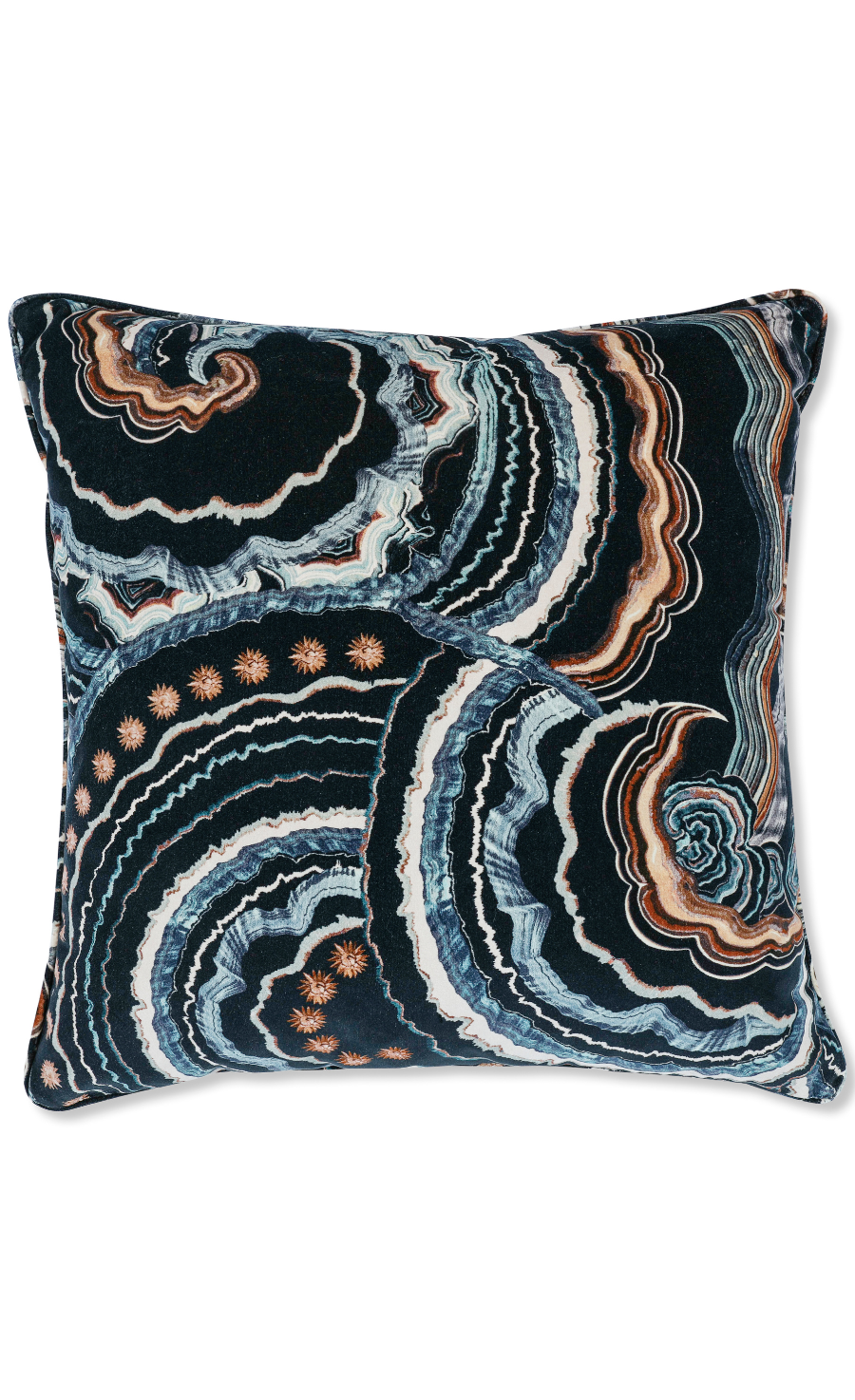 A sumptuous, deep pile velvet cushion featuring a hypnotic display of agate inspired swirls that exudes a psychedelic sophistication. More.