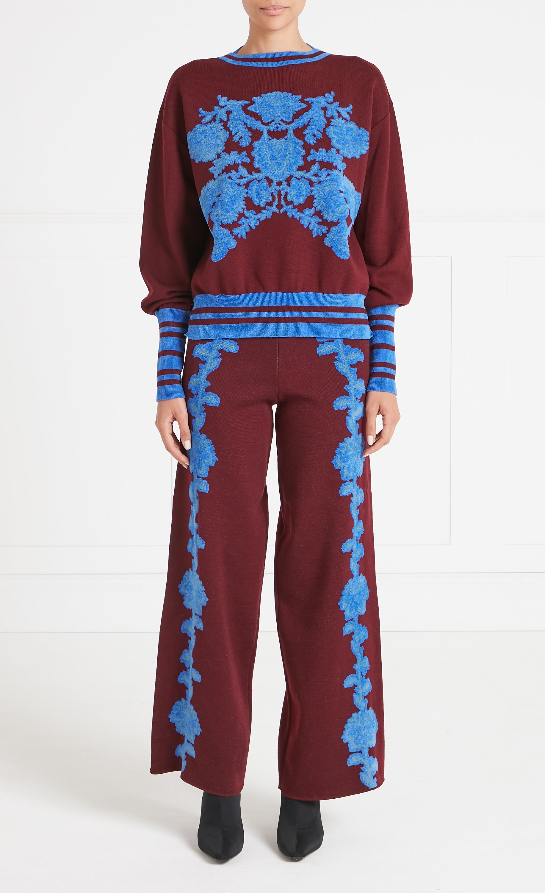 Redefining comfort and elegance, the Floral Knit Trousers feature a vibrant floral jacquard design inspired by our Francis artwork. Crafted in burgundy with a cascading blue floral motif down each wide leg, the high-waisted cut is finished with striped detailing at the waistband, balancing bold artistry with everyday wearability.