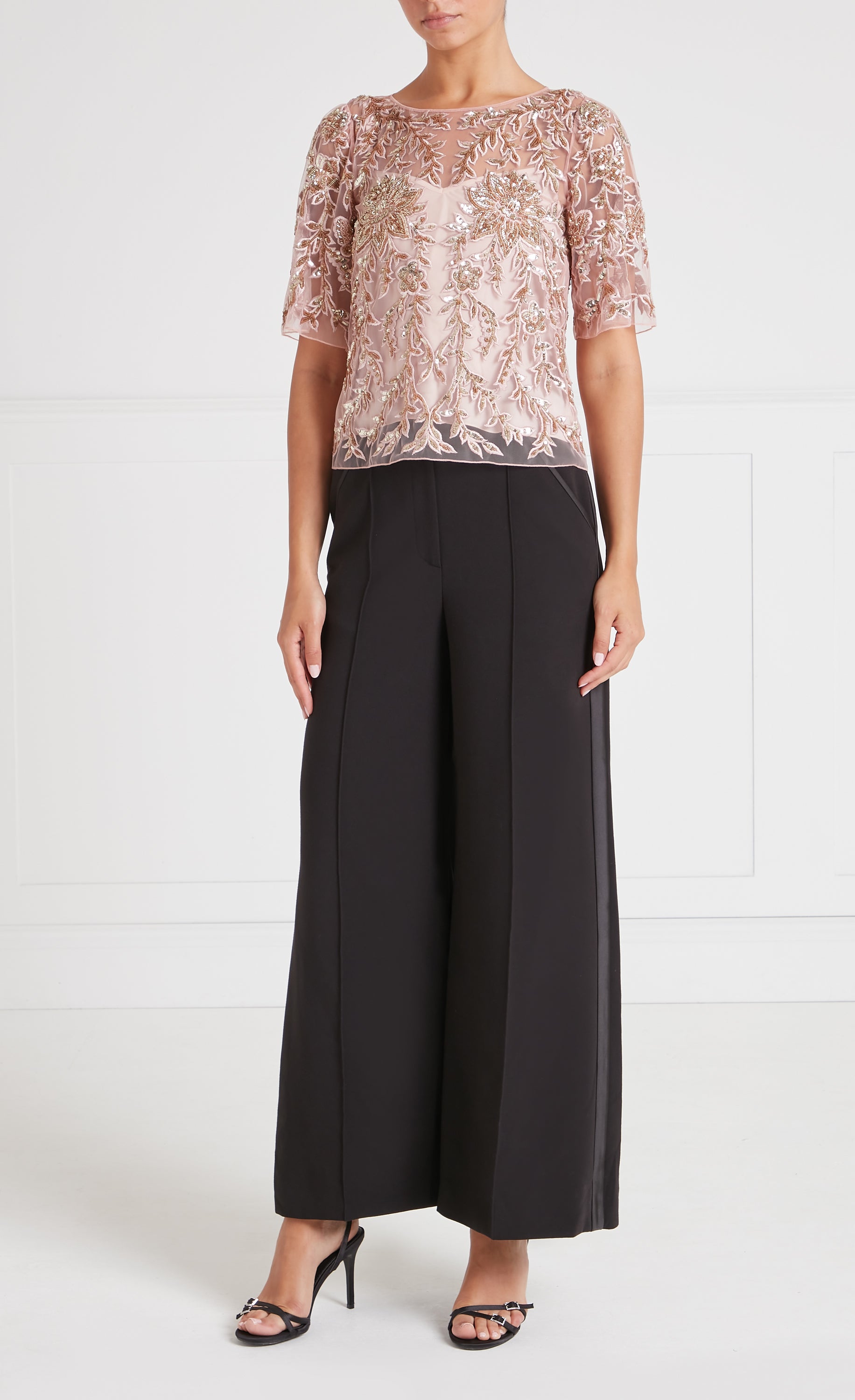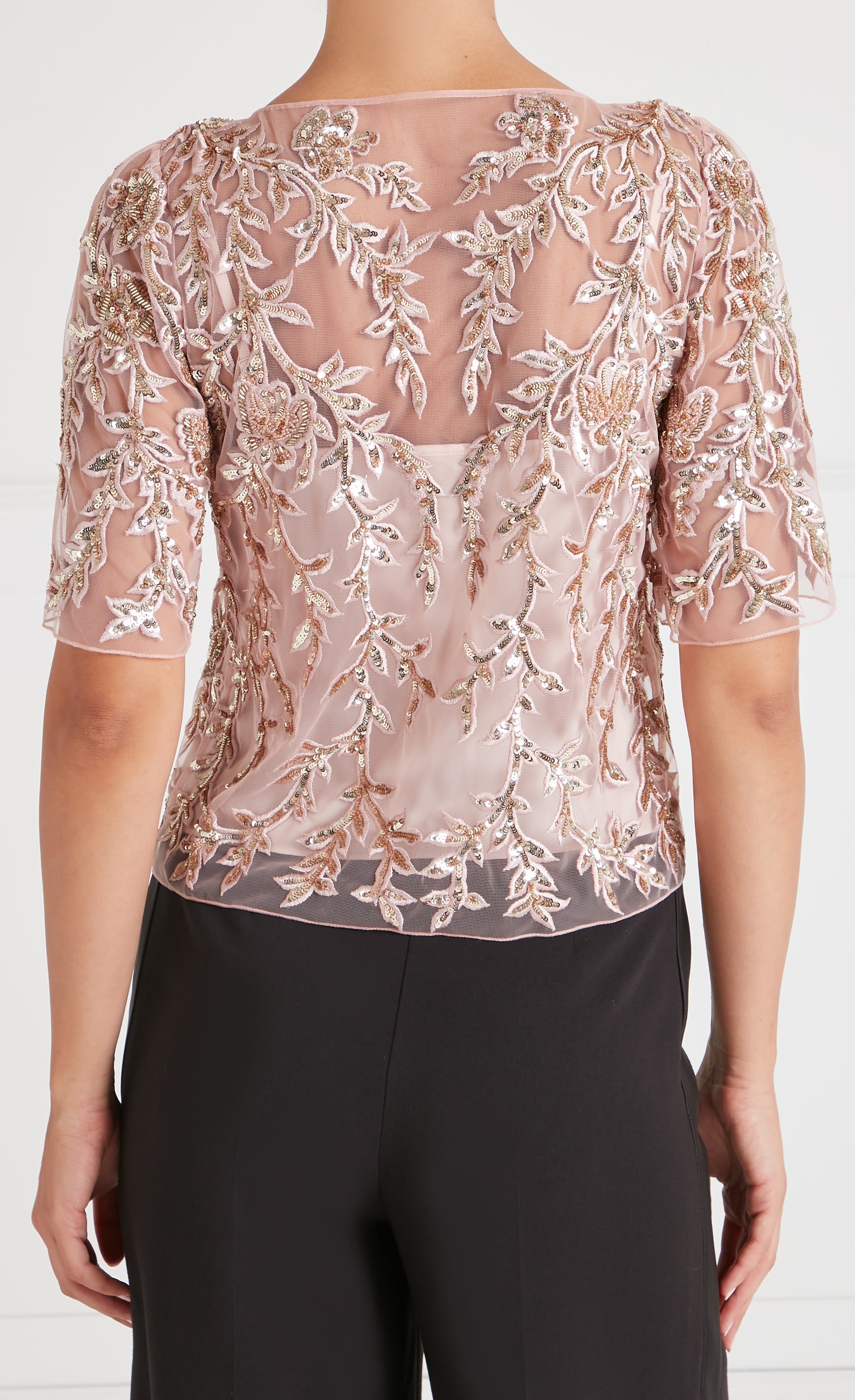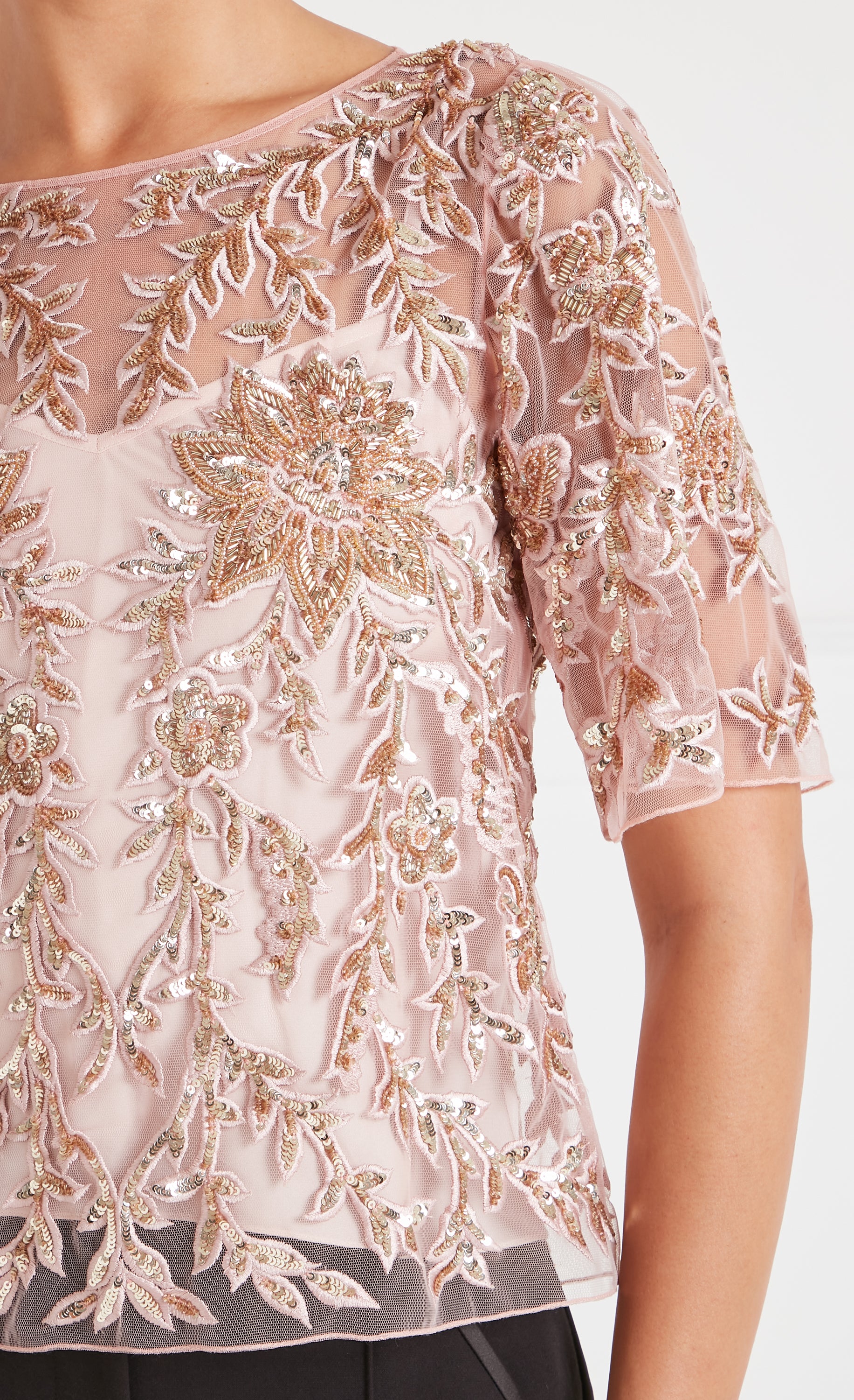 Elegant and intricately detailed, the embellished Genevieve Top is cut in a relaxed silhouette, featuring delicate short sleeves and a softly rounded neckline, exuding effortless femininity. Adorned with shimmering sequins and metallic embroidery, it transitions from day to evening seamlessly.