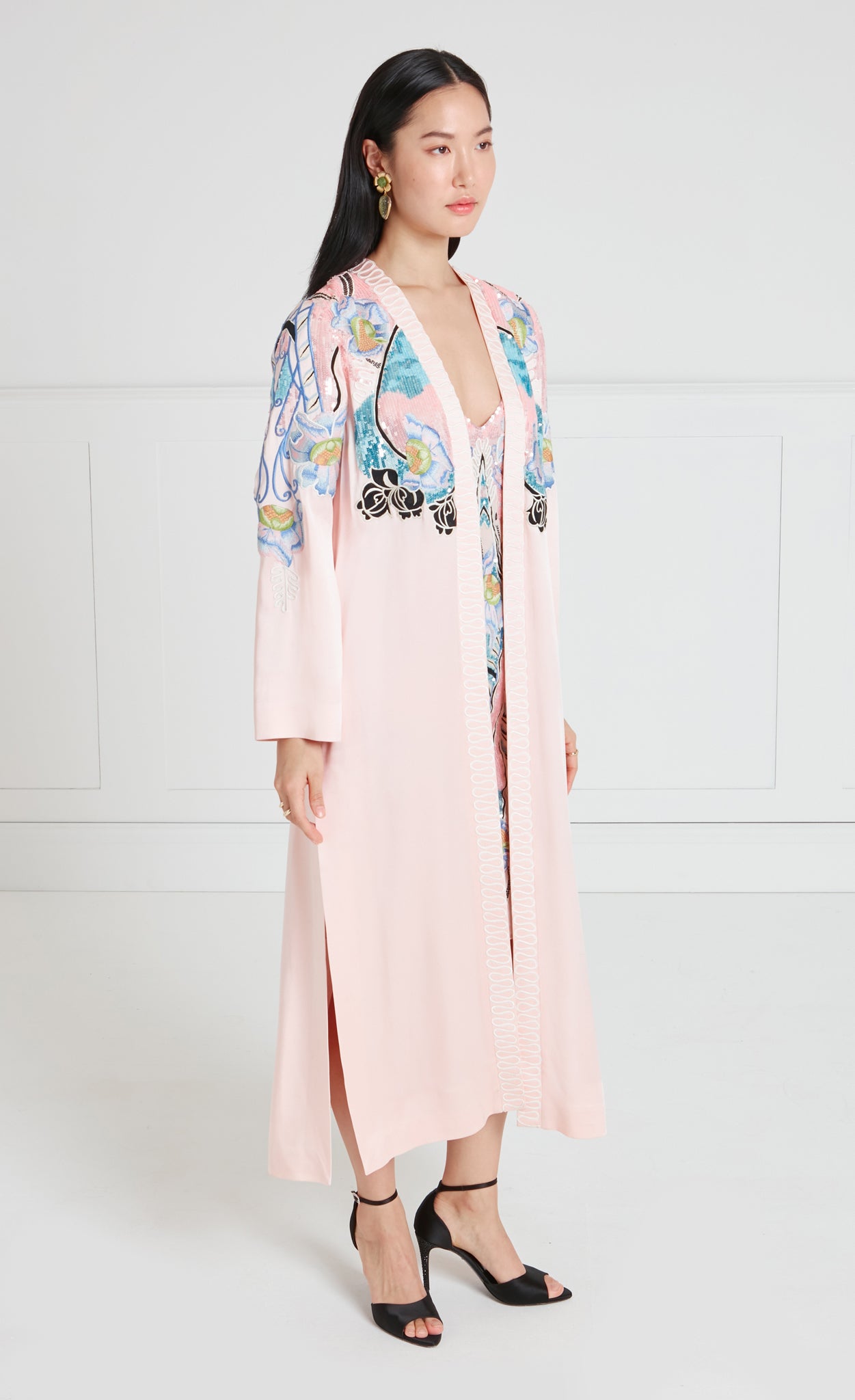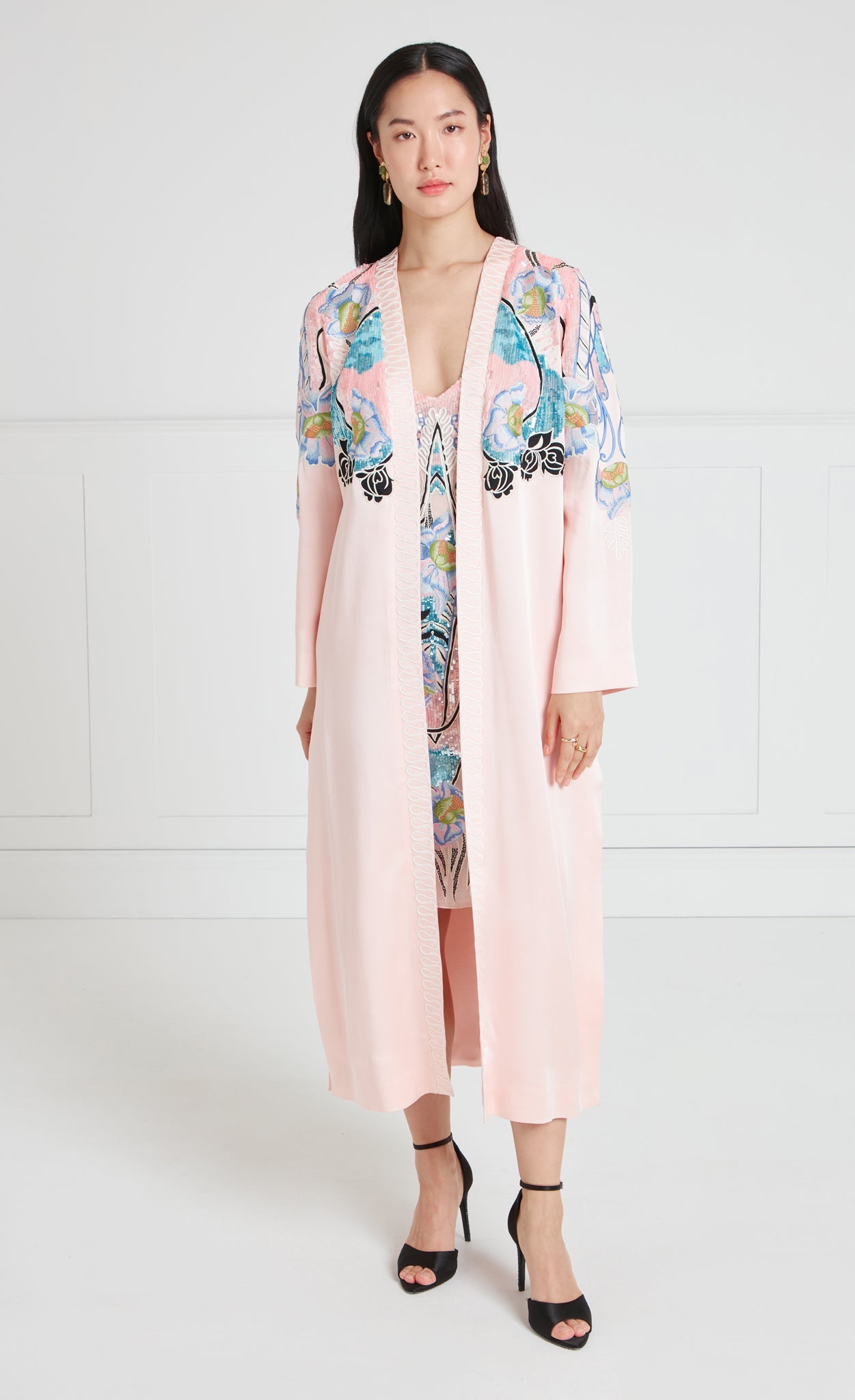 Crafted from a medium crepe satin, the coat has an elegant drape and luxurious weight. The fabric has a soft, velvety feel, which, combined with the artwork, creates dimensional texture and subtle shimmer.