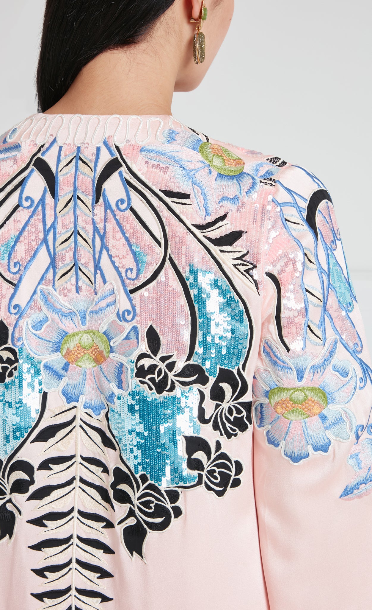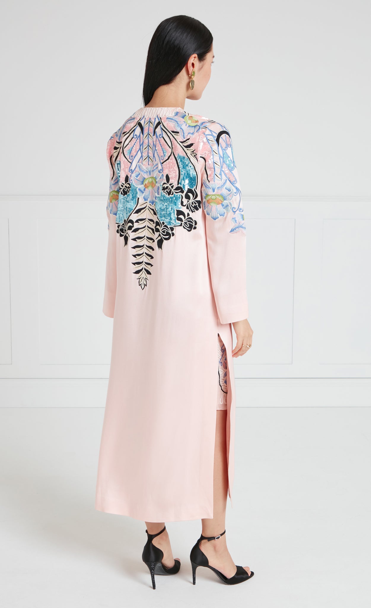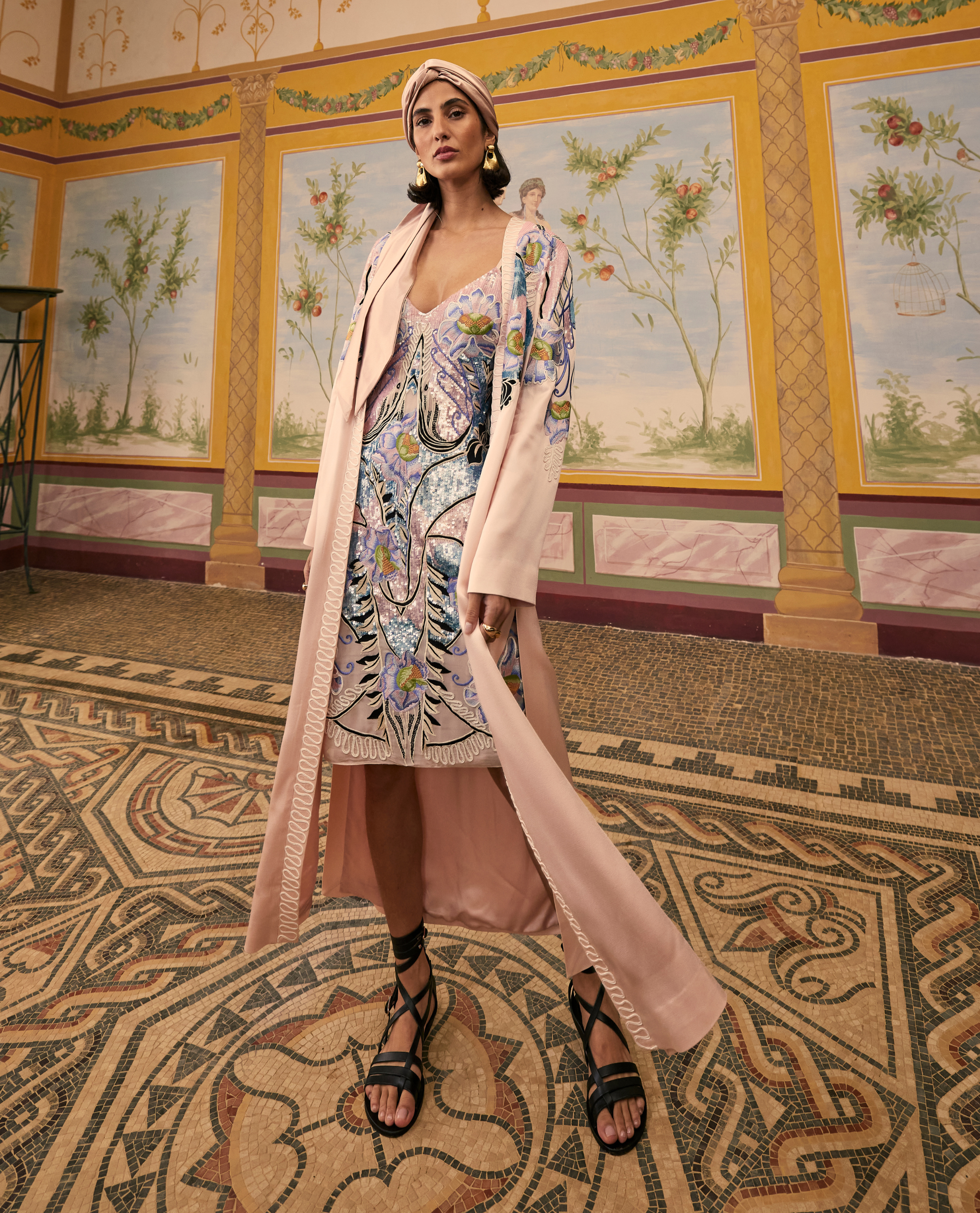 The kimono-style Gracia Coat is a romantic showcase of intricate sequin and stitch embroidery, featuring bold floral motifs inspired by Spanish Art Nouveau. It’s a striking choice for statement daywear or evening occasions, especially when teamed with the Gracia Mini Dress.