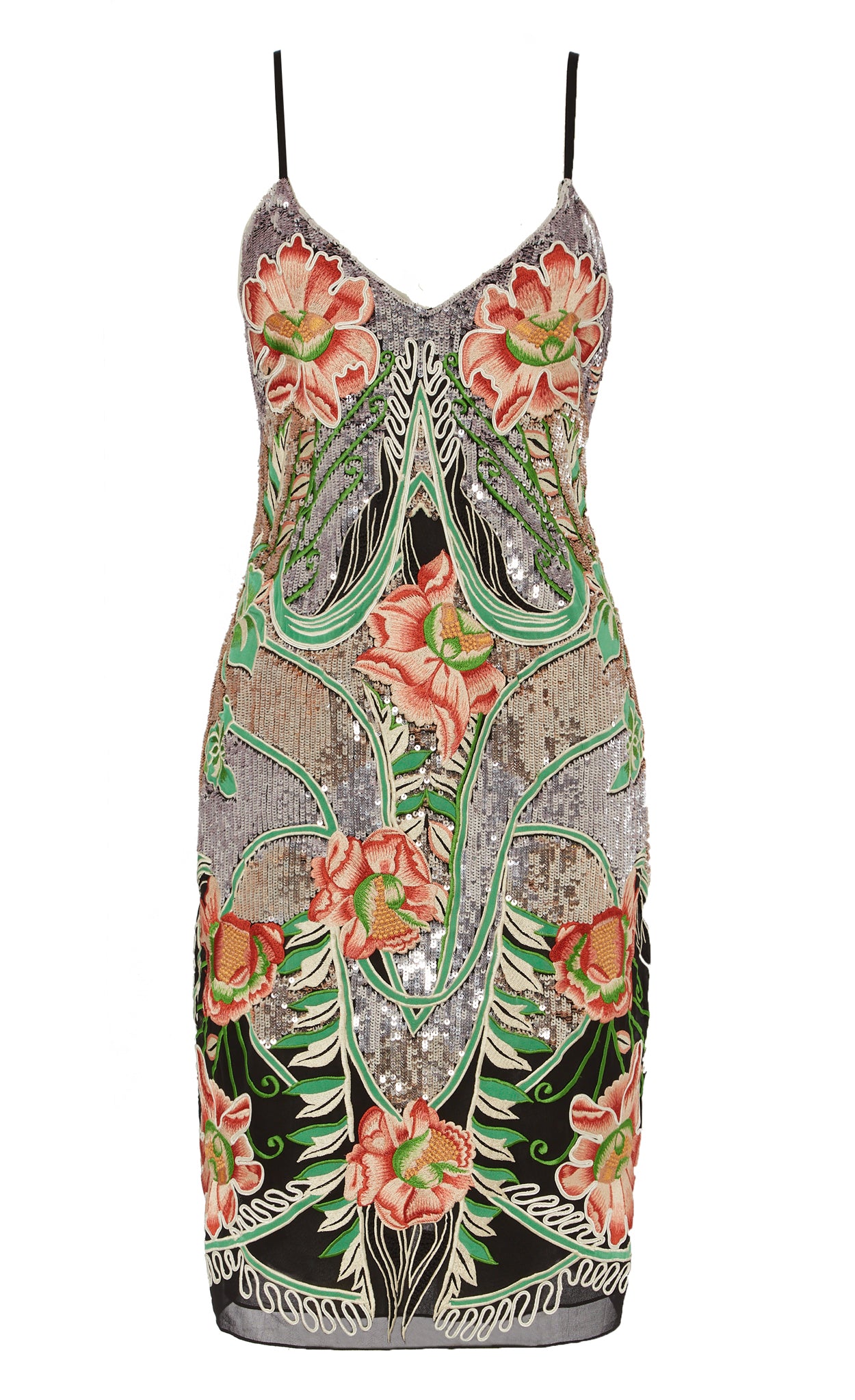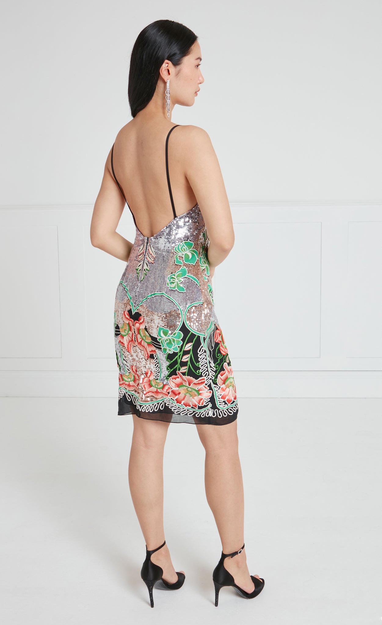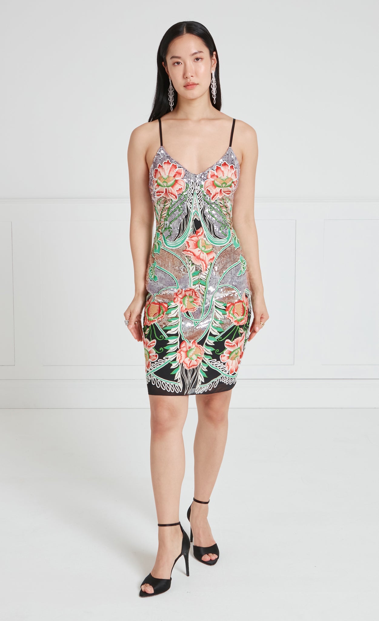 The Gracia Mini Dress is a feminine slip dress shape with bold sequinwork and textured stitch embroidery. It features glamorous and shimmering floral motifs, inspired... More.