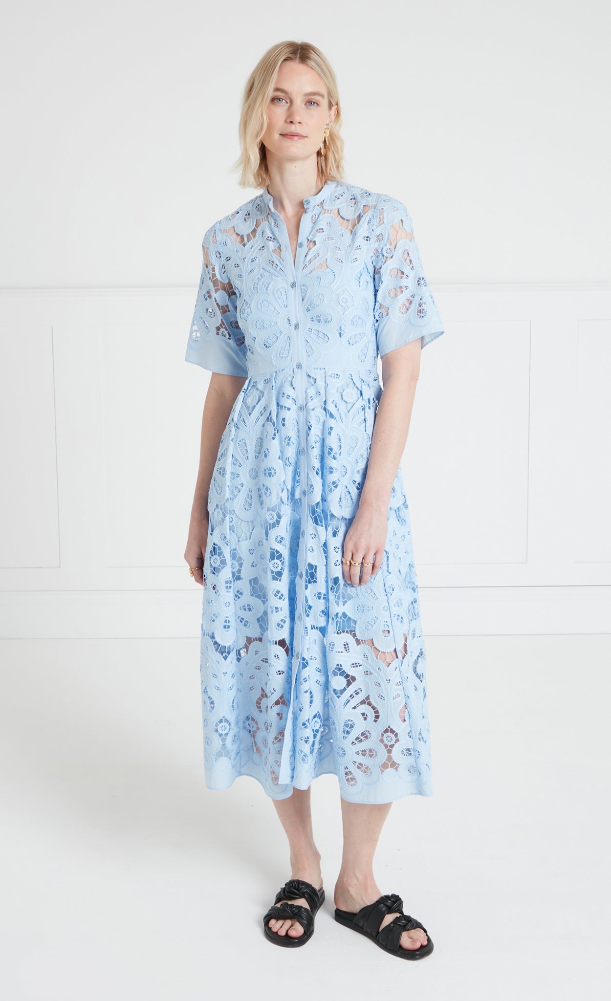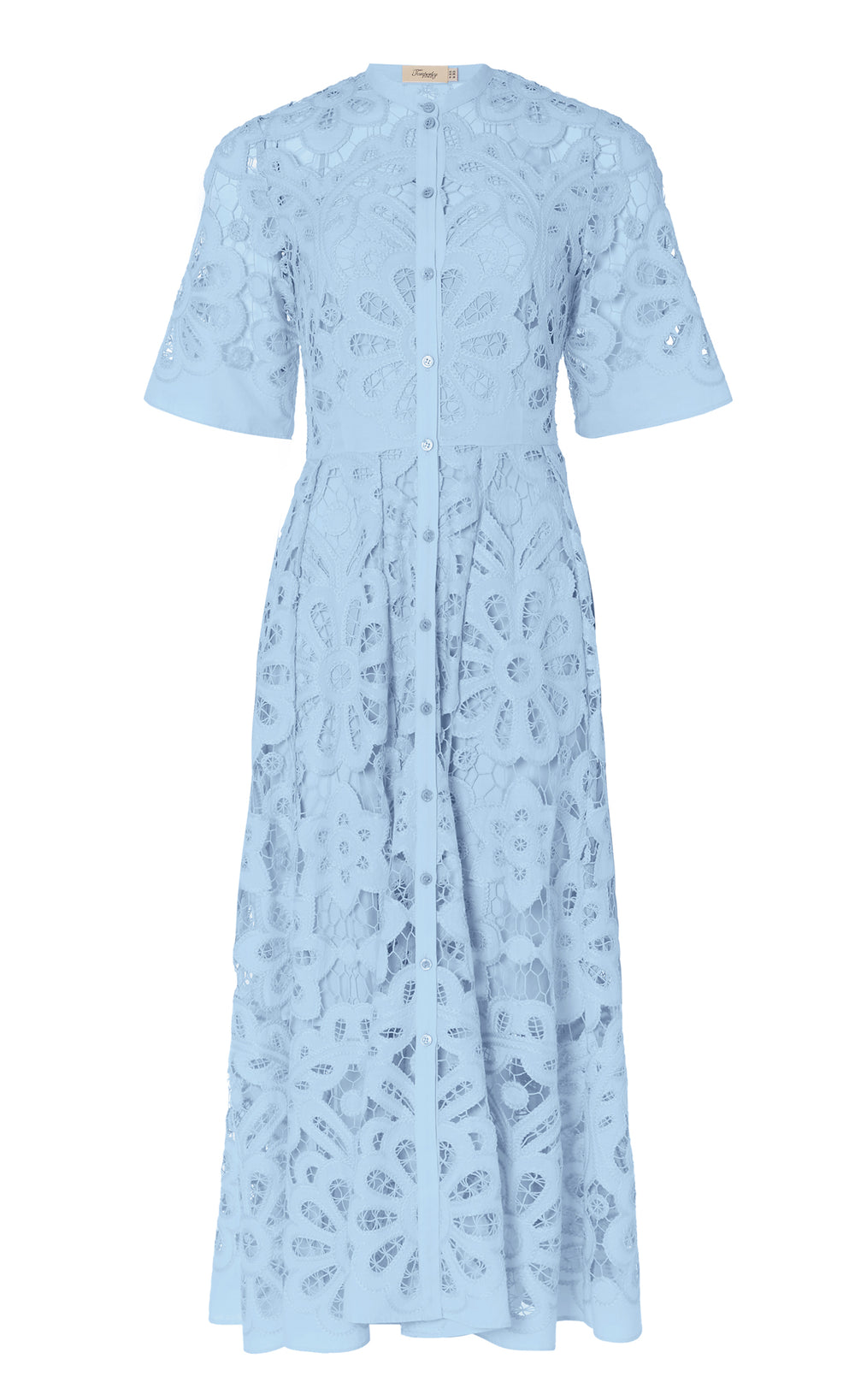 The Guinevere shirt dress is an airy and elegant silhouette, showcasing intricate broderie anglaise, suitable for both casual and cocktail occasions. The shape has a waisted fit, flattering the waistline.