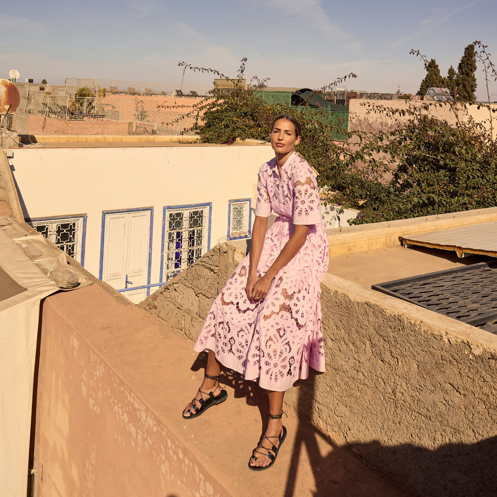 The Guinevere shirt dress is an airy and elegant silhouette, showcasing intricate broderie anglaise, suitable for both casual and cocktail occasions. The shape has a waisted fit, flattering the waistline.