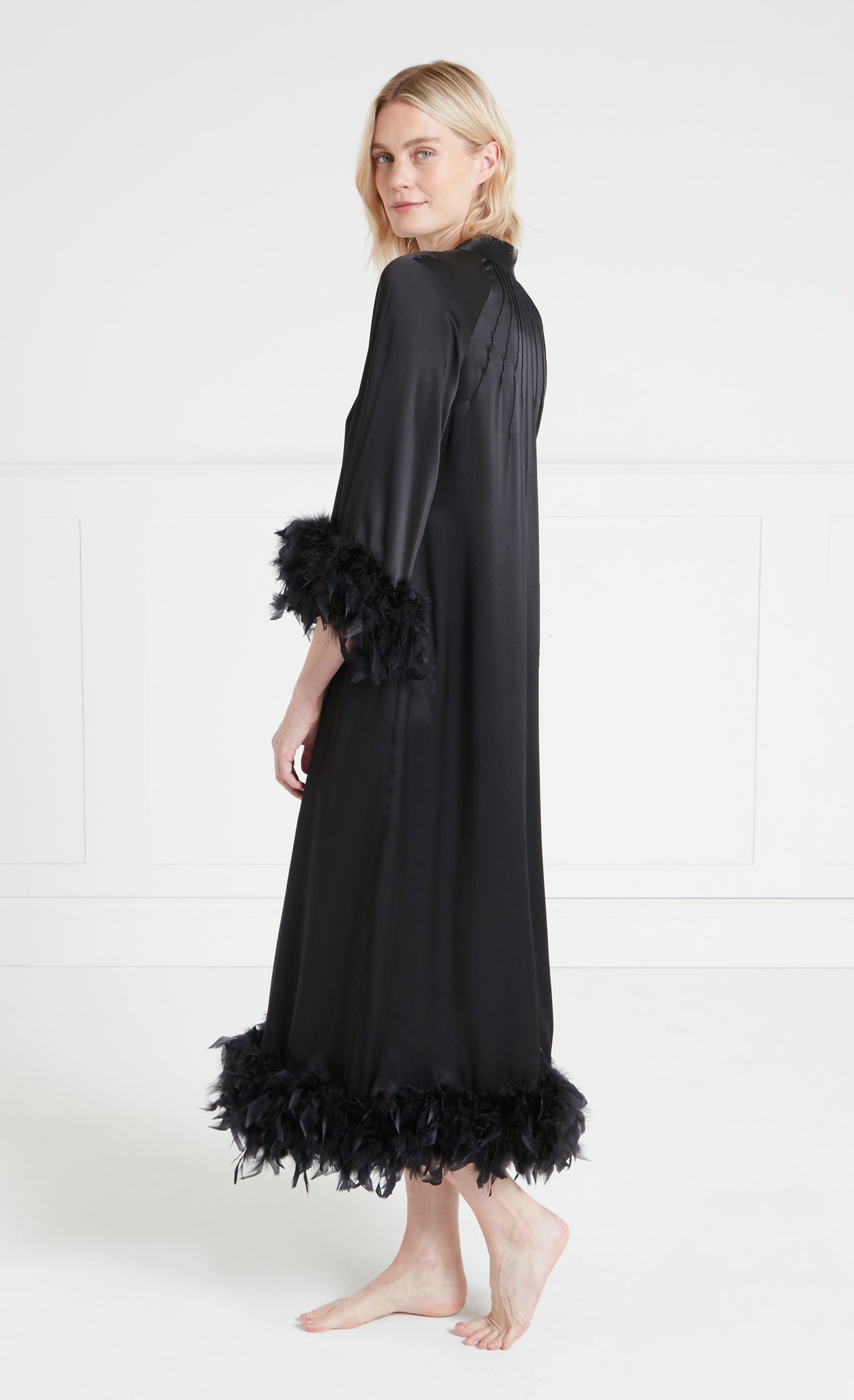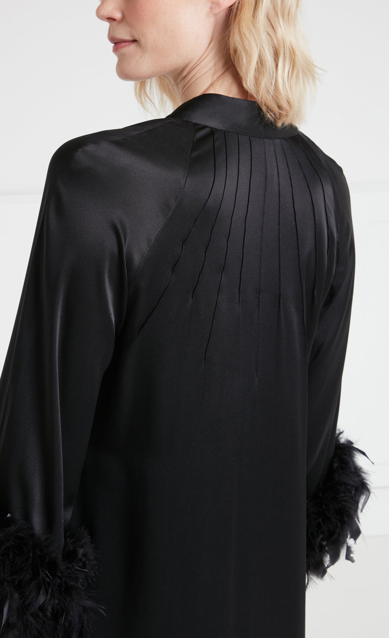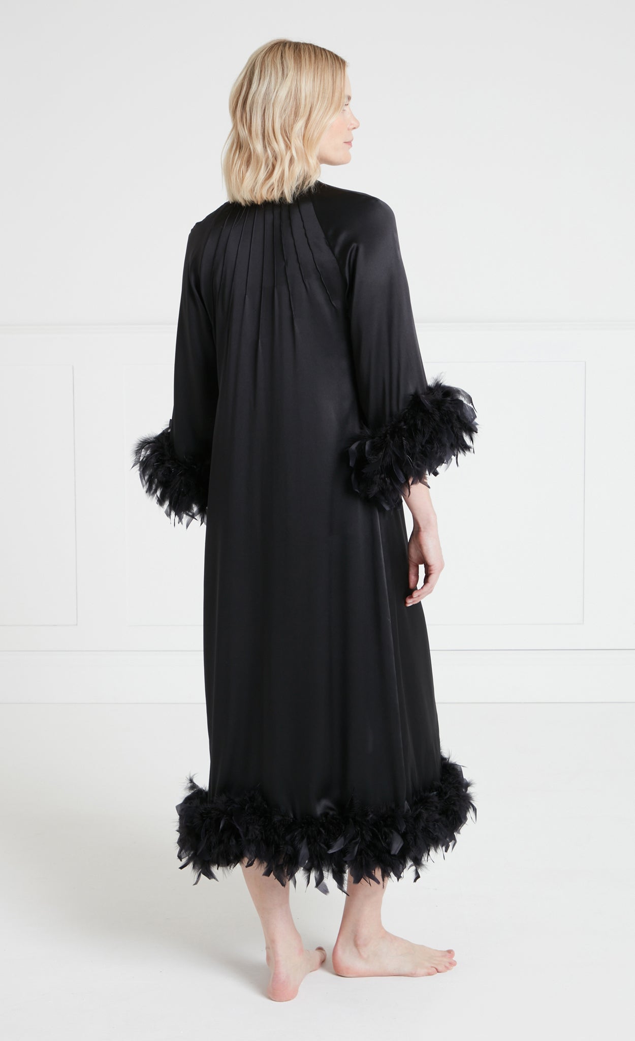 The silk satin Hebe robe features feathered hems, full-length raglan sleeves and a deep V-neckline with a removable belt to cinch in the waist, allowing... More.