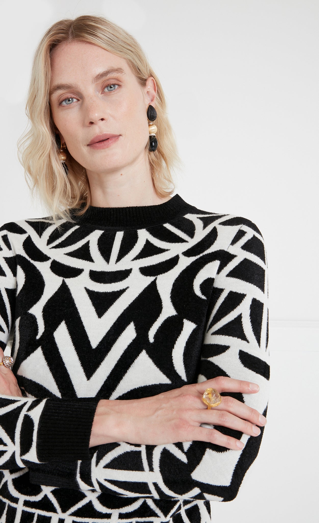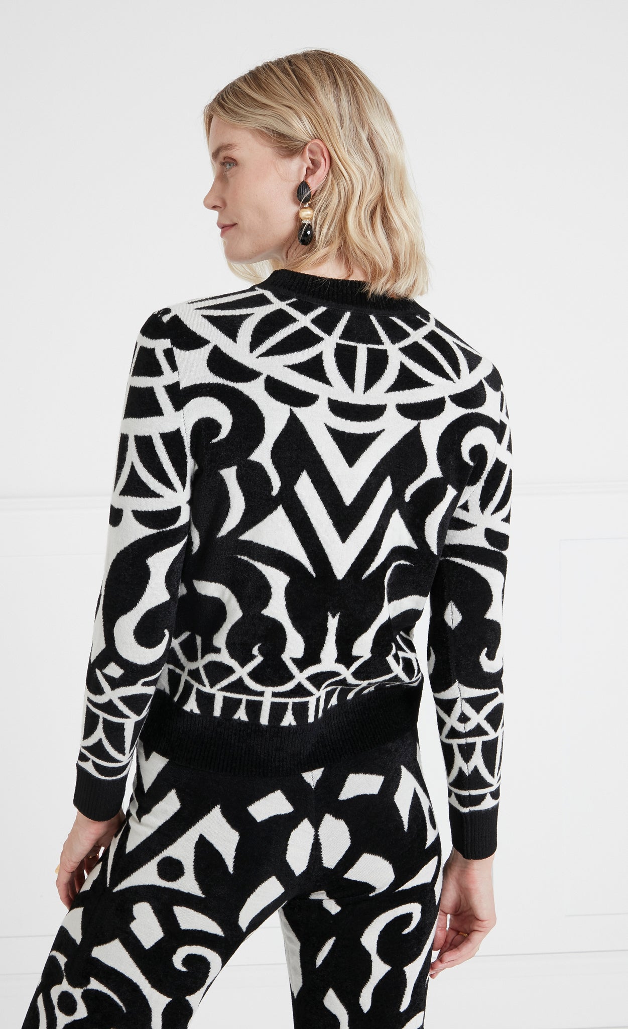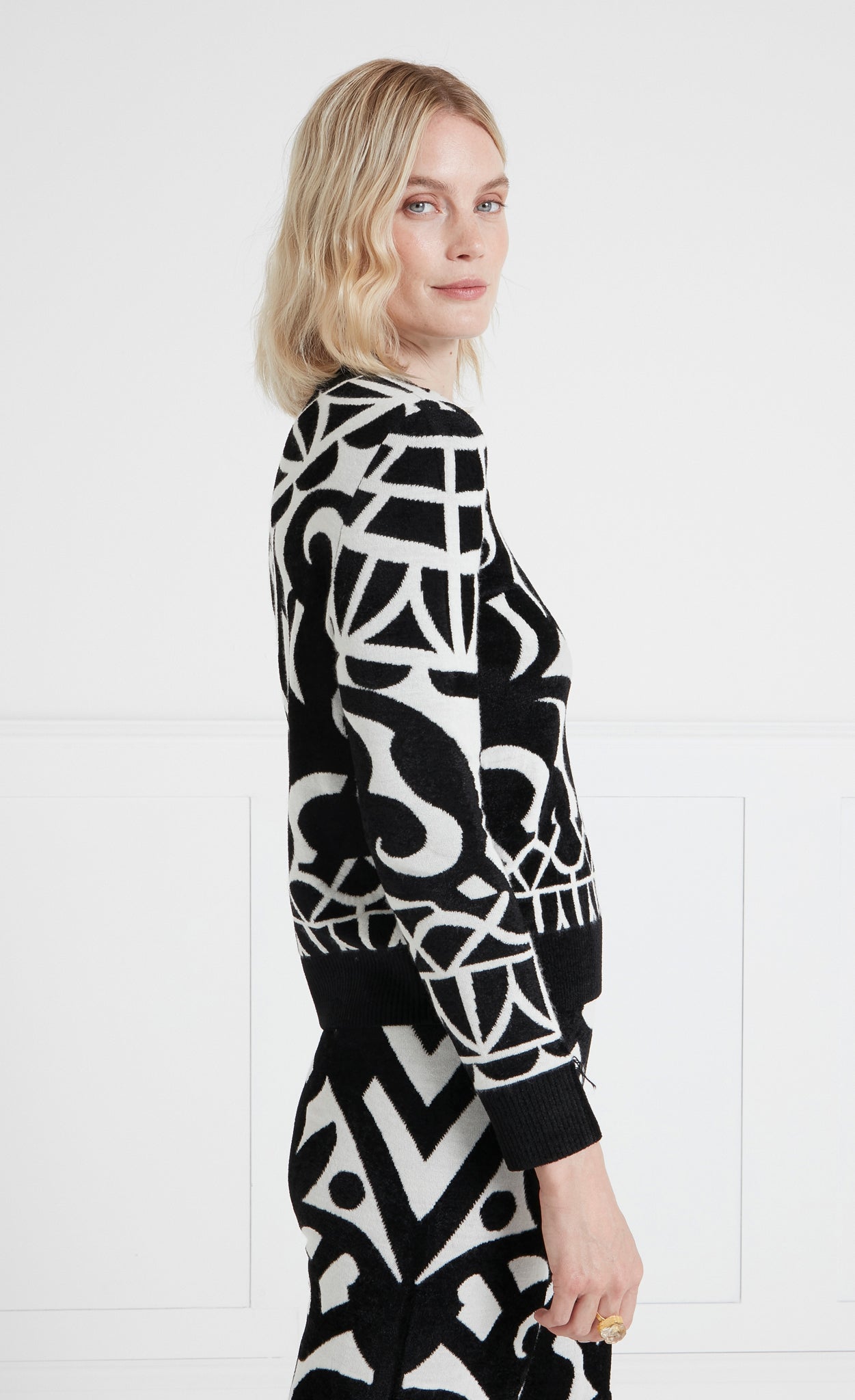A contemporary take on the monochrome Art Deco textiles of the thirties, featuring a striking geometric print, the Jani story comprises three standout knitwear styles. Creating a neat, form-fitting silhouette, worn together or apart, each piece is endlessly versatile.