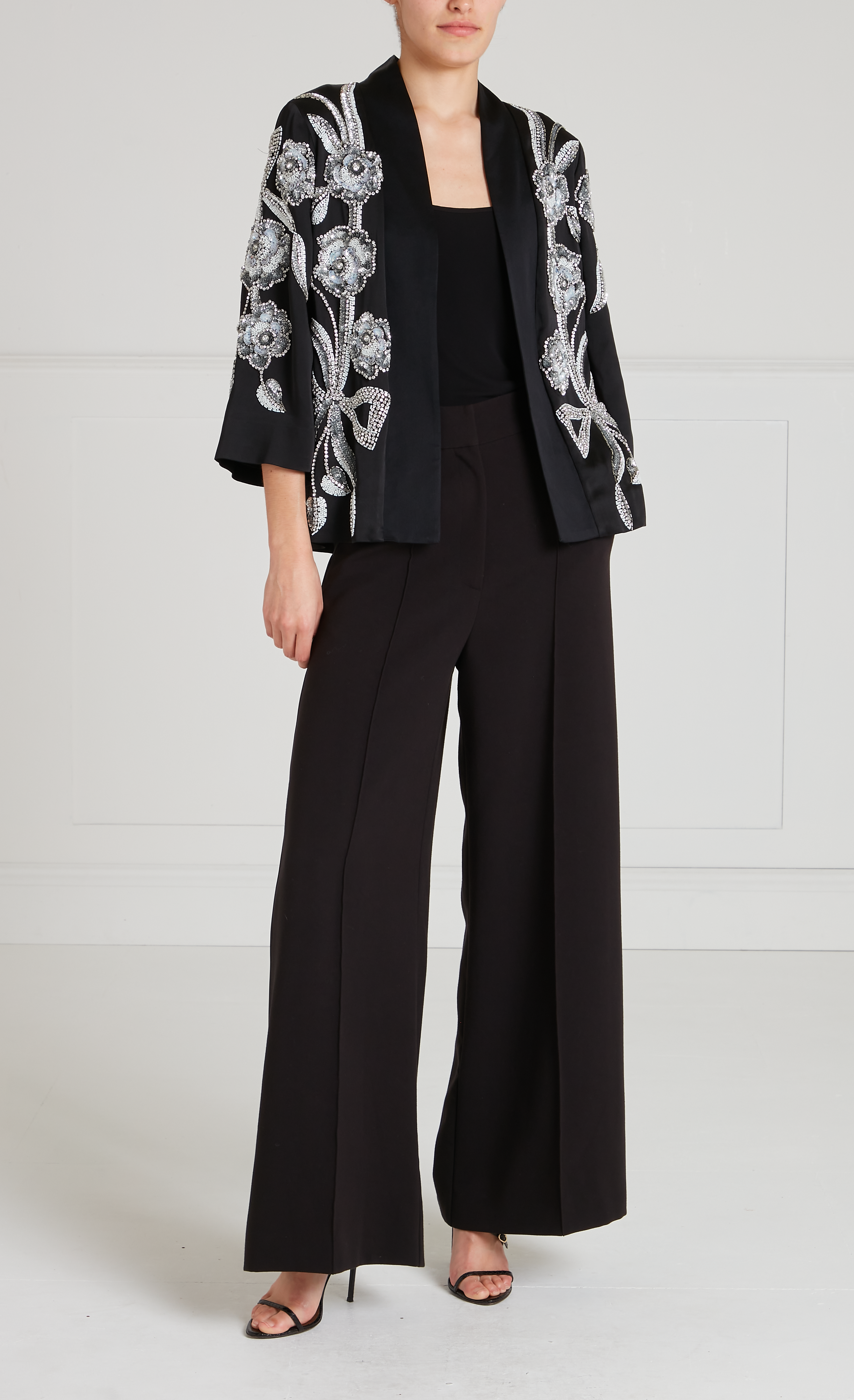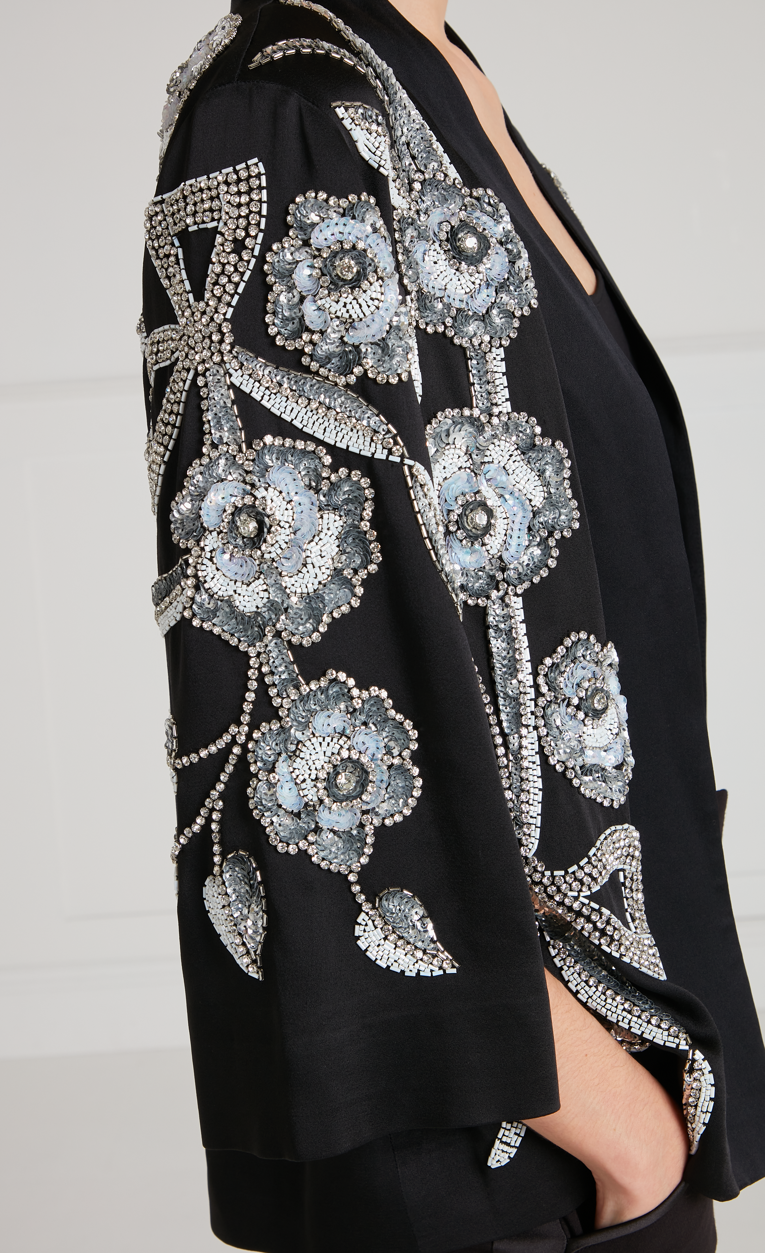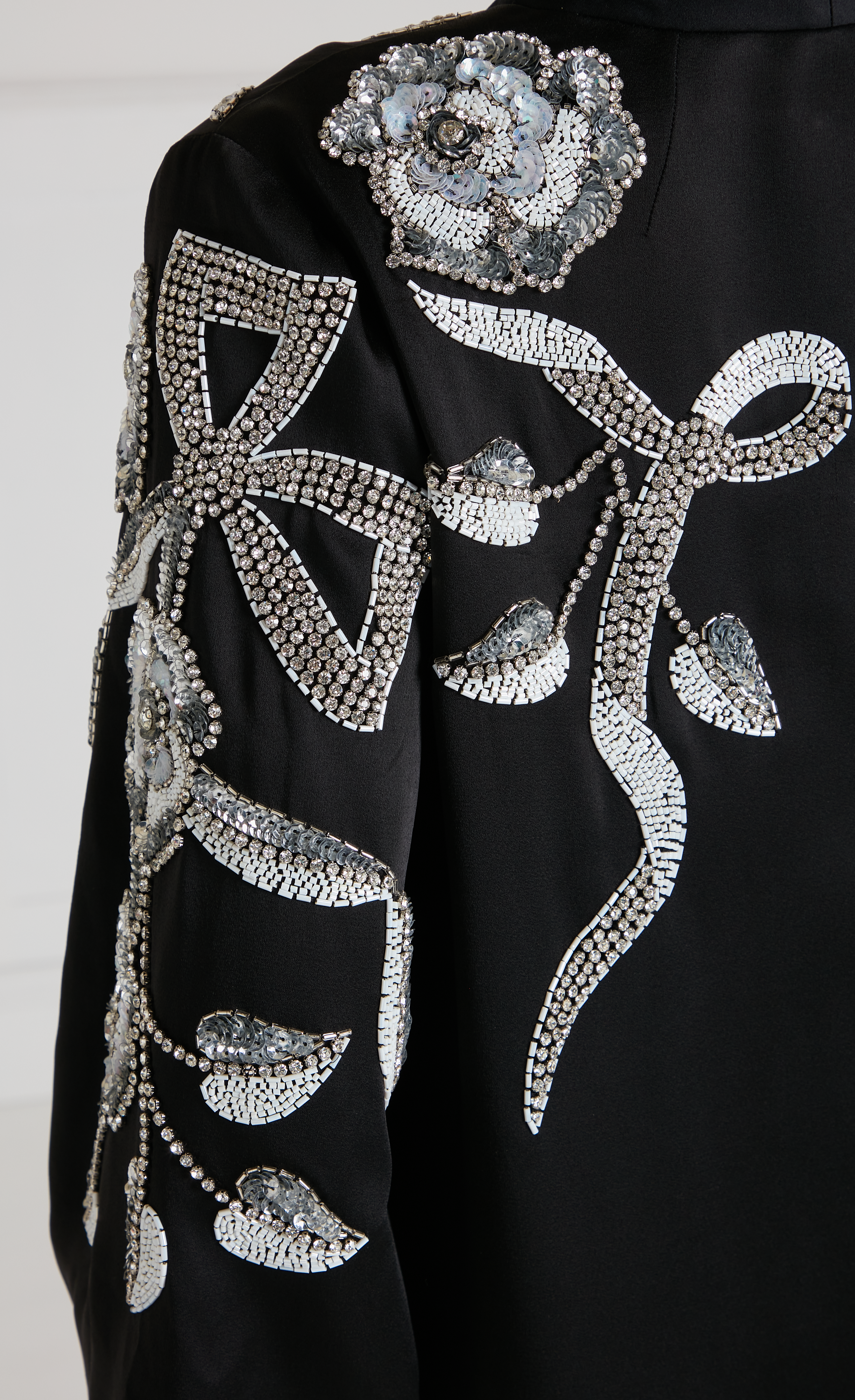 This black jacket features silver embroidery of ribbons and roses in a dramatic yet relaxed fit. Made with crepe satin, perfect for elevating casual wear... More.