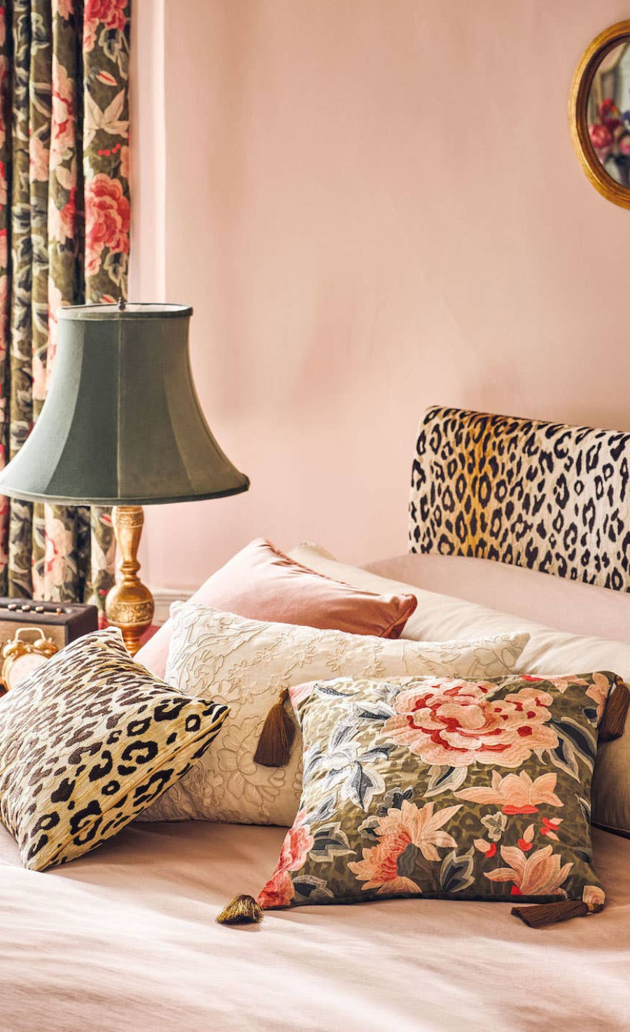 A showstopping cushion featuring richly embroidered flowers on a leopard spot jacquard, complete with sophisticated corner tassels. Coordinating Saskia leopard jacquard weave provides an opulent... More.