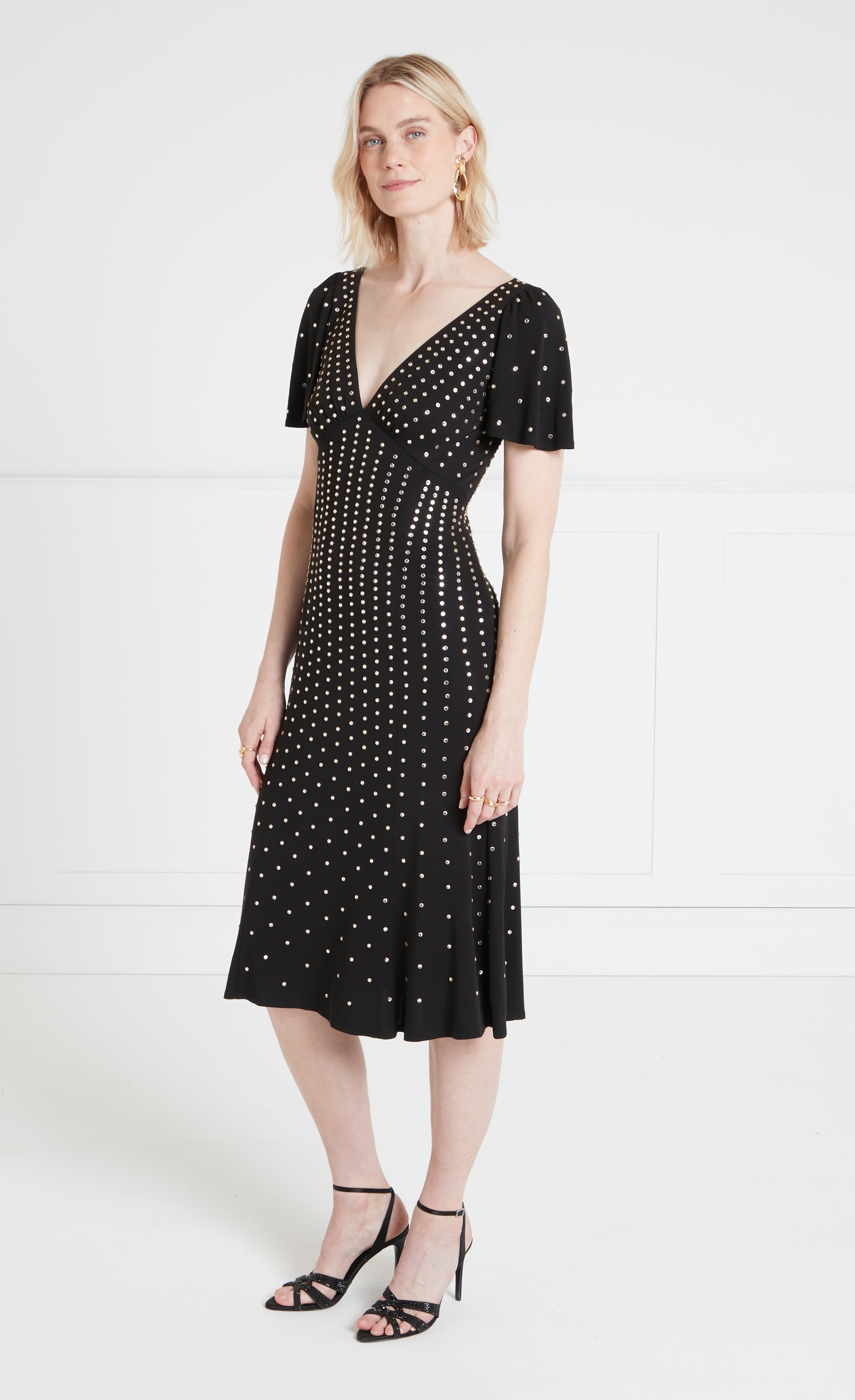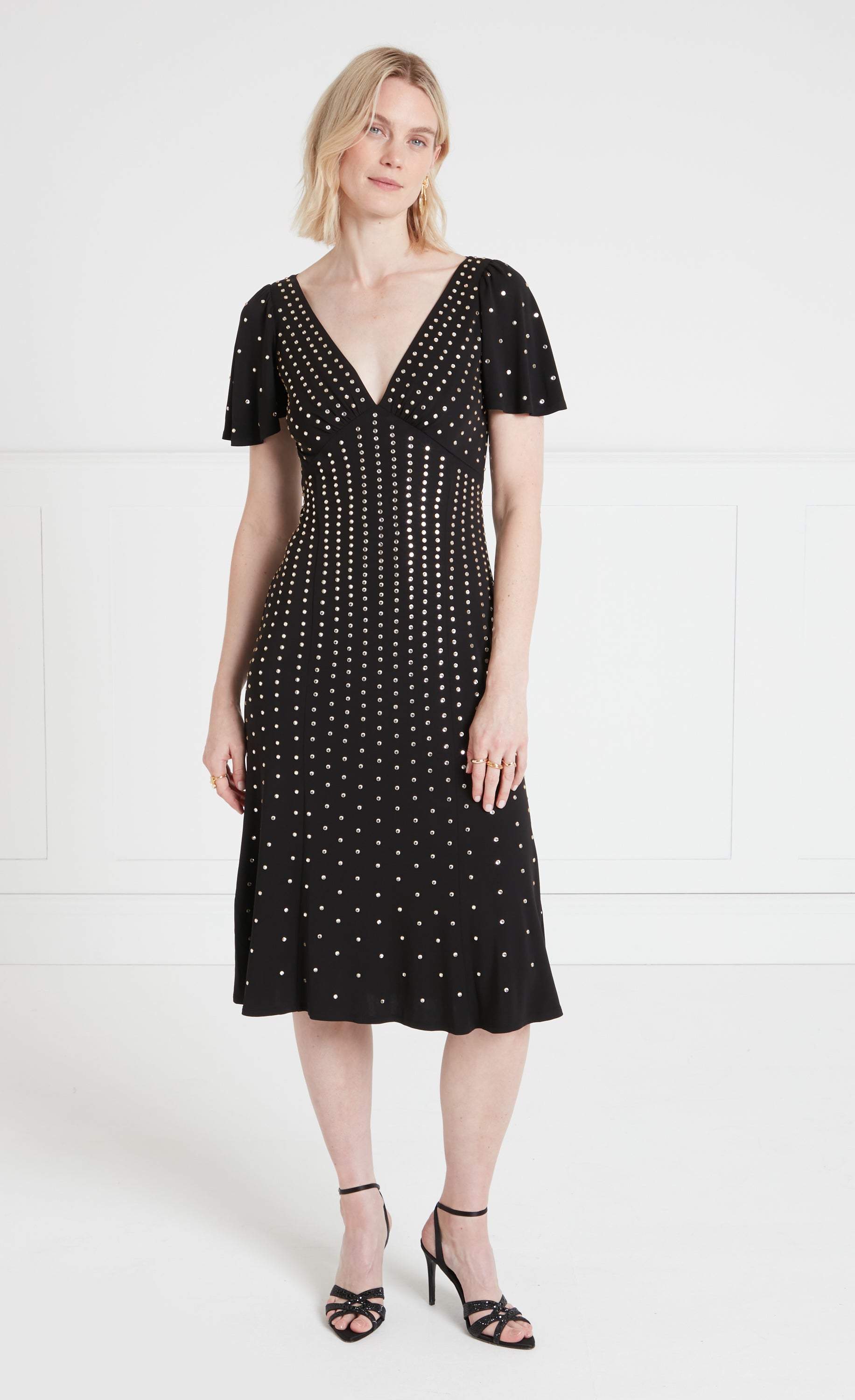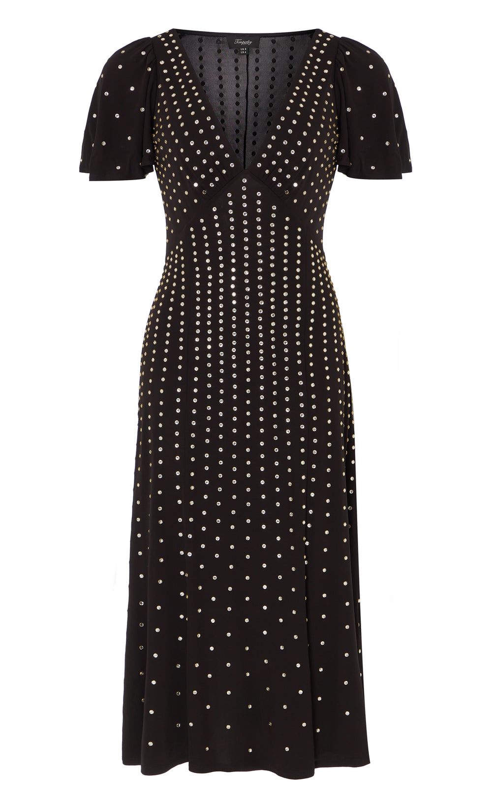Dazzling gold-ringed rhinestone hotfix artwork has been strategically placed to flatter the body; dense at the top and gradually fading as the design flows downward.