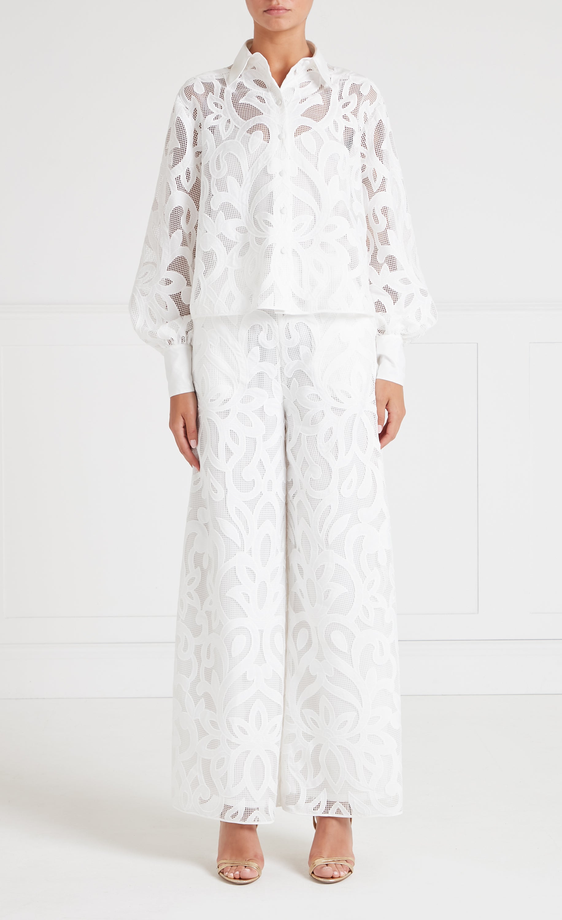 Make a statement in the Louis wide-leg trousers, cut from sheer lace with bold embroidered patterns. Designed with a high waist and fluid silhouette, they balance structure with movement, making them an effortless choice for both evening and occasion wear.