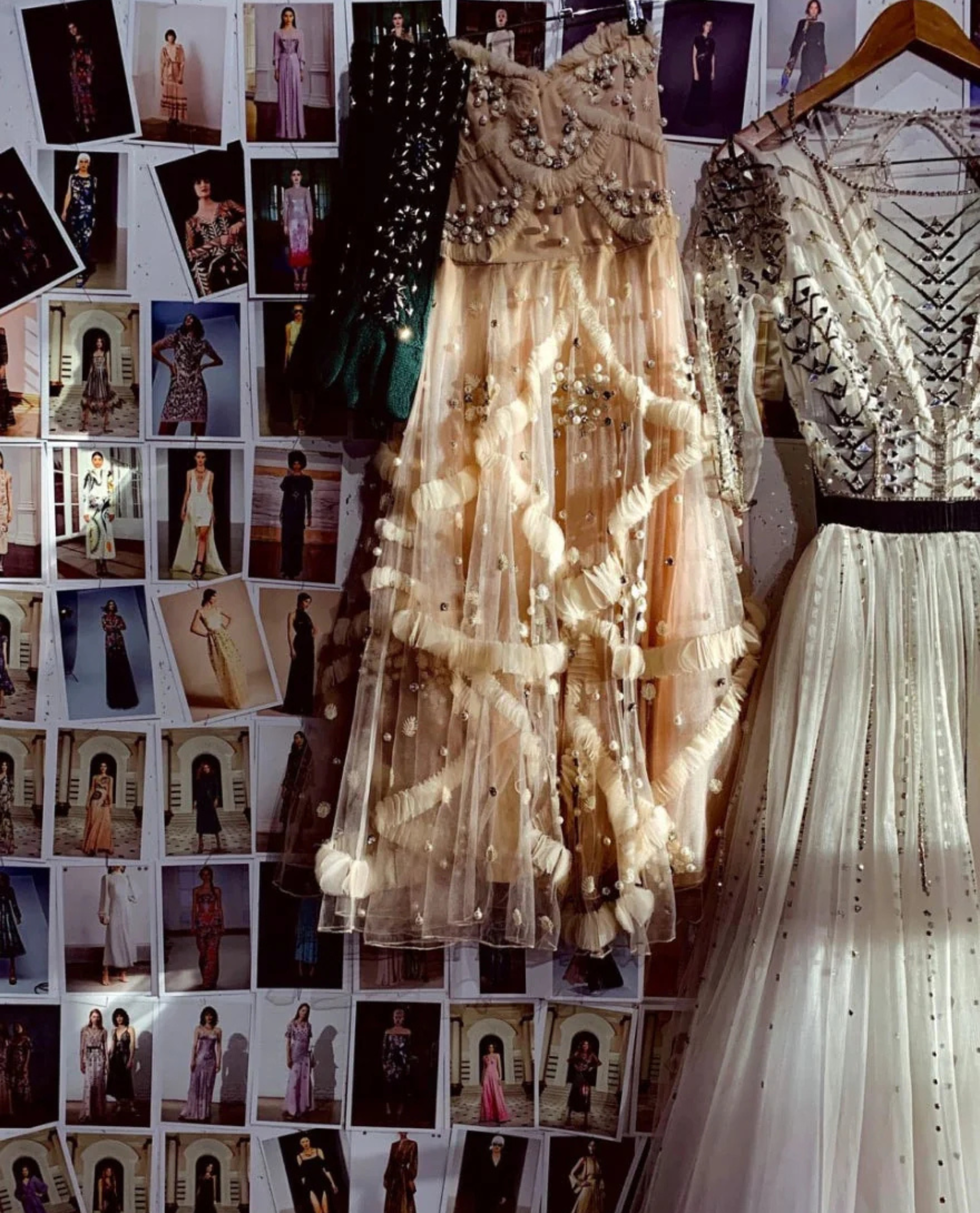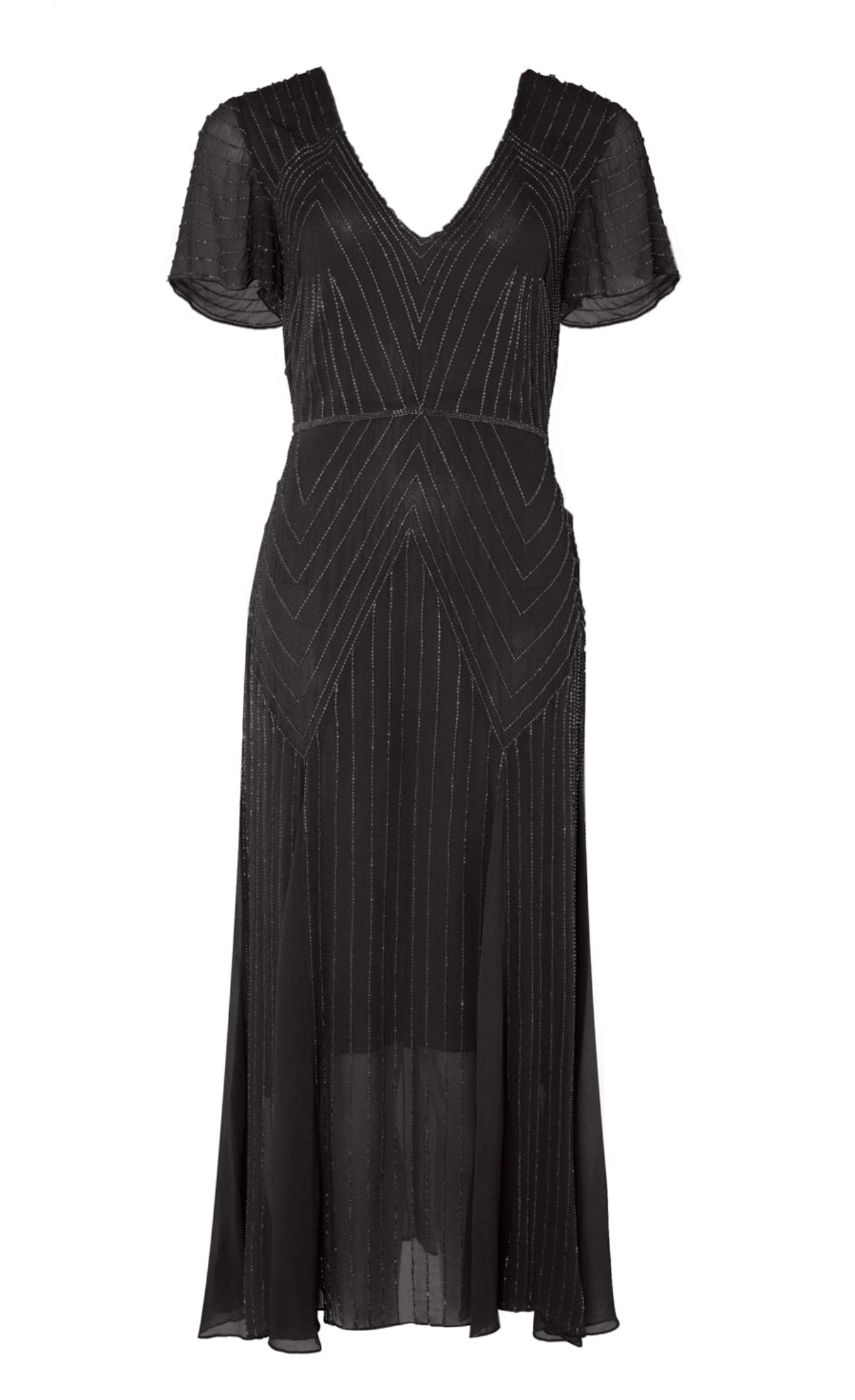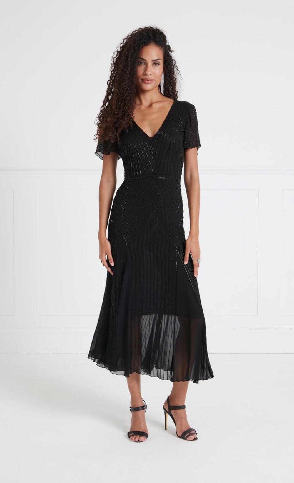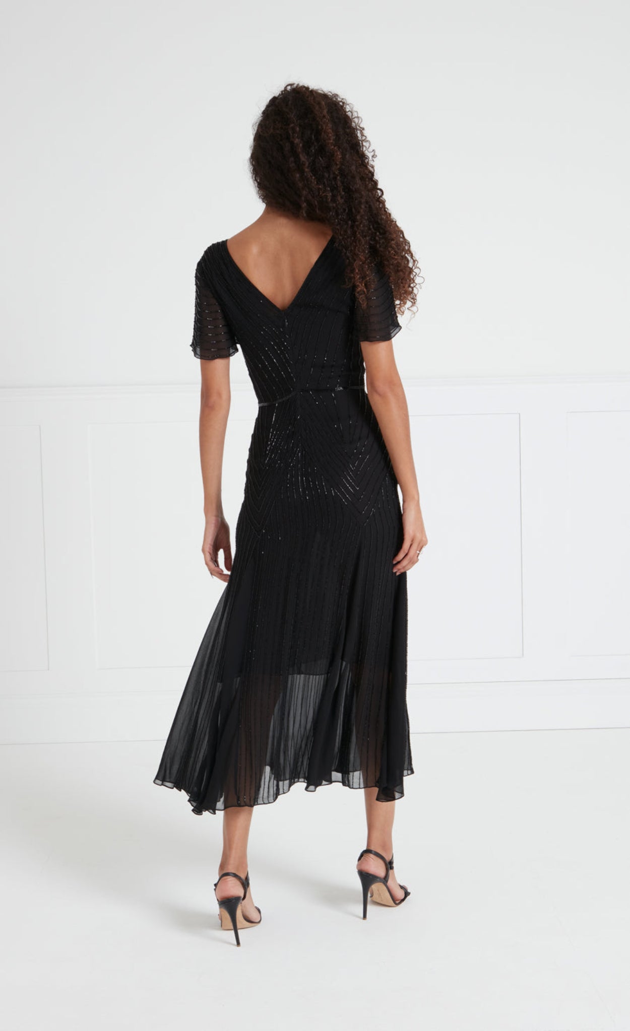 The flattering contour effect has been achieved by careful engineering, beaded by hand with bugle beads. Viscose georgette is a vegan alternative to silk, chosen for its fluid drape and crisp texture, ensuring both durability and lightweight comfort.