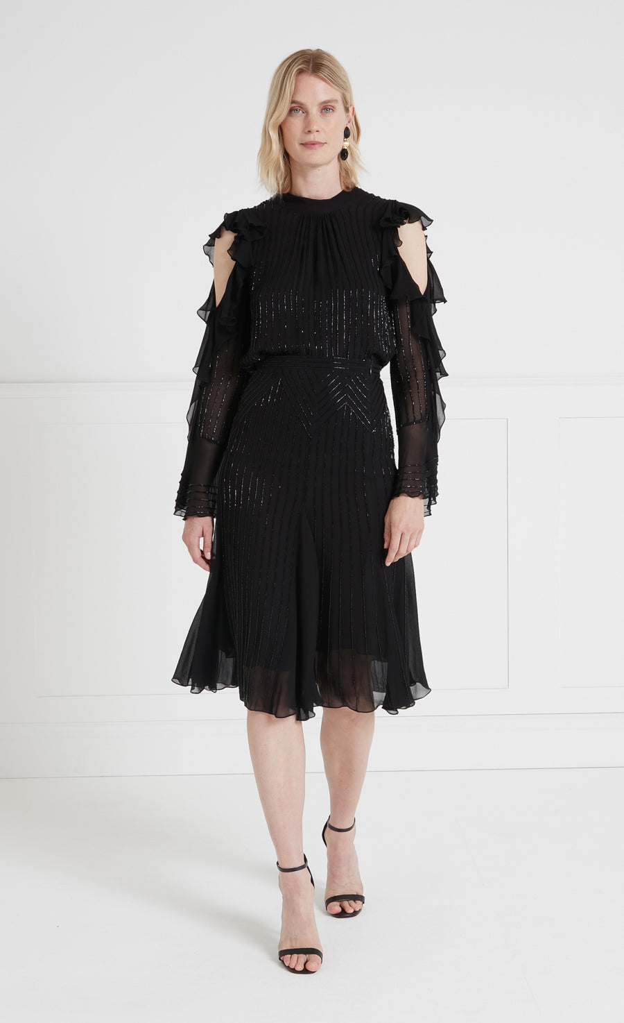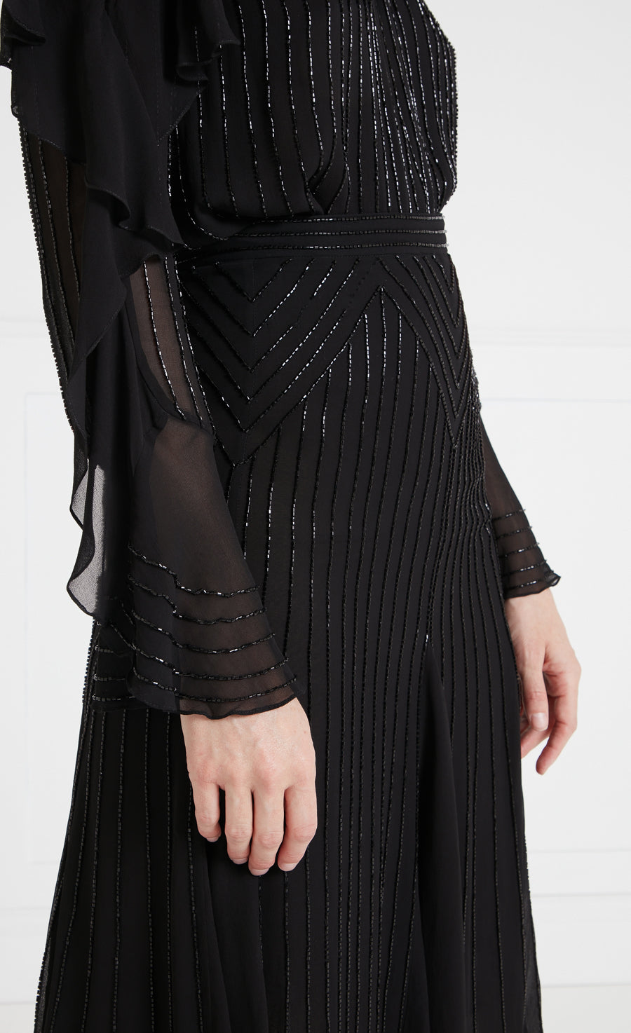 A modern homage to late 1920s glamour, the Neptune story is designed to move effortlessly from day to evening. Art Deco-inspired stripes that contour and illuminate the silhouette. Light, fluid, and intricately detailed, it captures the spirit of timeless craftsmanship synonymous with Temperley.