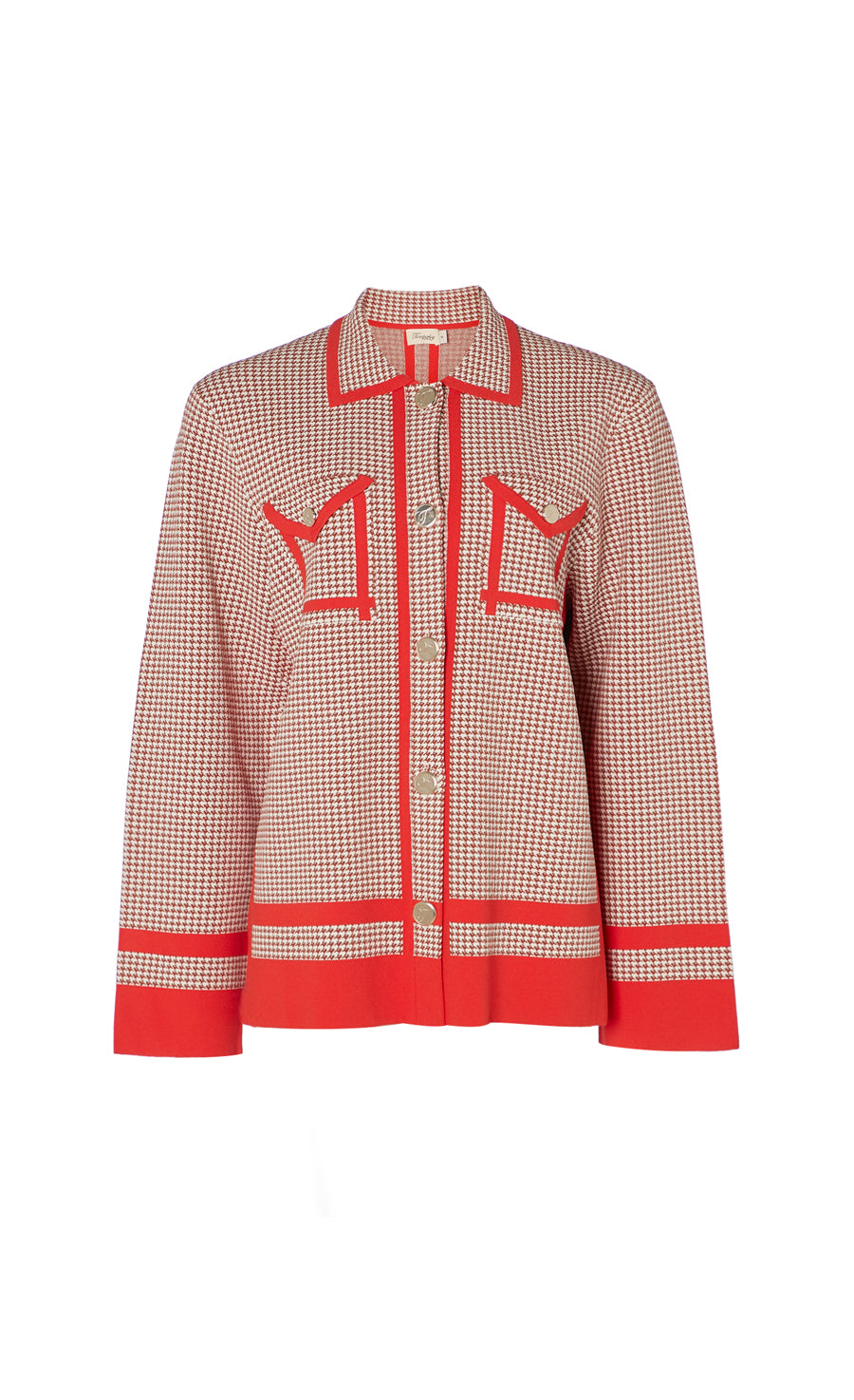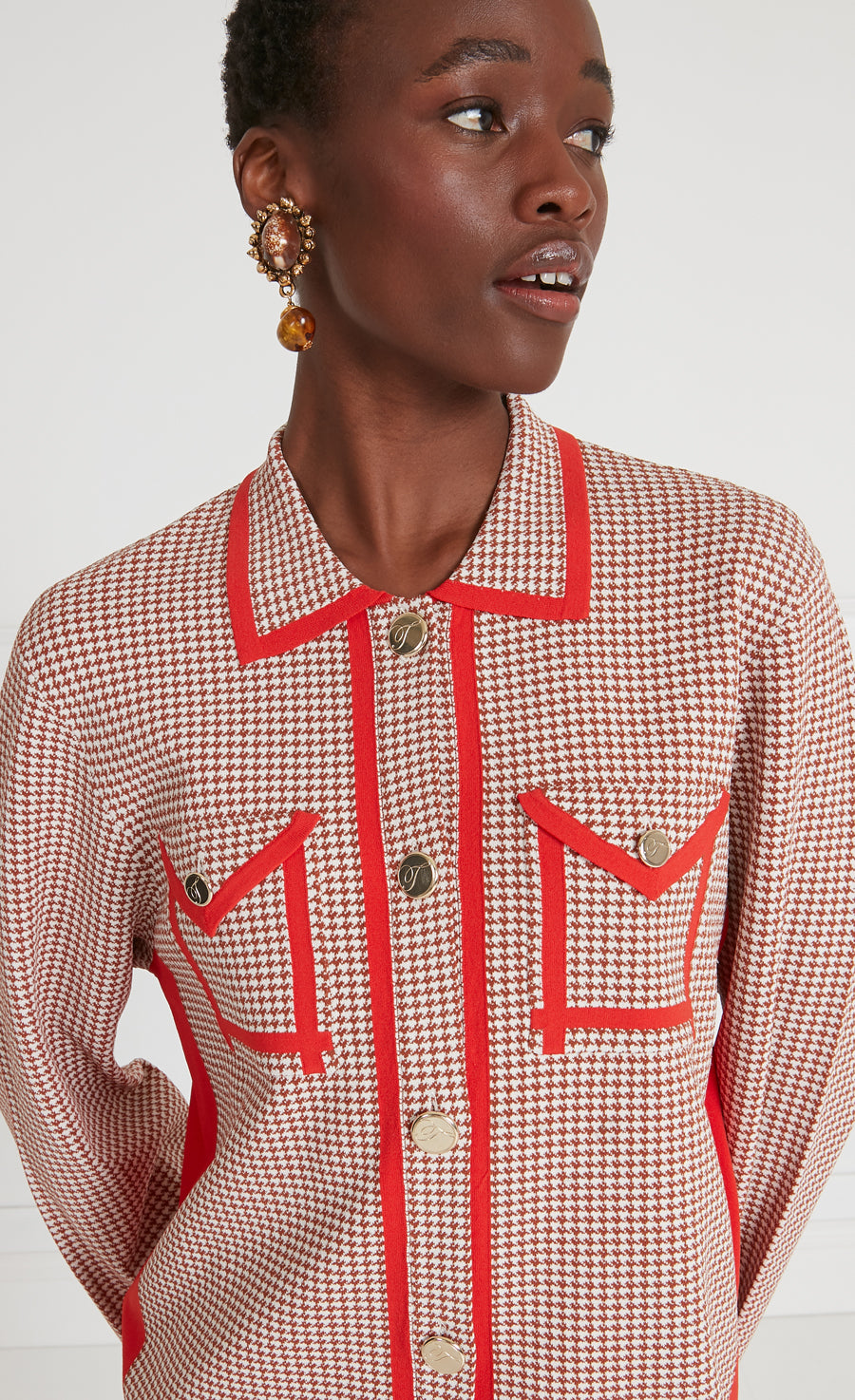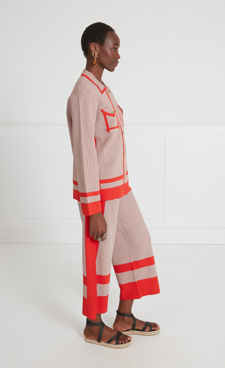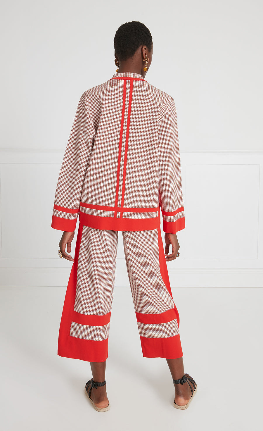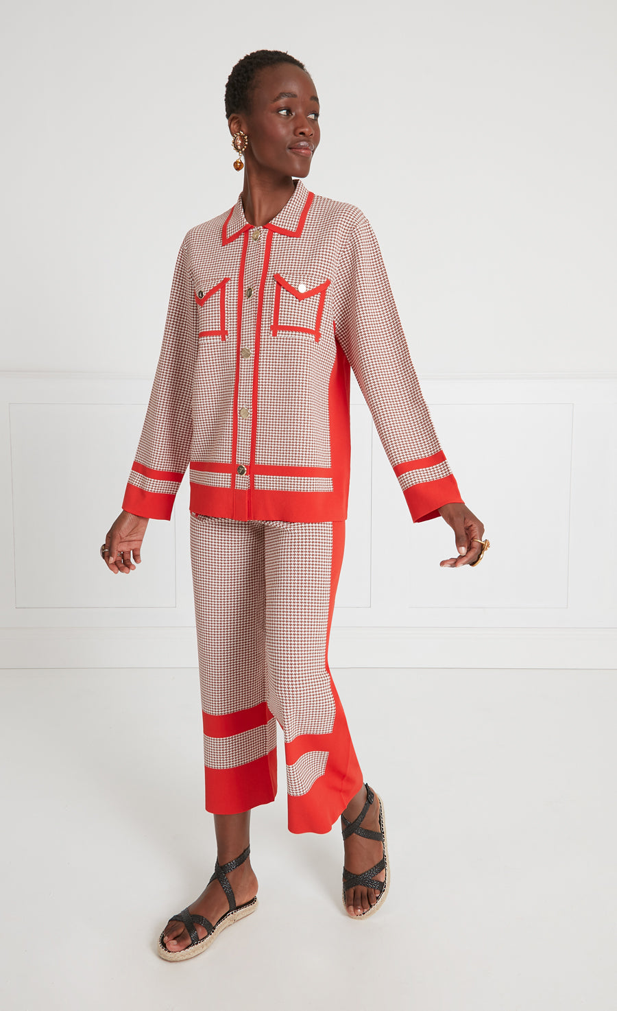 A striking and snappy knit two-piece, the Orelie story comprises a jacket and trouser, with a structured stretch finish combining comfort and support. With a bold colour block design, sharp stripes framing a classic houndstooth weave, the soft tailoring makes for an effortlessly characterful look.