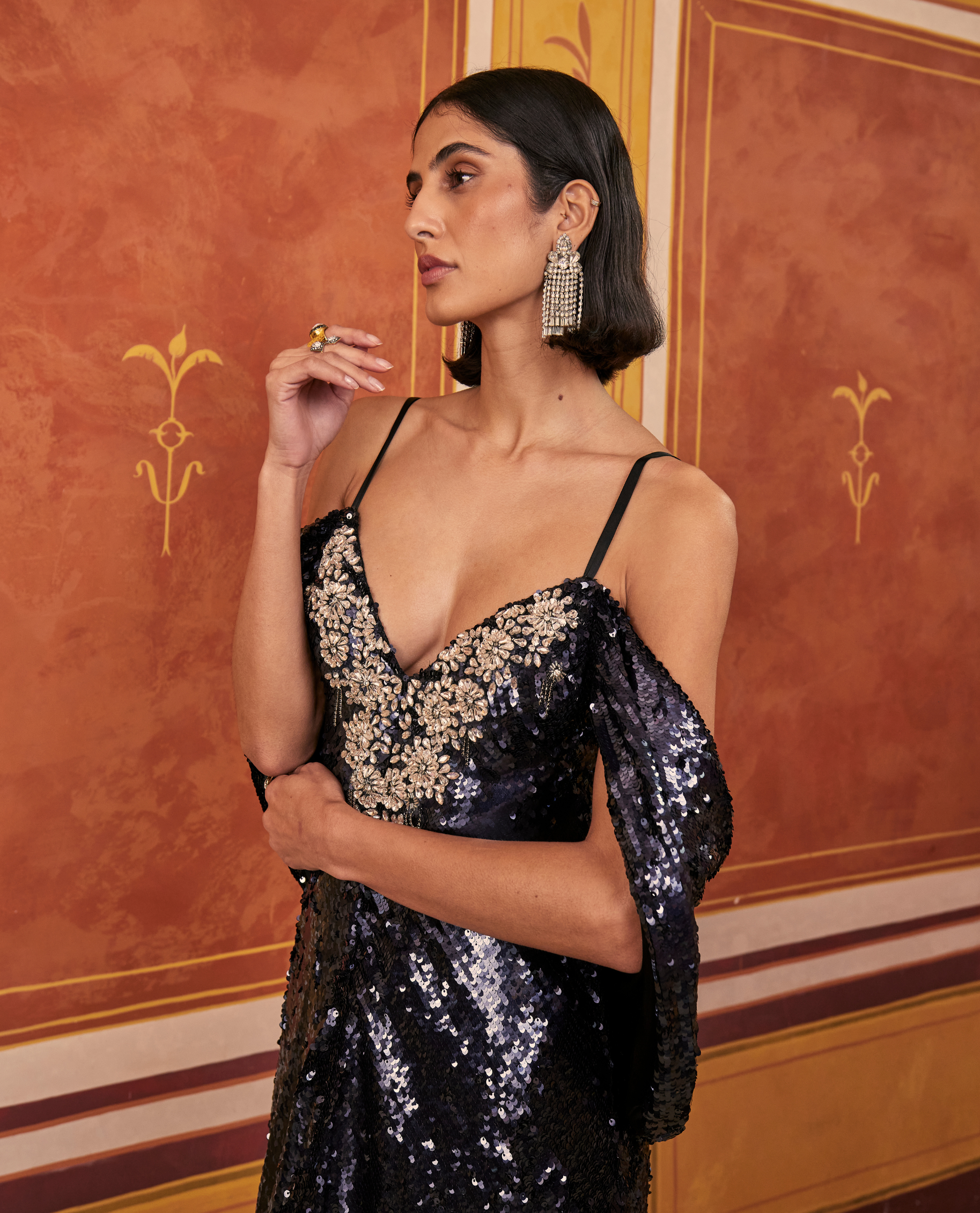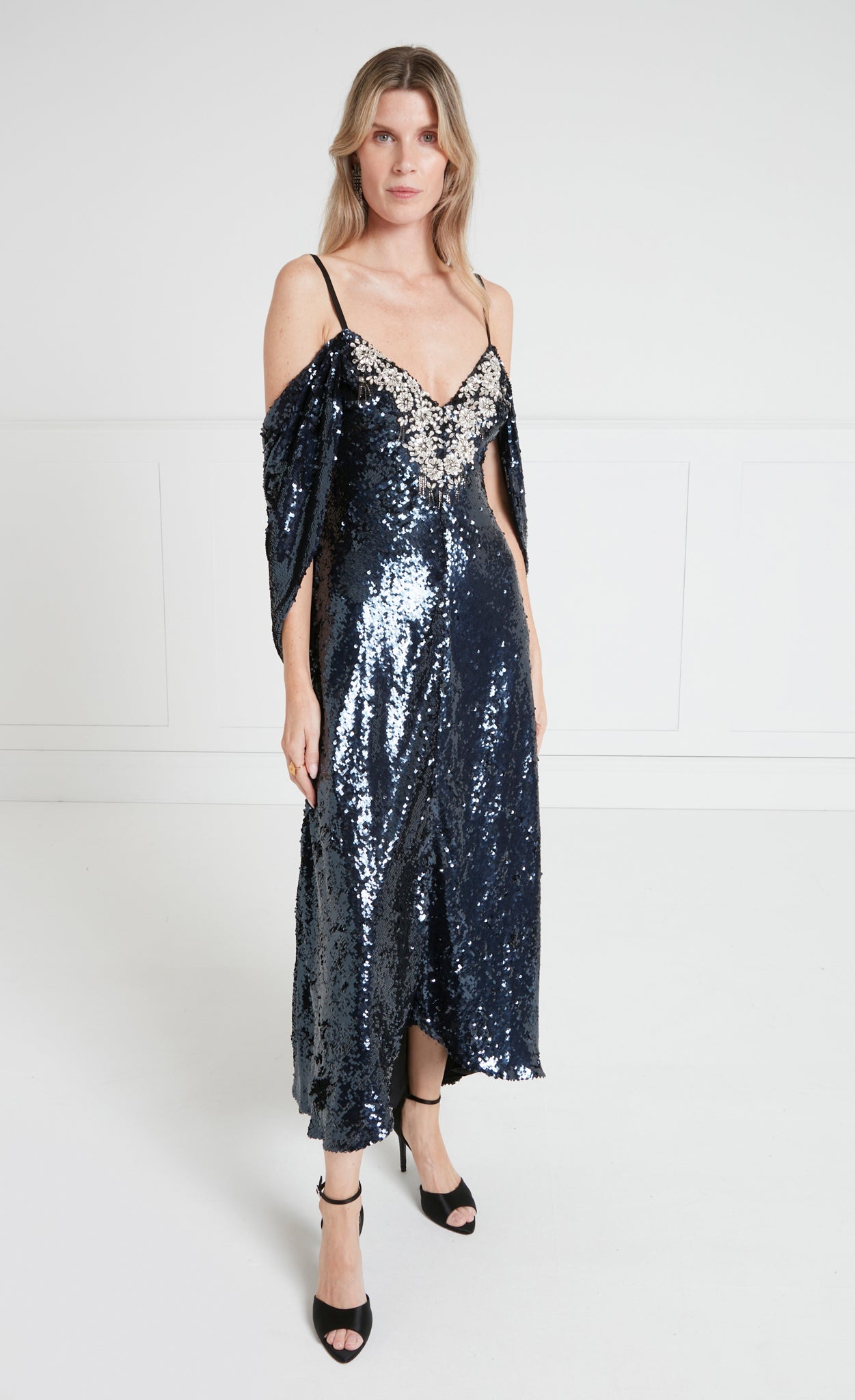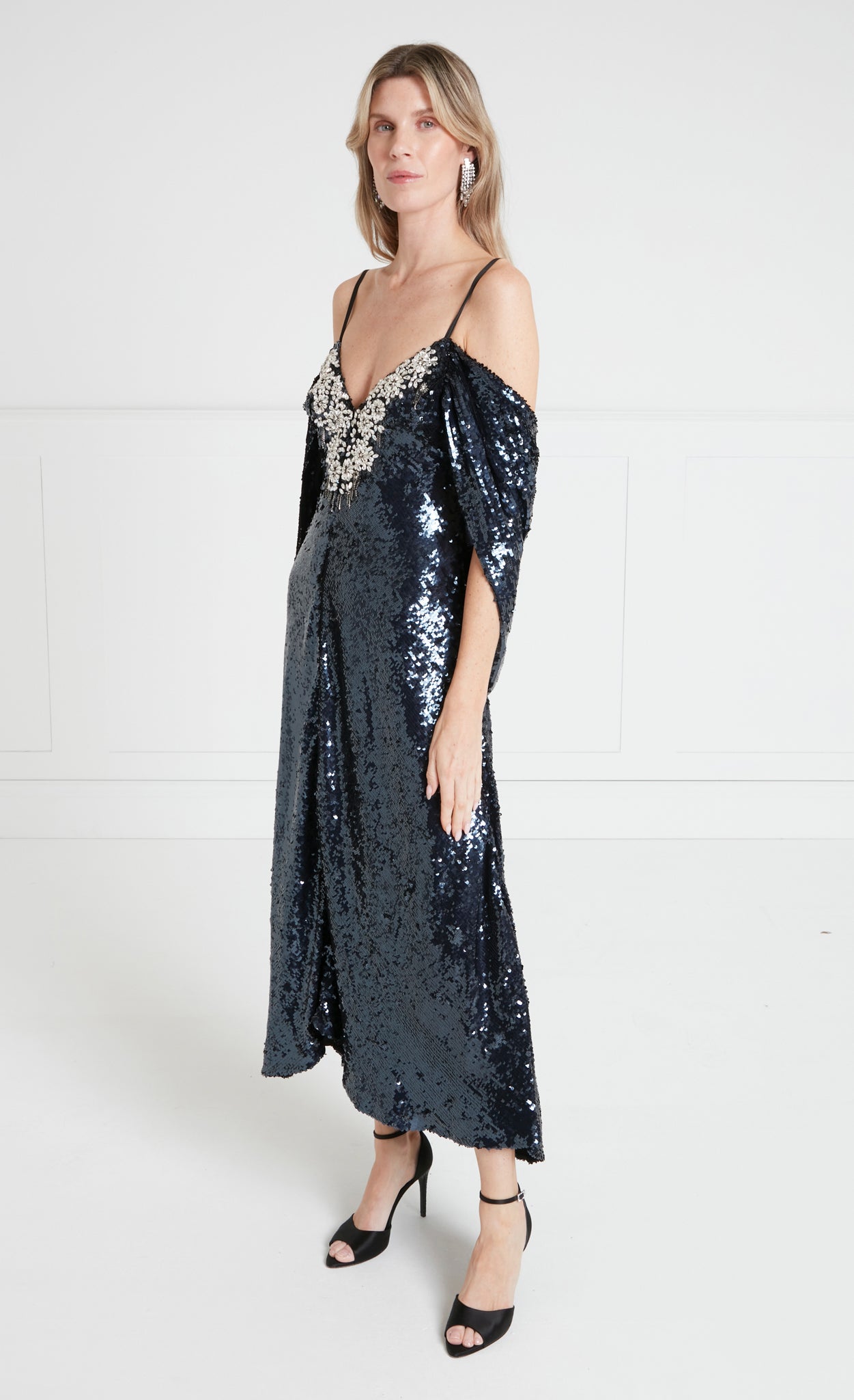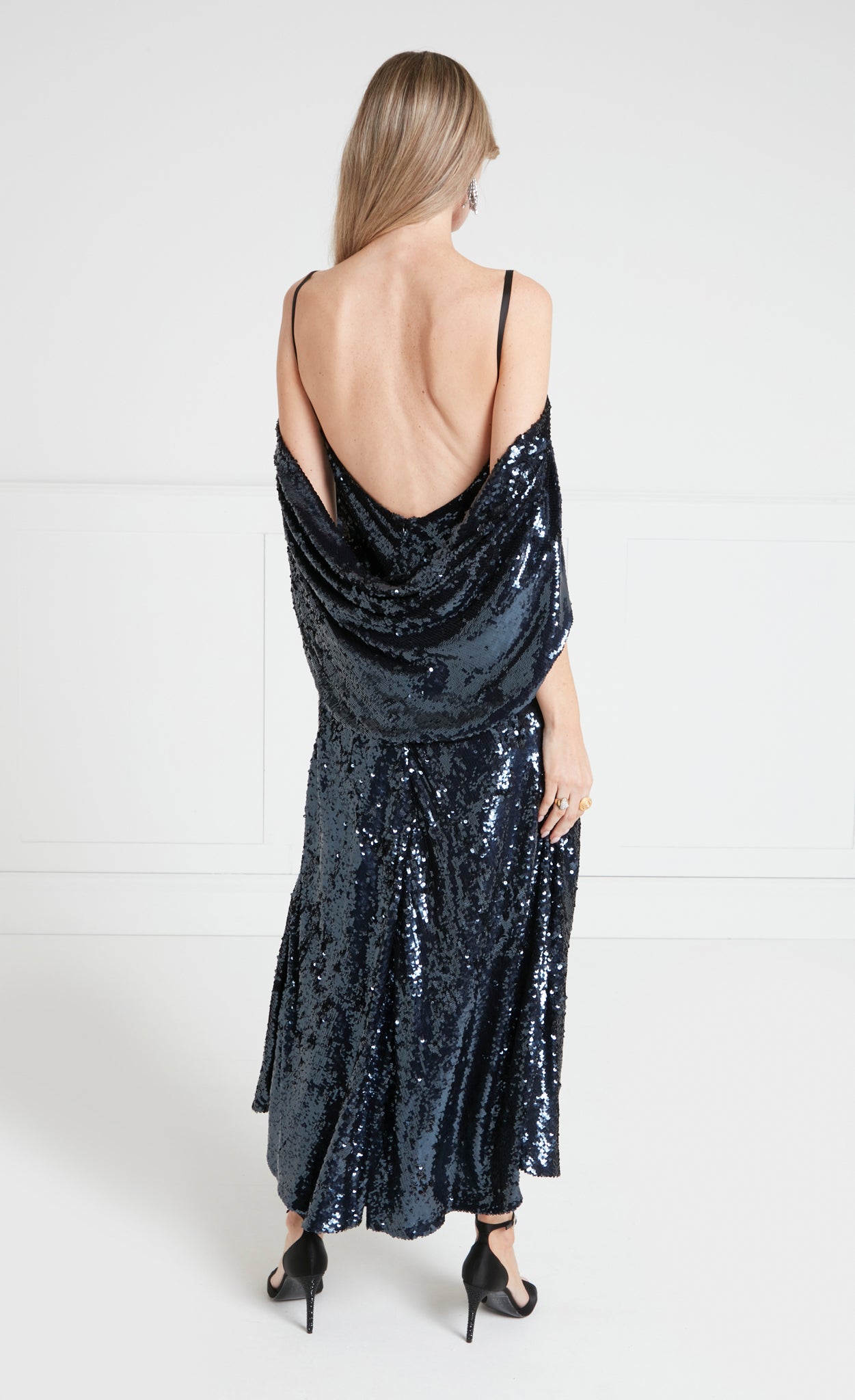 Fully embellished with shimmering sequins, the Salma Strappy Dress is designed with a sleek slip silhouette, elevated by a softly draped cape that cascades over... More.