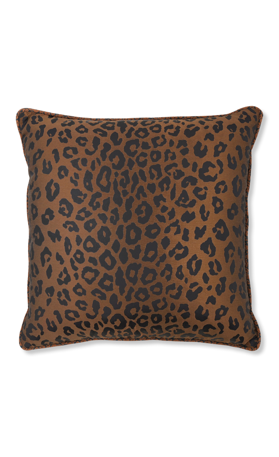 Lustrous spots of leopard embellish this luxurious jacquard weave cushion with a silk-like quality, piped in a playful coordinating leopard braid.