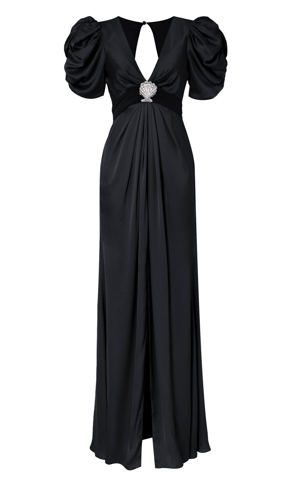 Exude sophisticated glamour in the Sofia Sleeved Gown; a floor-length dress featuring voluminous ruched sleeves for a striking silhouette. The fitted waist is accentuated with a statement crystal-embellished brooch in a Seashell shape.