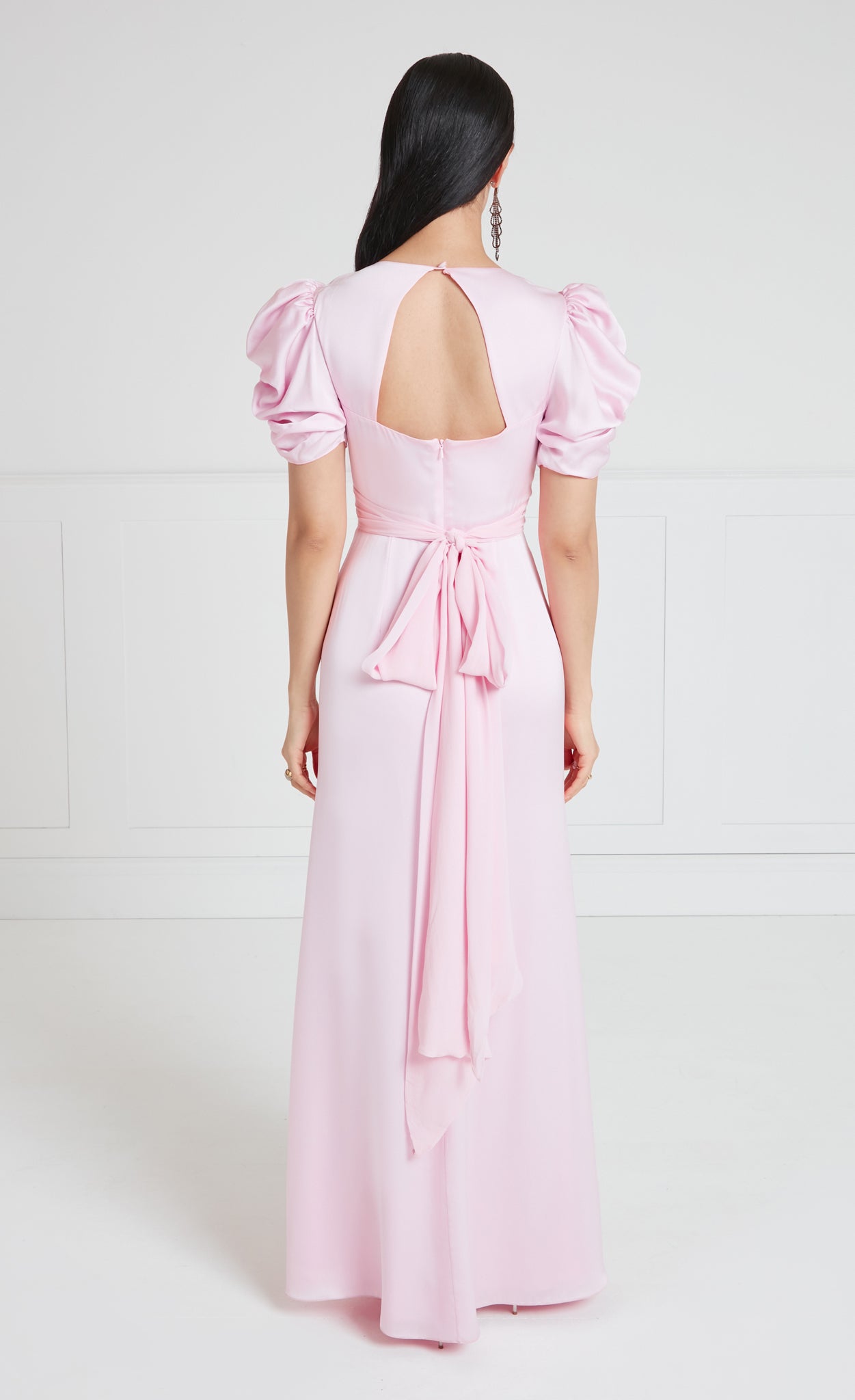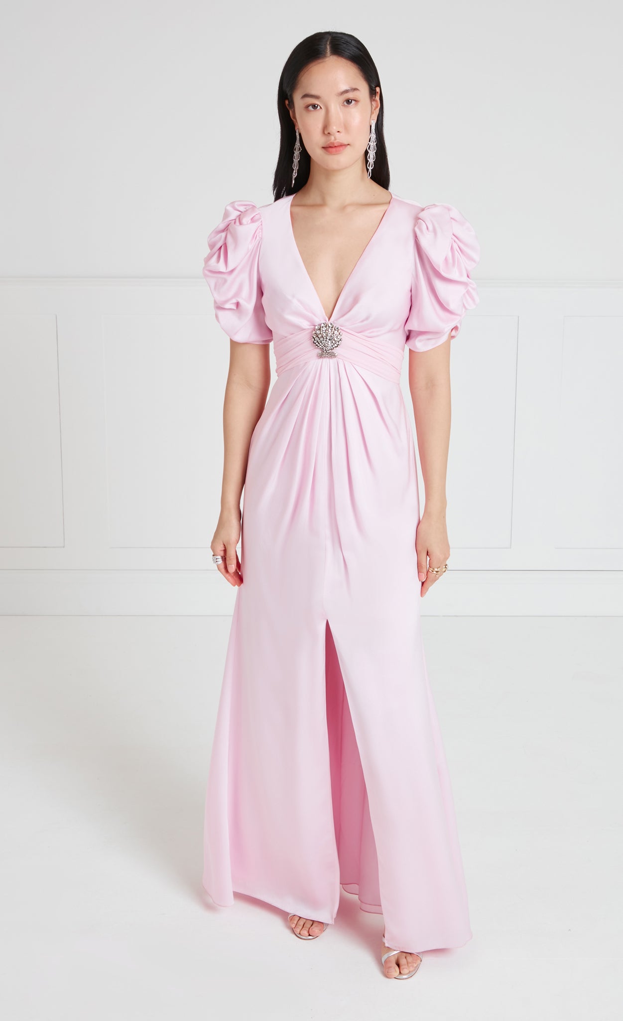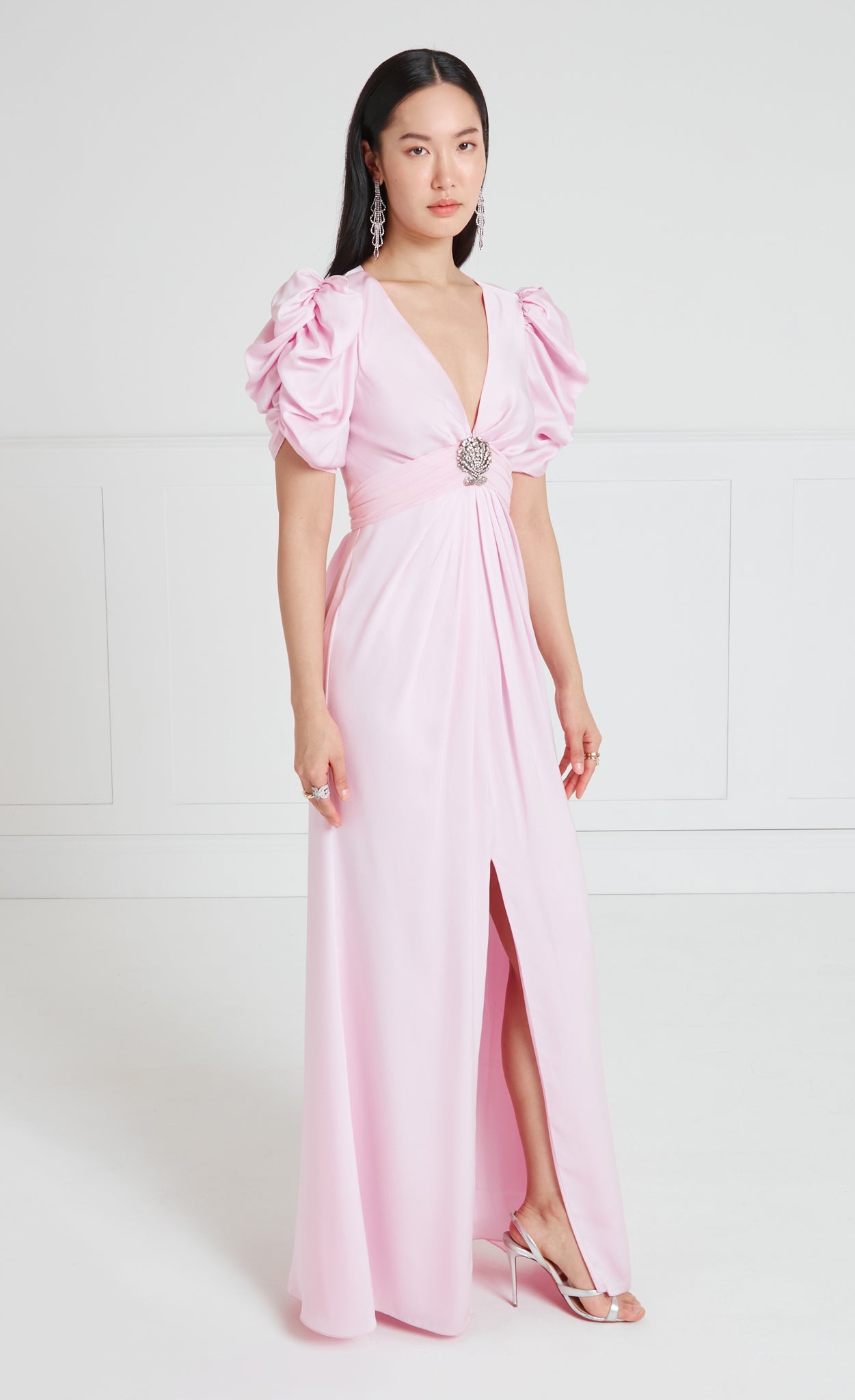 Exude sophisticated glamour in the Sofia Sleeved Gown; a floor-length dress featuring voluminous ruched sleeves for a striking silhouette. The fitted waist is accentuated with... More.
