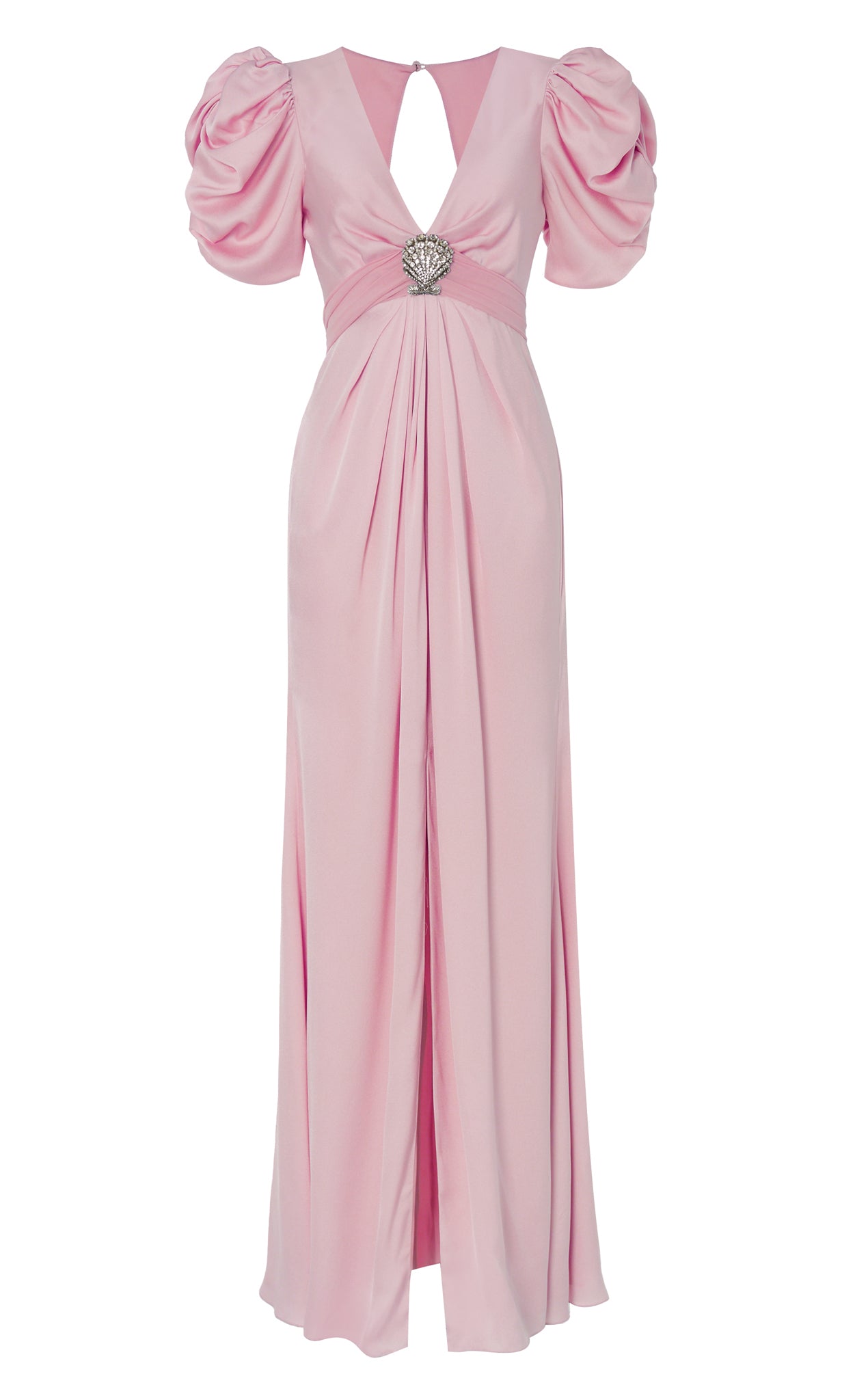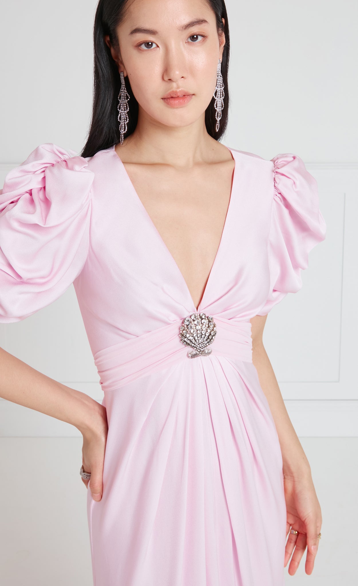 Shot in the stunning Roman Villa at The Newt in Somerset, the Sofia Sleeved Dress boasts a striking sculptural silhouette. The crystal scallop shell brooch pays homage to Botticelli’s Birth of Venus — a symbol of beauty, love, and divine femininity. Also available made to order in our bridal collections, The Cosette Dress.