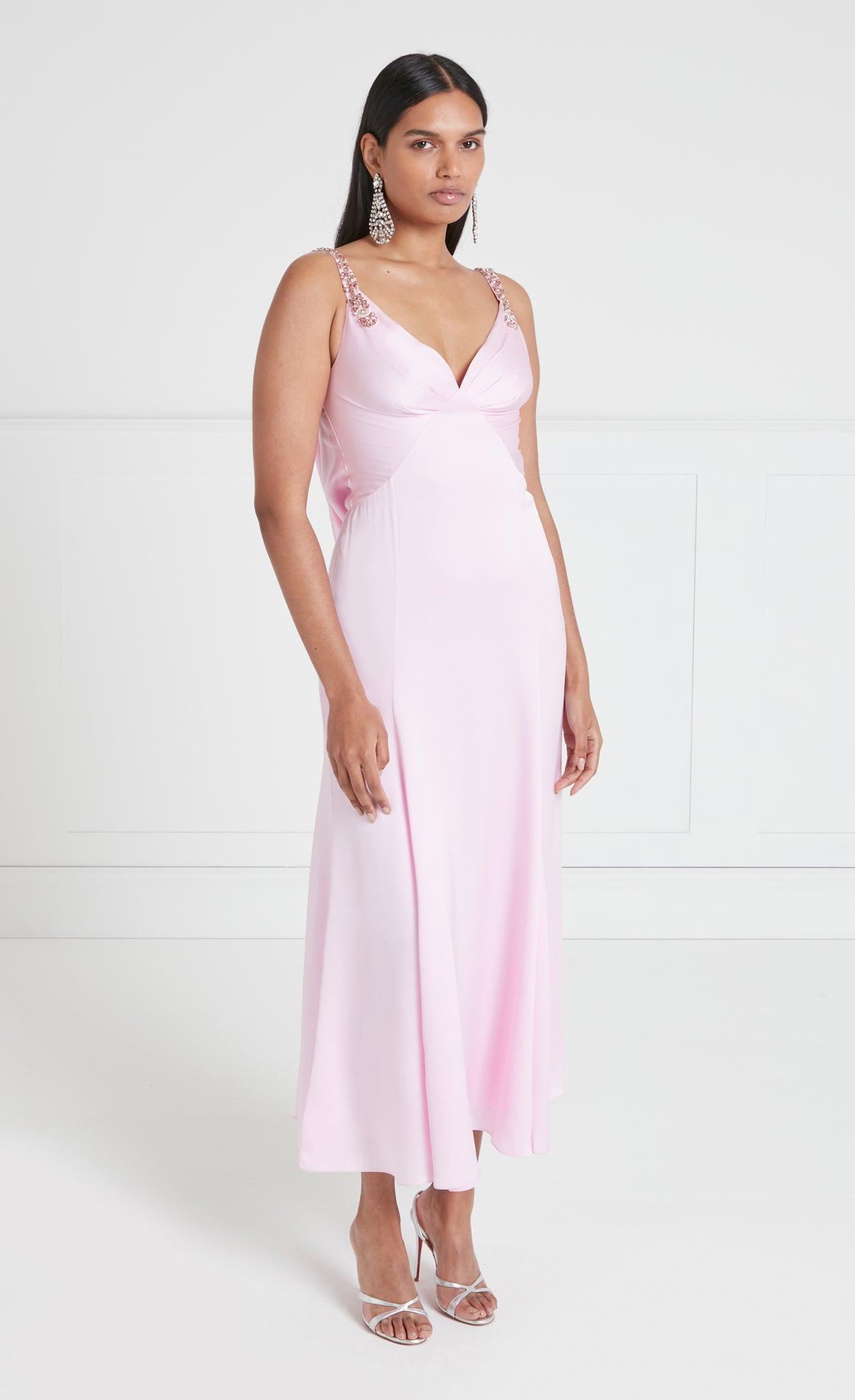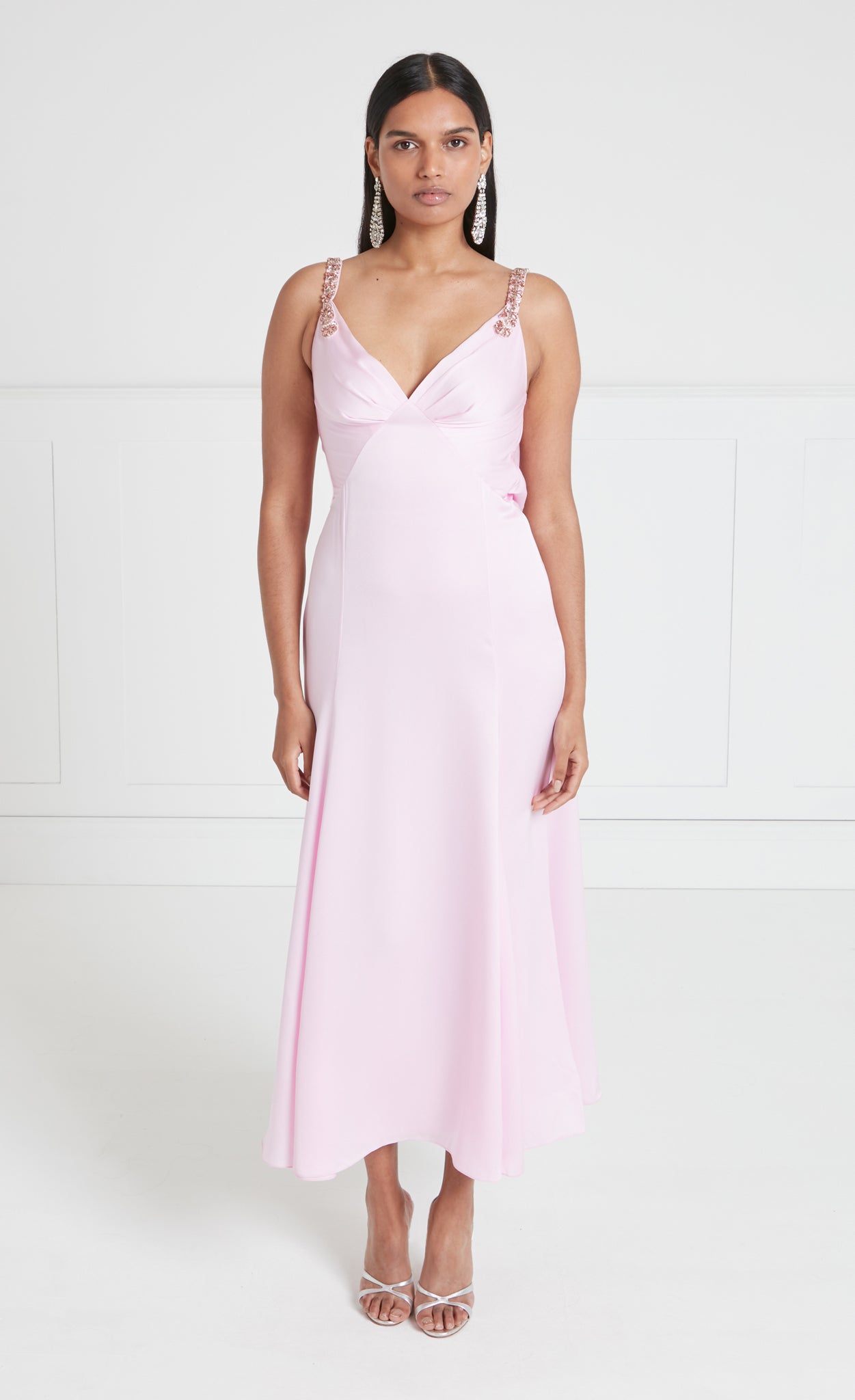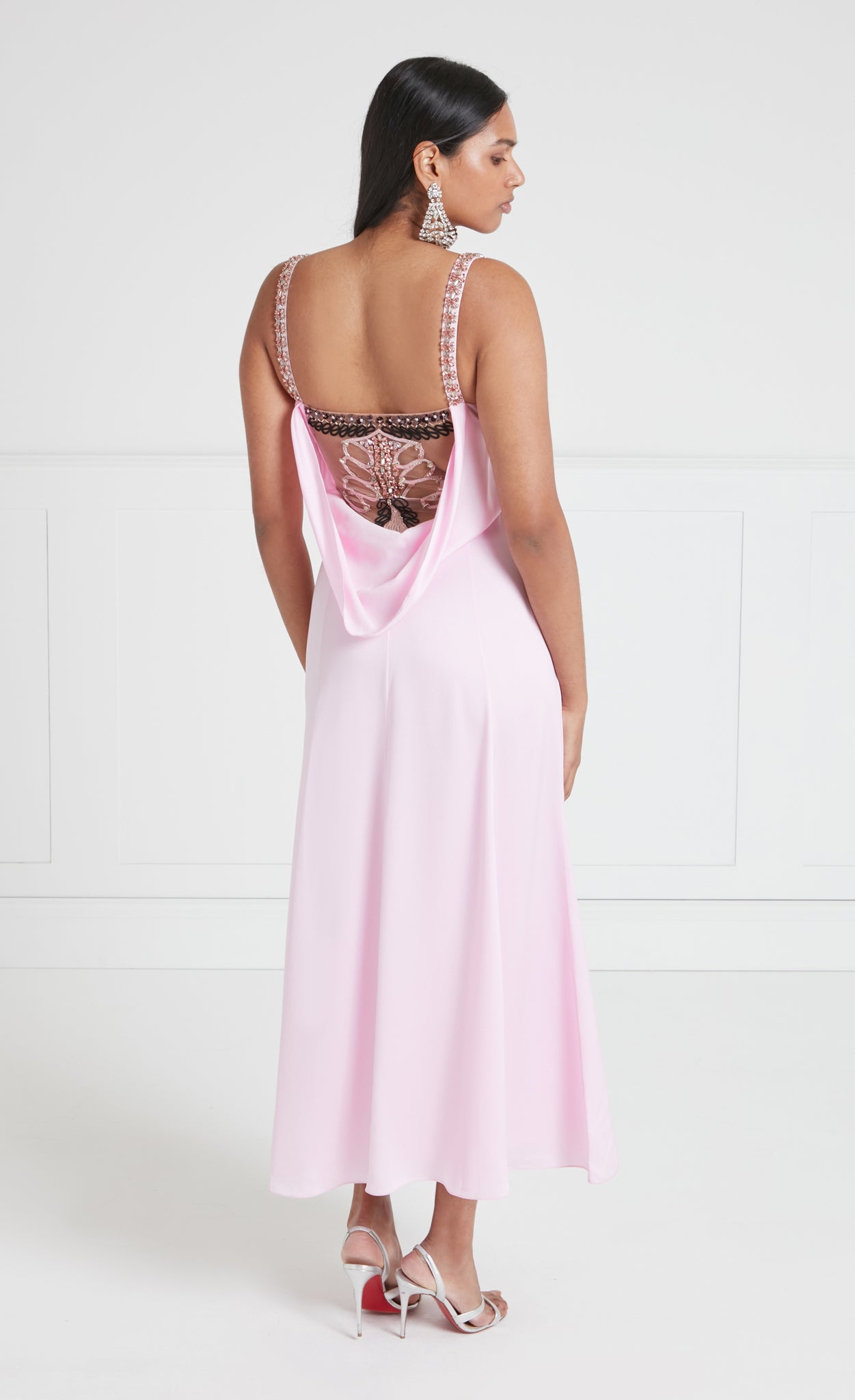 The Sofia Strappy Dress is characterised by its showstopping draped cowl back with a crystal-embellished back panel. Crystal-encrusted straps give way to a lightly fitted bodice and softly flared skirt.