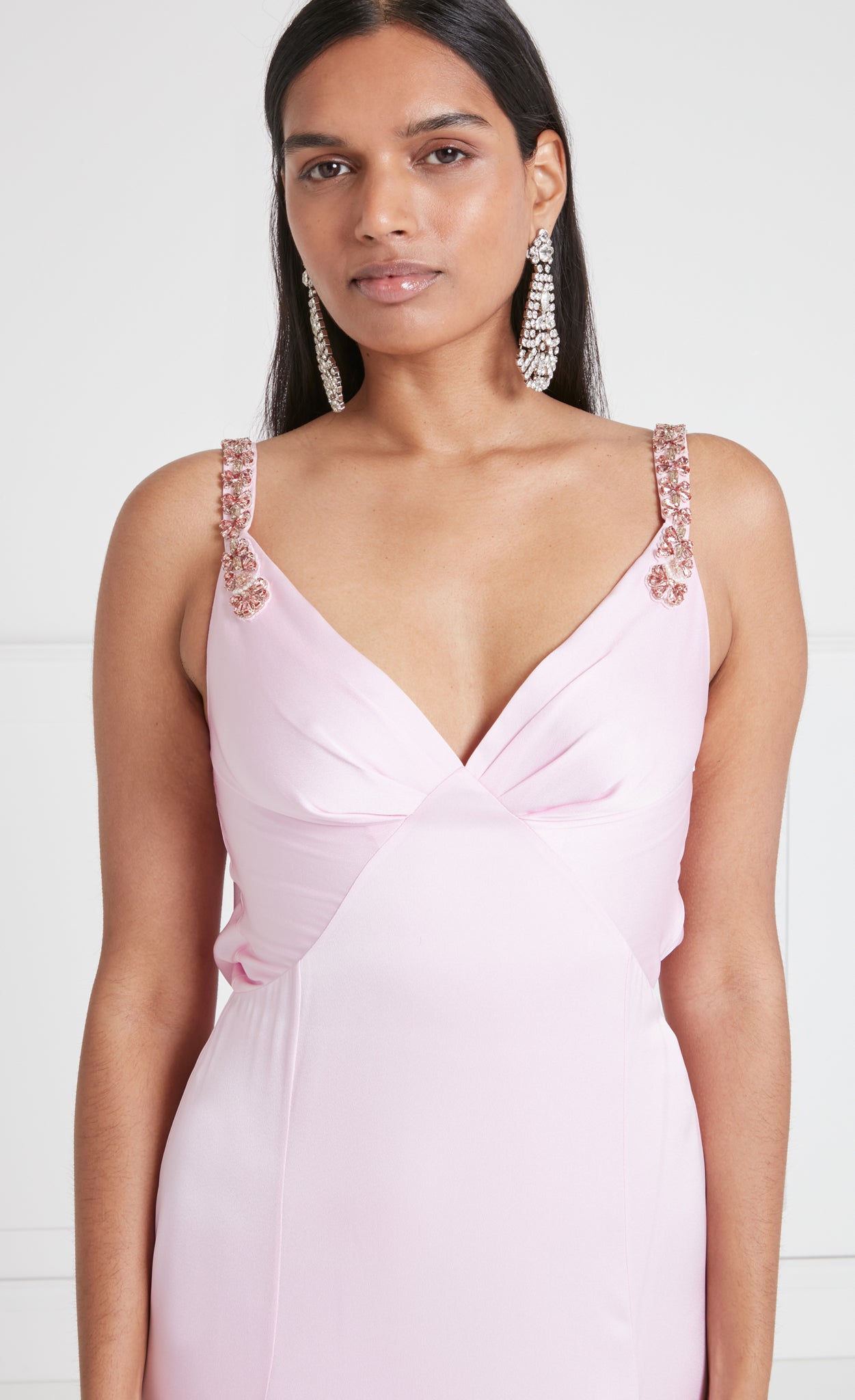The Sofia Strappy Dress is characterised by its showstopping draped cowl back with a crystal-embellished back panel. Crystal-encrusted straps give way to a lightly fitted... More.