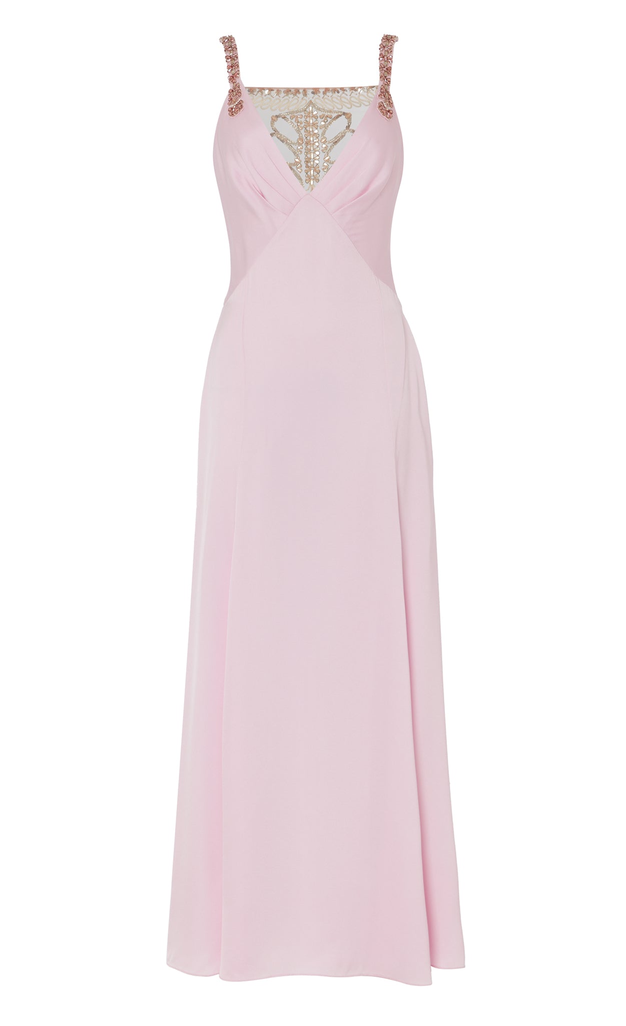 All crystal embellishment is meticulously hand-sewn by skilled artisans for refined craftsmanship. The glossy crepe satin drapes fluidly with a soft, velvety feel.